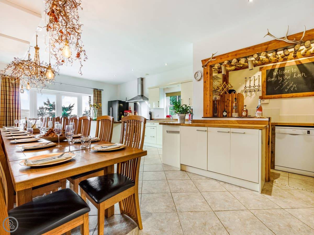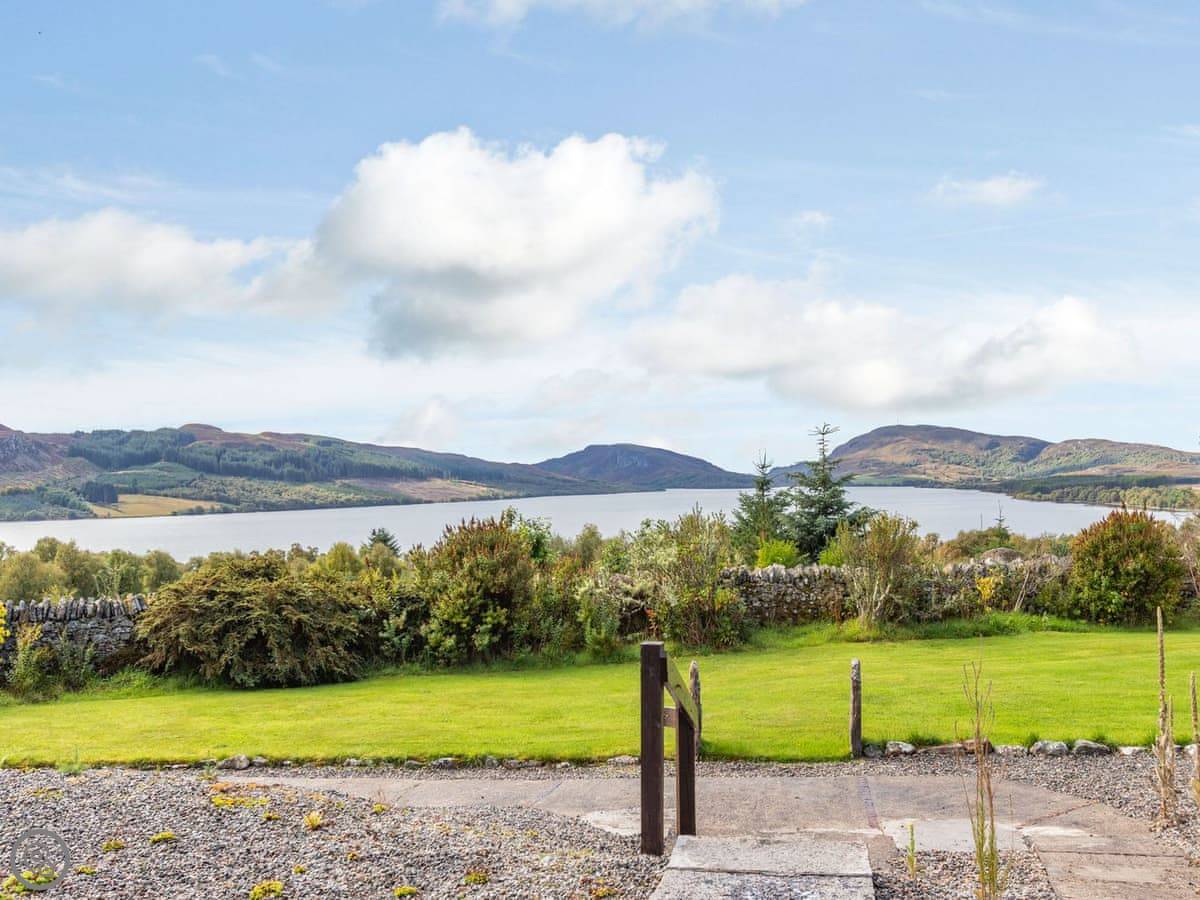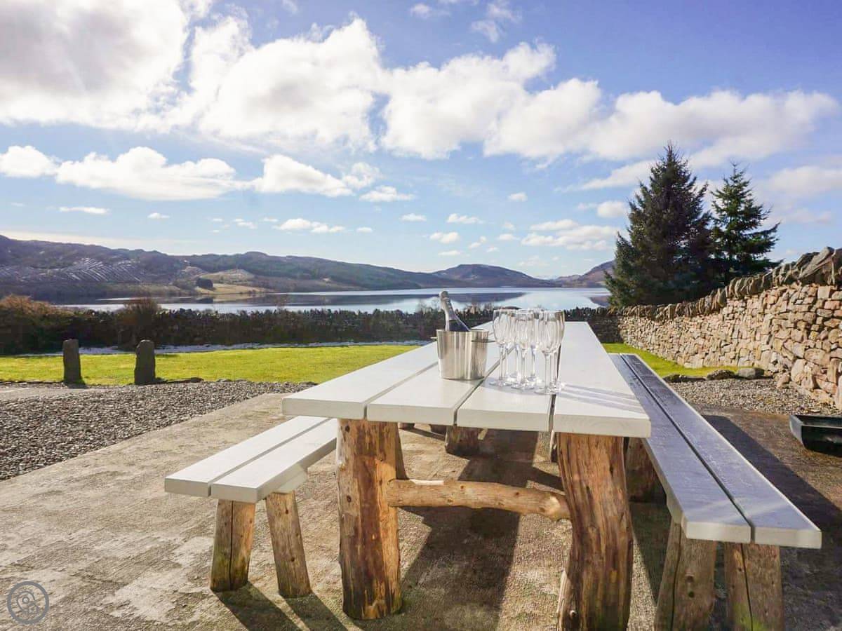 Outside, there's a big patio with a large dining table and a charcoal barbecue. The lawn has a stone wall and looks over the loch.