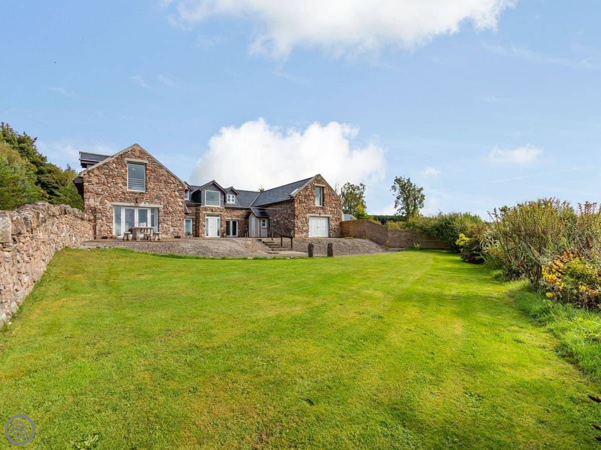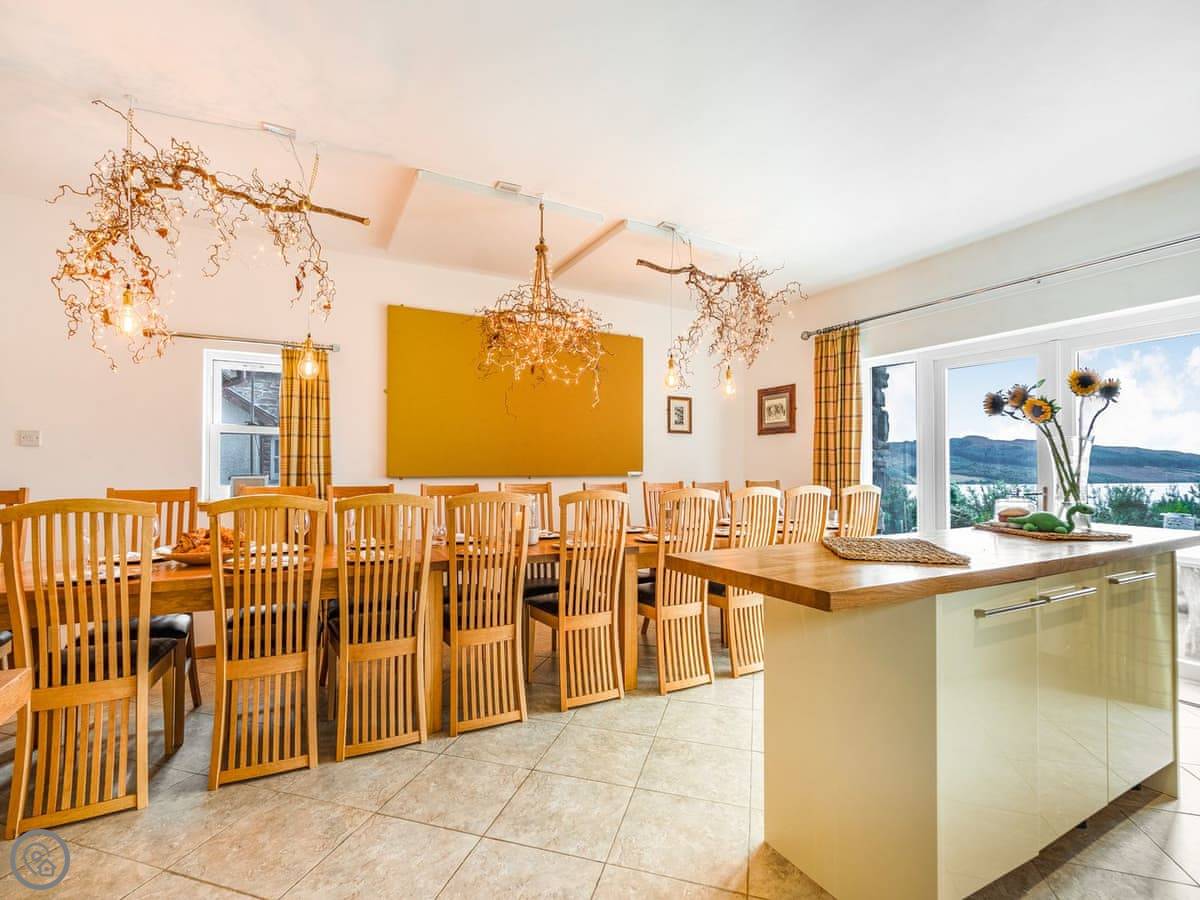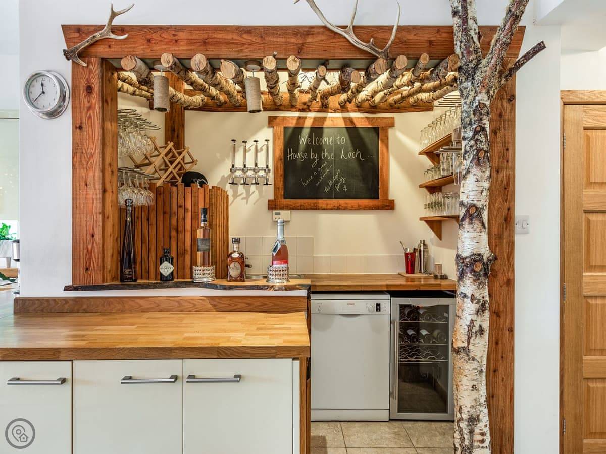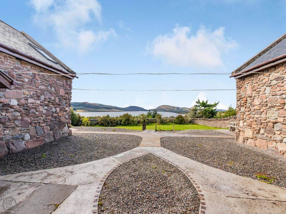 Outside, there's a big patio with a large dining table and a charcoal barbecue. The lawn has a stone wall and looks over the loch.