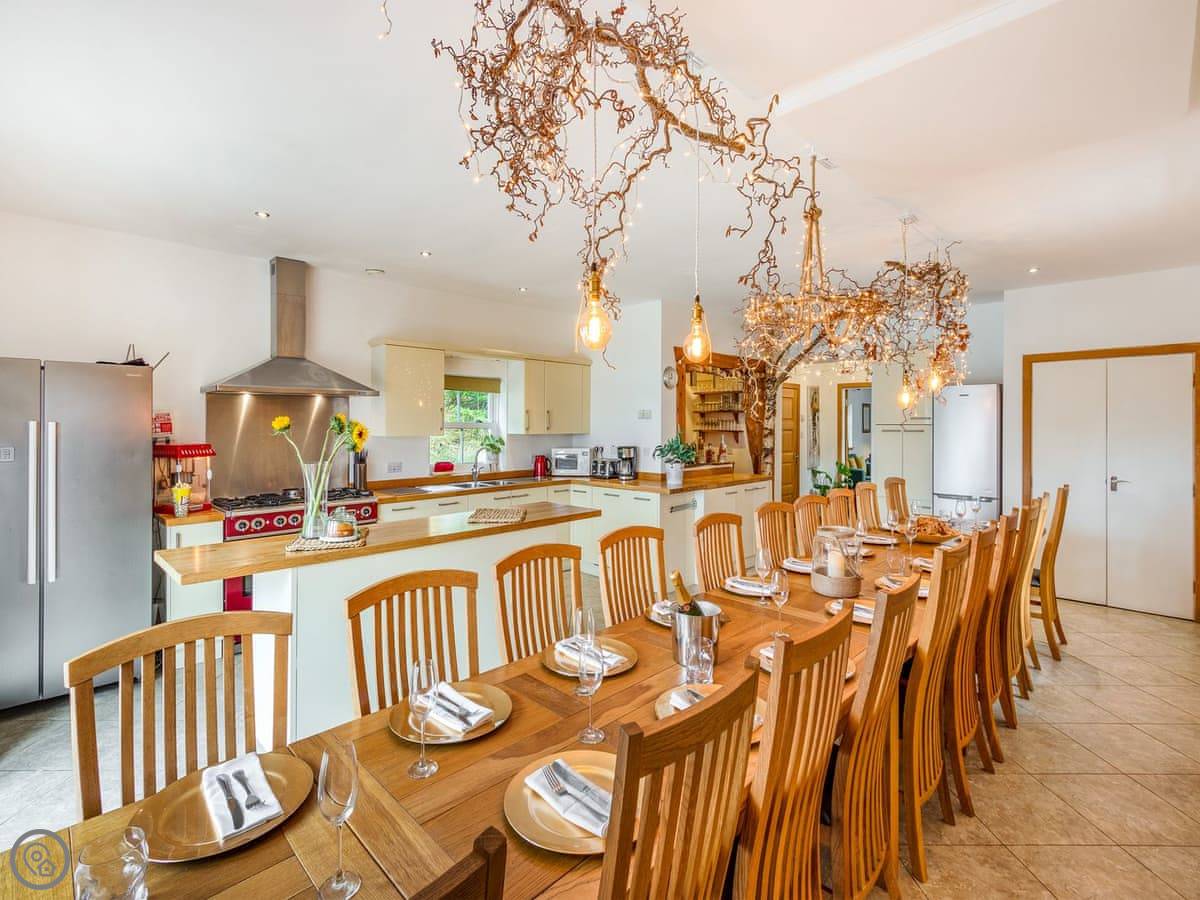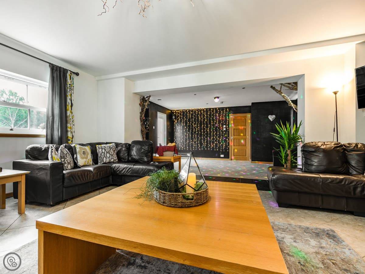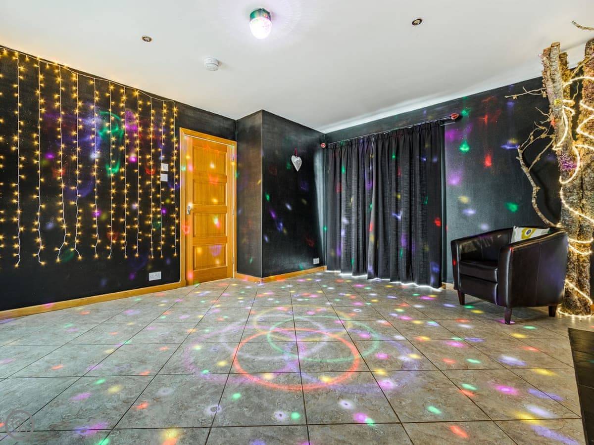The layout is unusual. You come in through the front door into a sort of disco room. It has fairy lights, trees, a disco ball. The coffee table turns into a poker table. Then there's a cosy lounge area off that, and a very large open-plan kitchen and dining room with a bar. The dining table seats twenty. Doors lead out to the patio.