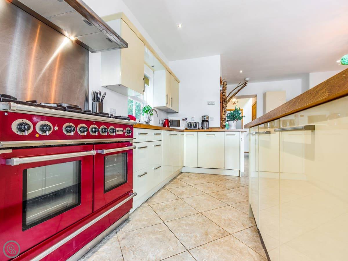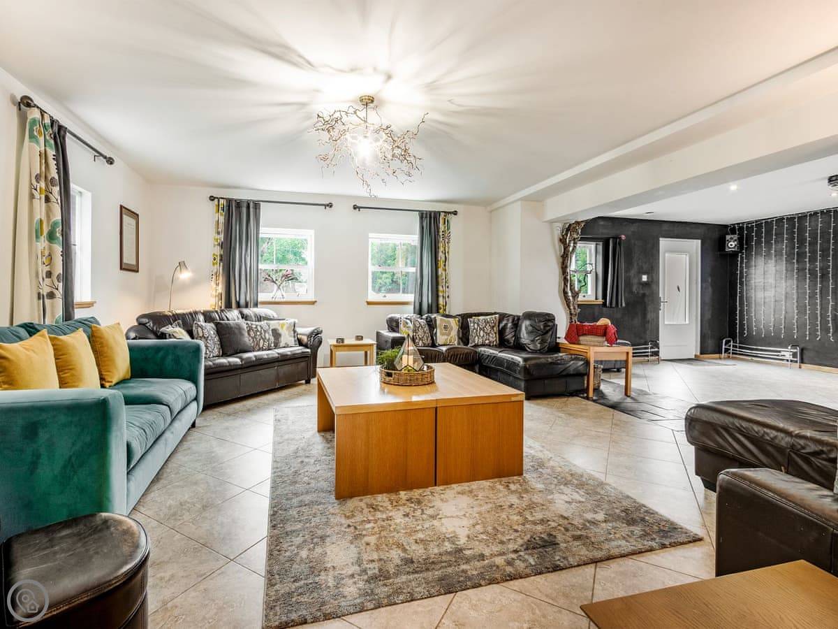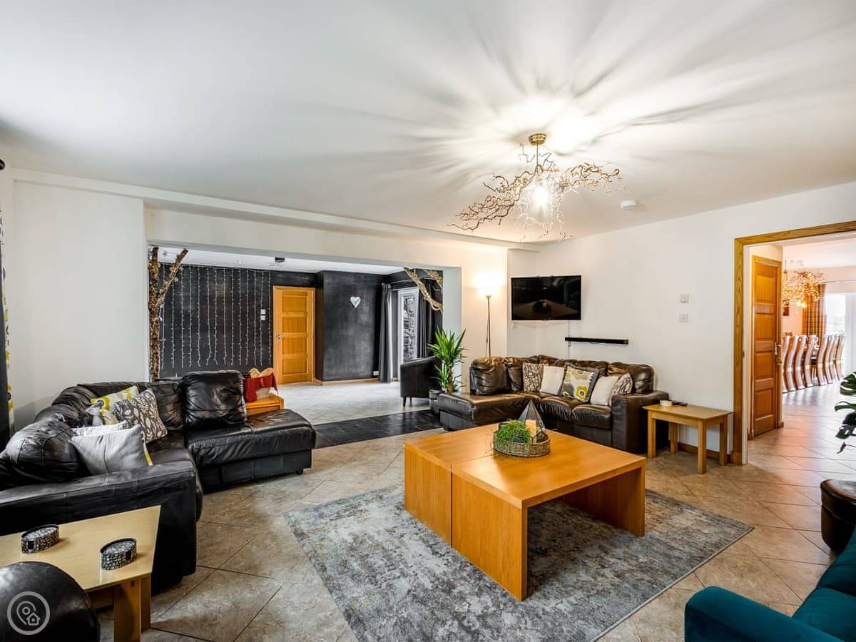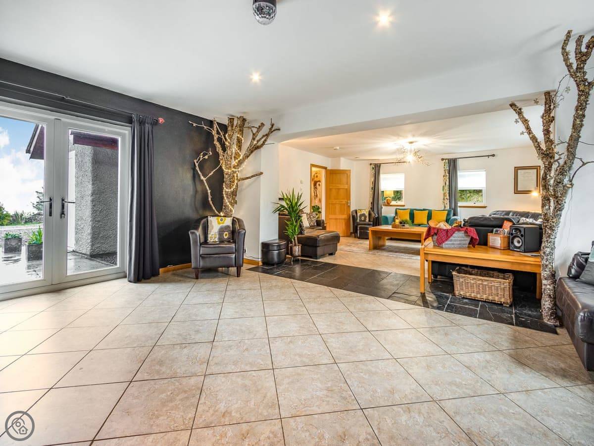 The layout is unusual. You come in through the front door into a sort of disco room. It has fairy lights, trees, a disco ball. The coffee table turns into a poker table. Then there's a cosy lounge area off that, and a very large open-plan kitchen and dining room with a bar. The dining table seats twenty. Doors lead out to the patio.