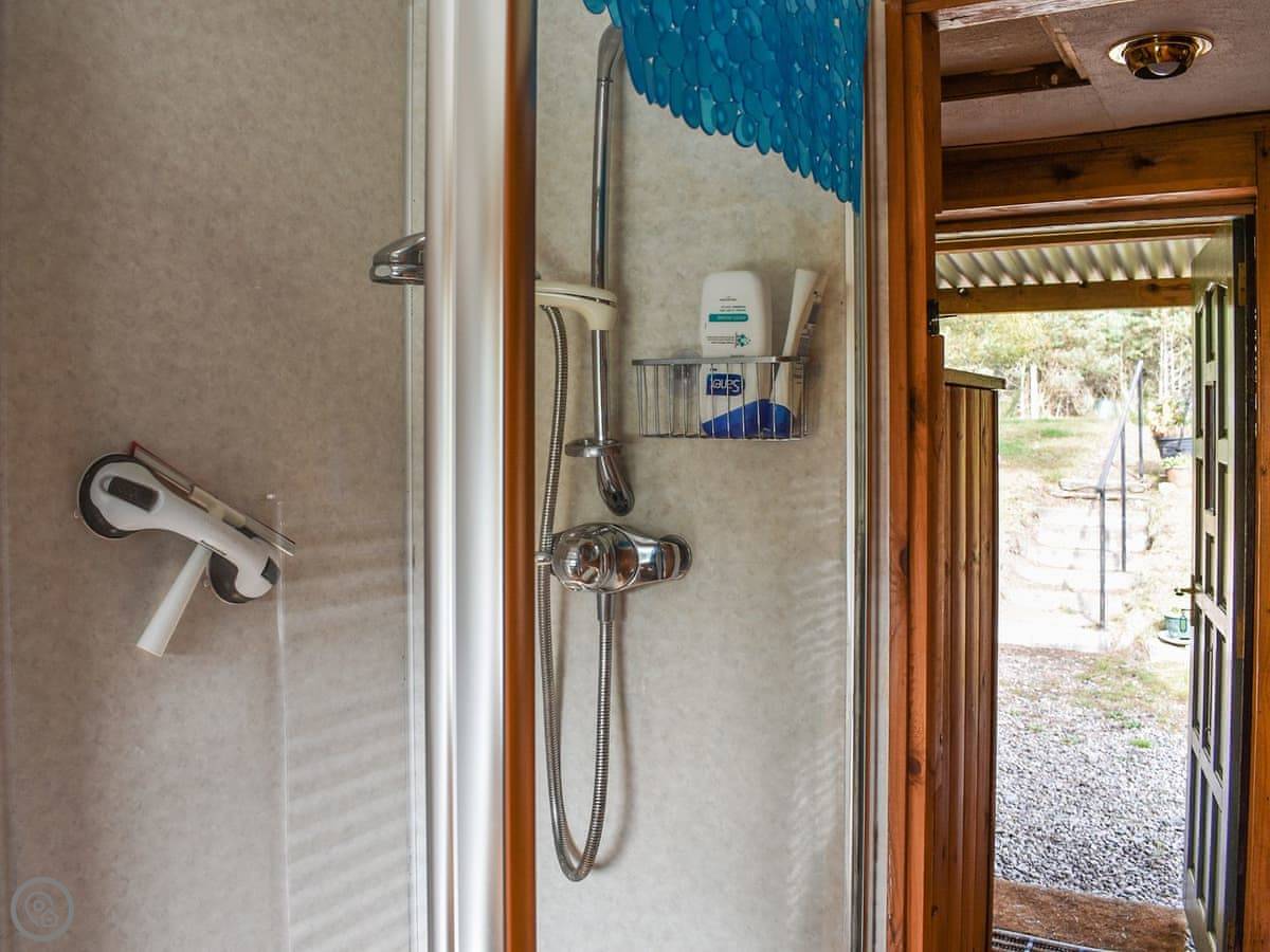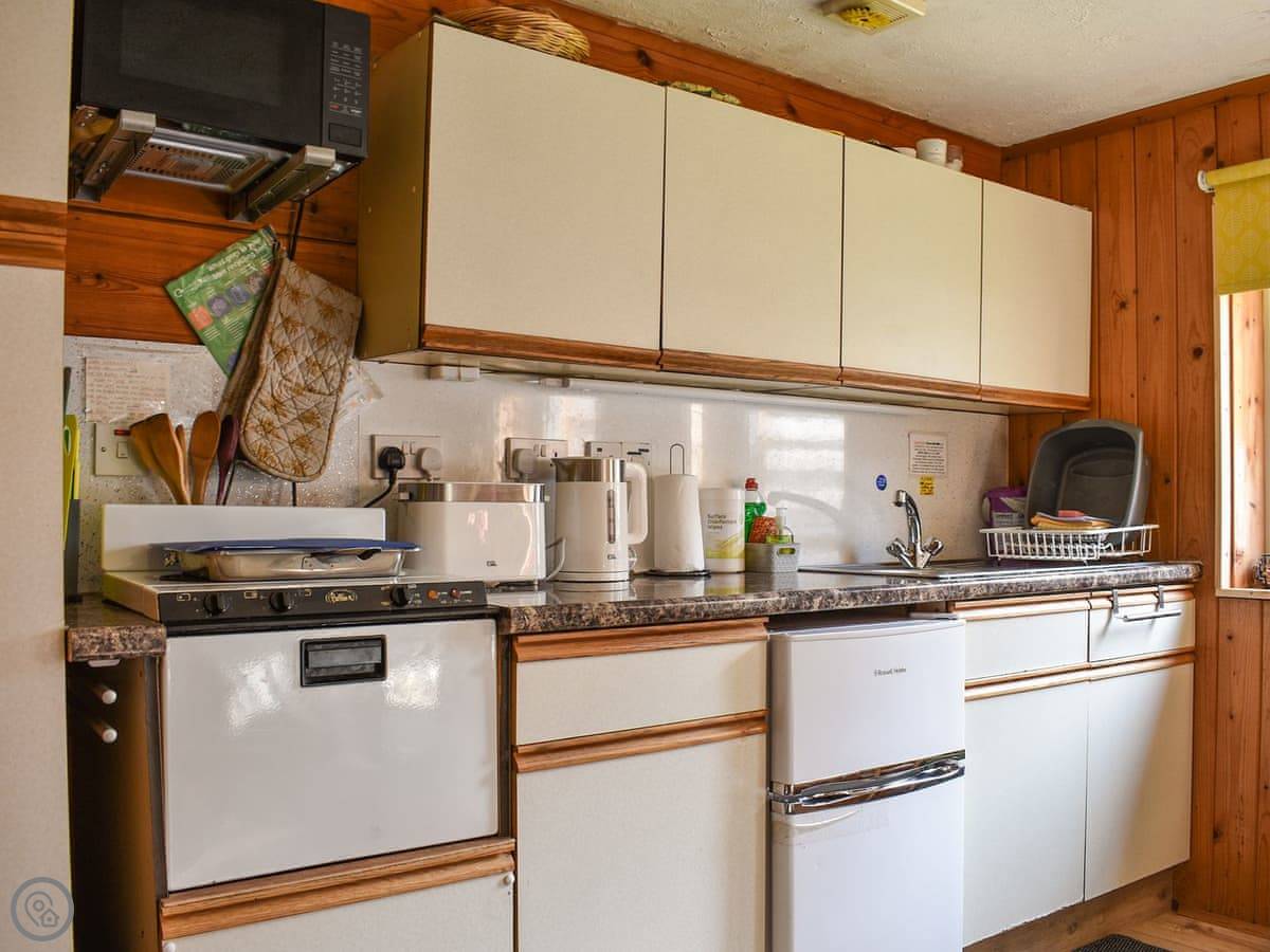 It sleeps two, in one bedroom. The bed splits into two singles if you need it. There's a bathroom with a shower. The main room is open plan, with the kitchen at one end and the living space at the other. It's all on the ground floor and is wheelchair accessible, with grab rails.