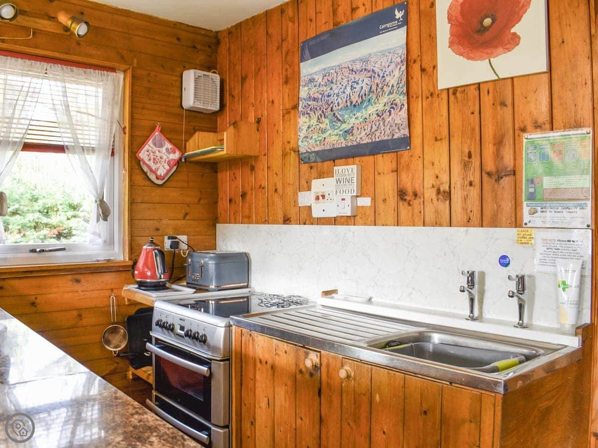 Inside, the main room is open plan with a kitchen and living area. The wood burner is good. There's a TV with Freesat, and a DVD player. The kitchen has a microwave, washing machine, and a tumble dryer.