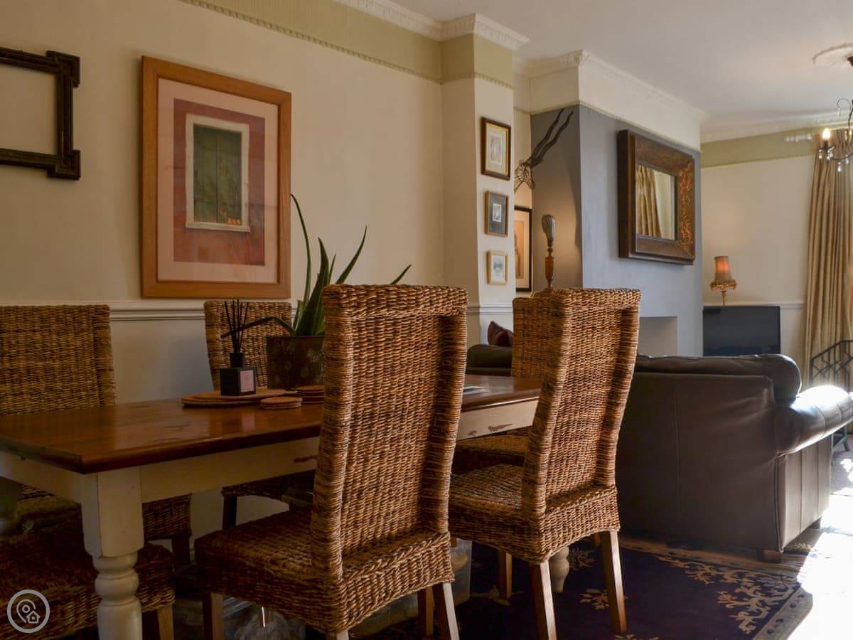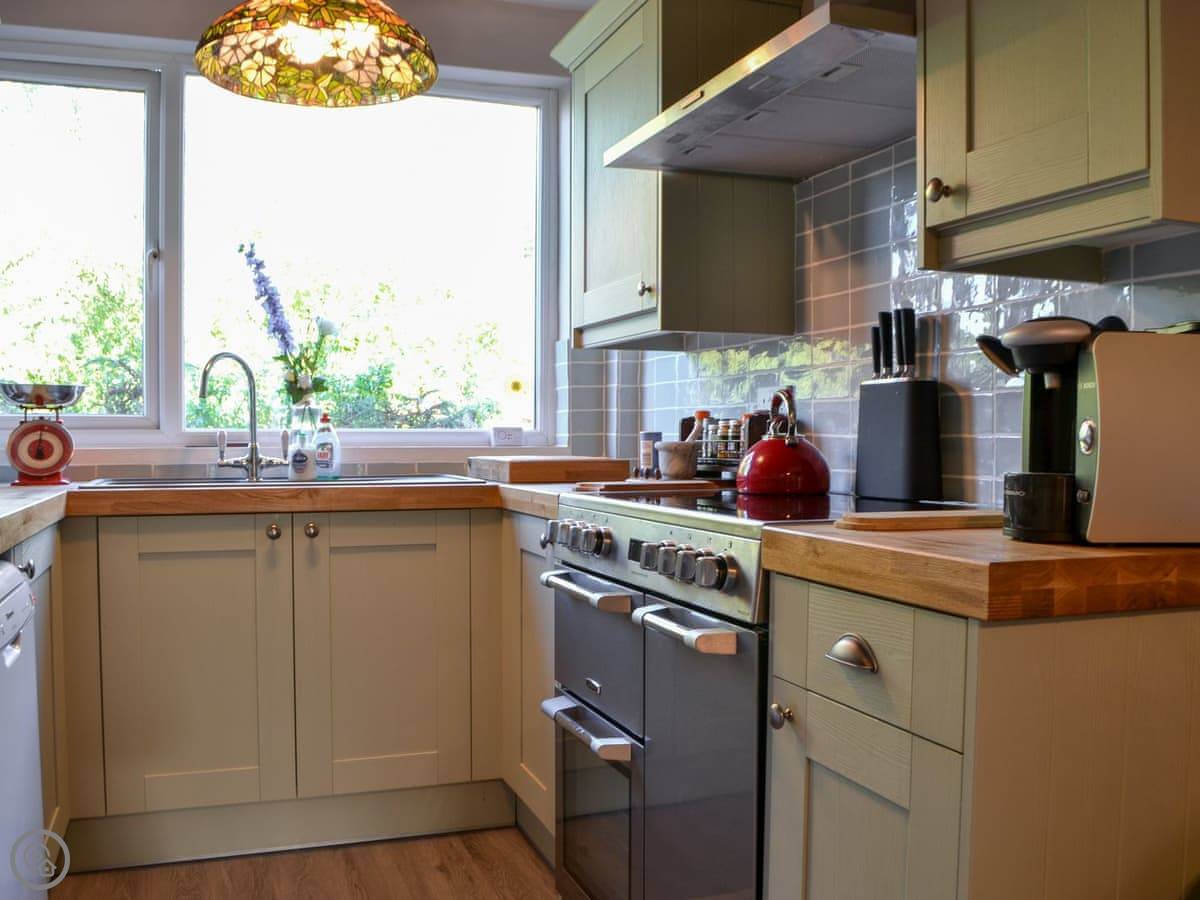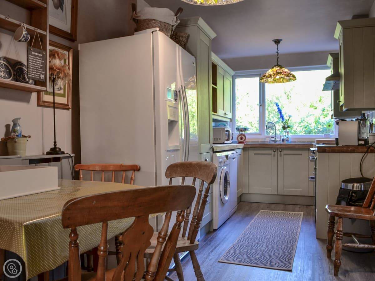 The ground floor features an open plan living area and dining room with plenty of easy seating and Freesat TV and Netflix, perfect for movie night in front of the fire after a day of adventure. The kitchen features a range cooker, dishwasher and washing machine, at the back you have a small yard and a spacious off-set garden with lawn, patio and garden furniture; It’s ideal for dining al fresco and enjoying the peaceful garden and greenery at the rear. It is a great sun trap and ideal for a cold beer or a glass of wine while soaking up the sunshine.