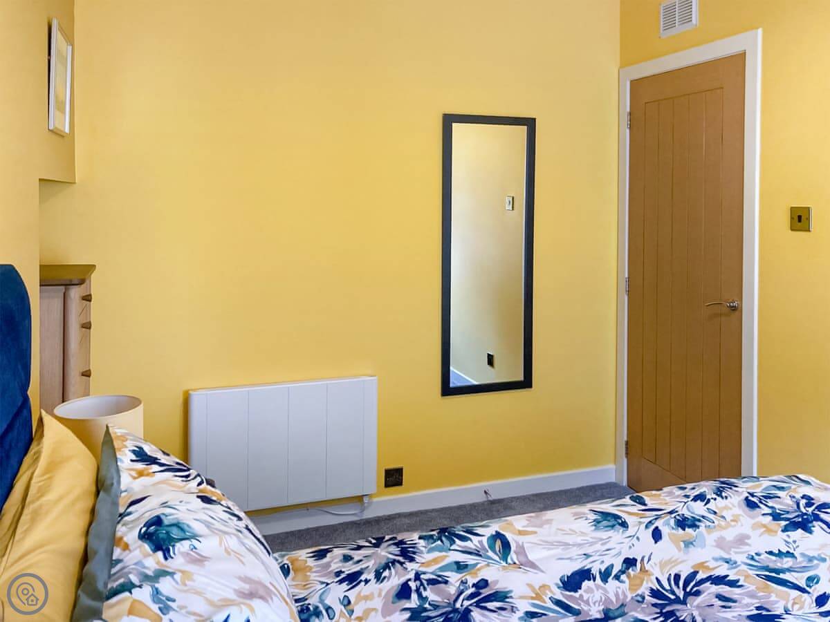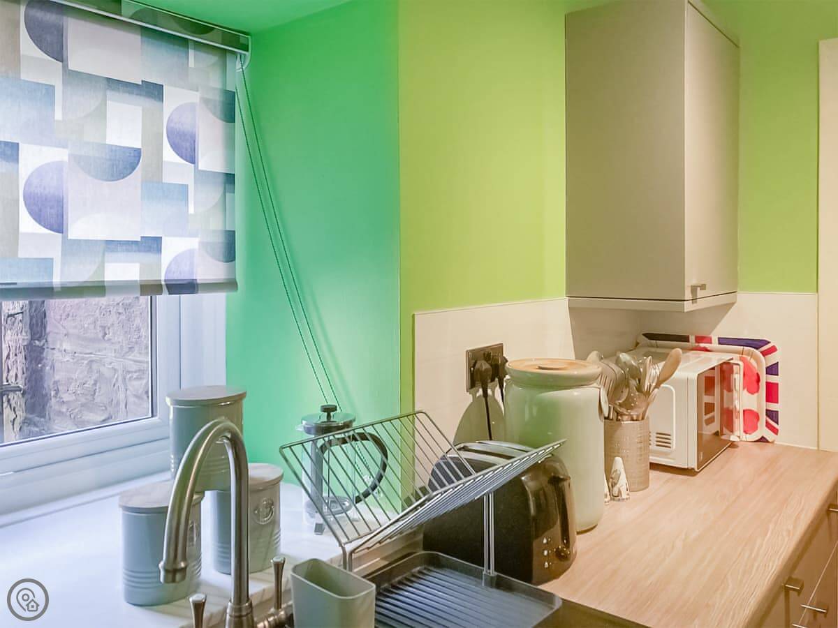 The flat itself is compact. The kitchen is small but has what you need. The shower is good. The bed is a double with a new mattress. There's a washing machine. You can park on the street outside.