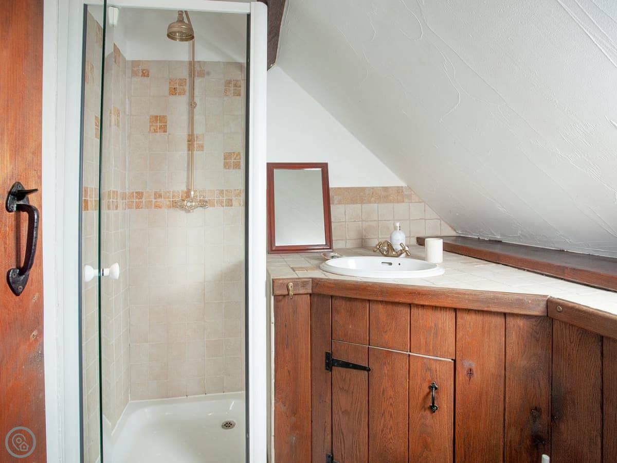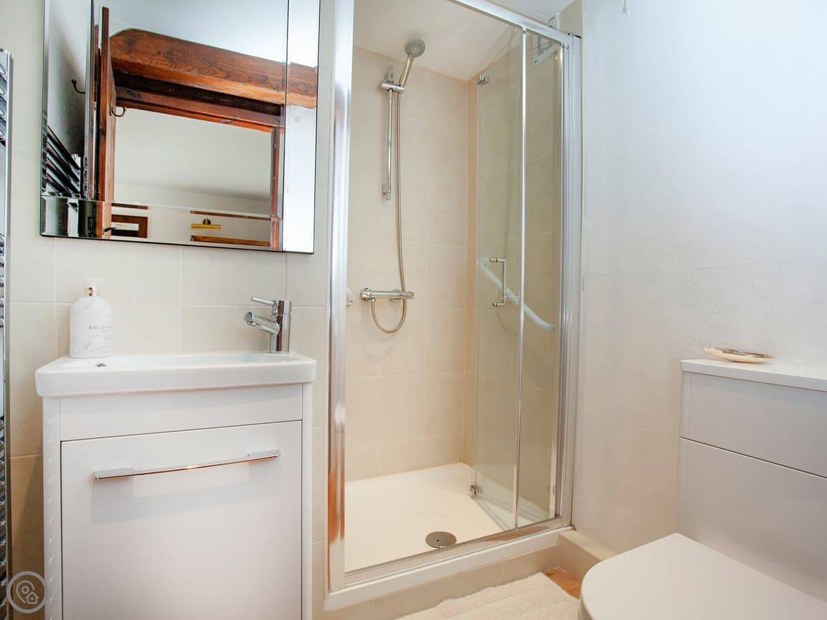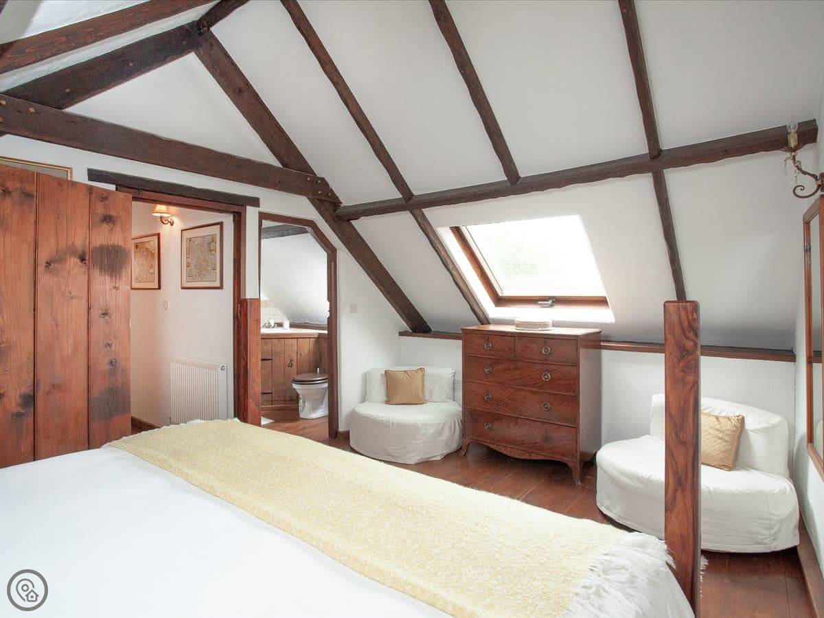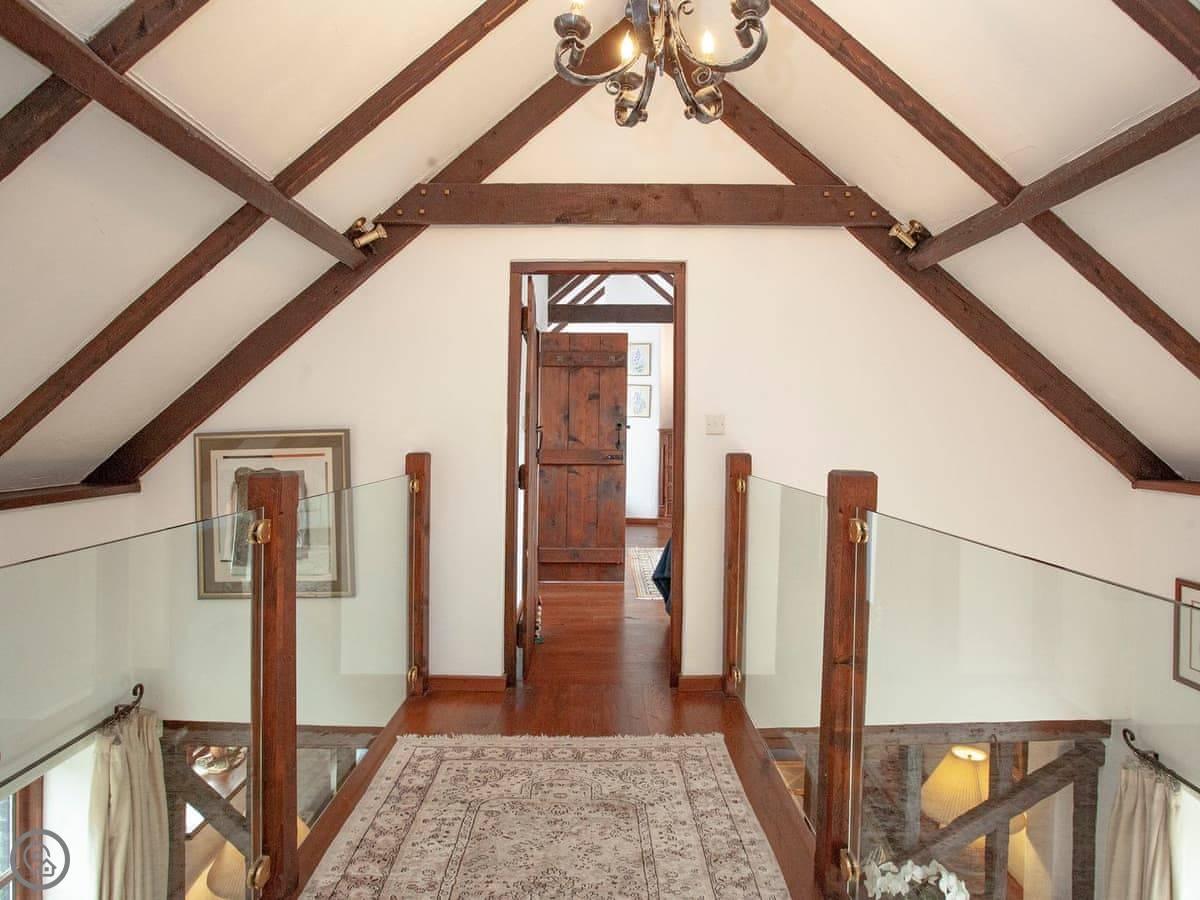 It sleeps seven people. There are three bedrooms and each one has its own bathroom. That's handy. It's got a 4 Star rating. It's comfortable, but it's still a barn. The ground floor bedroom is off the kitchen, and the other two are upstairs.