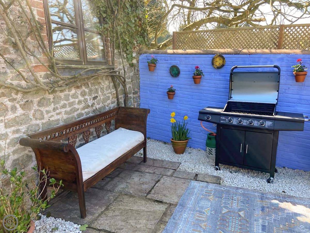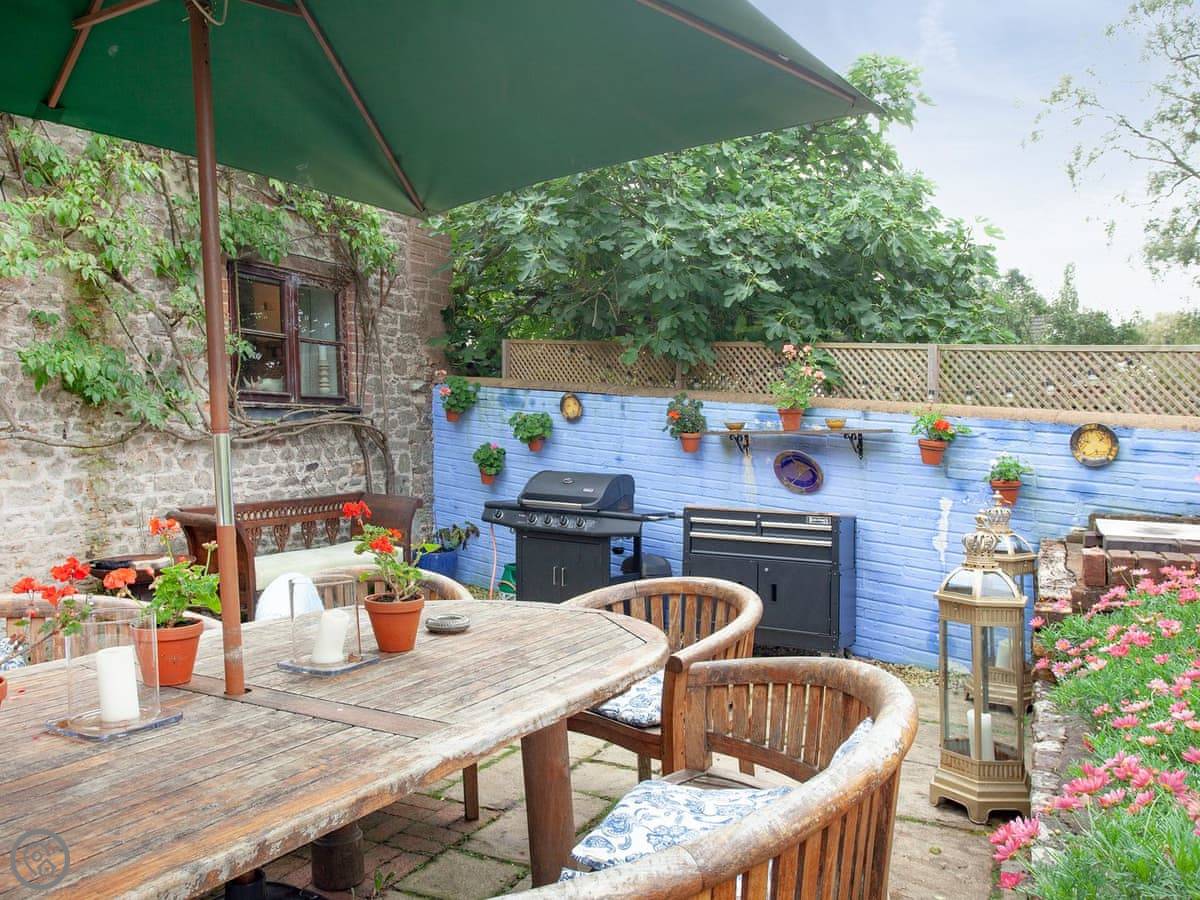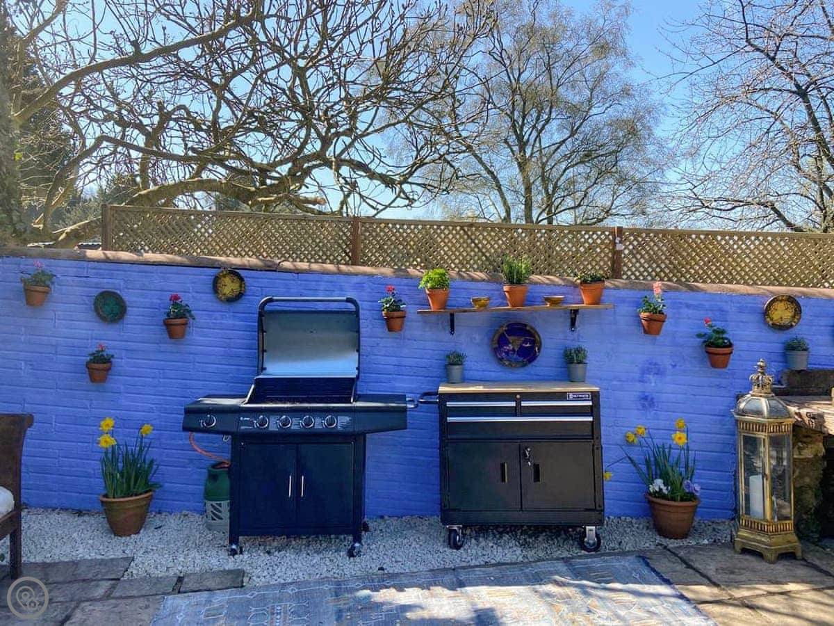 The garden is fully enclosed. It's got a big lawn, a patio, a barbecue, and a fire pit. There's a bit of play equipment for kids. You can park on site.