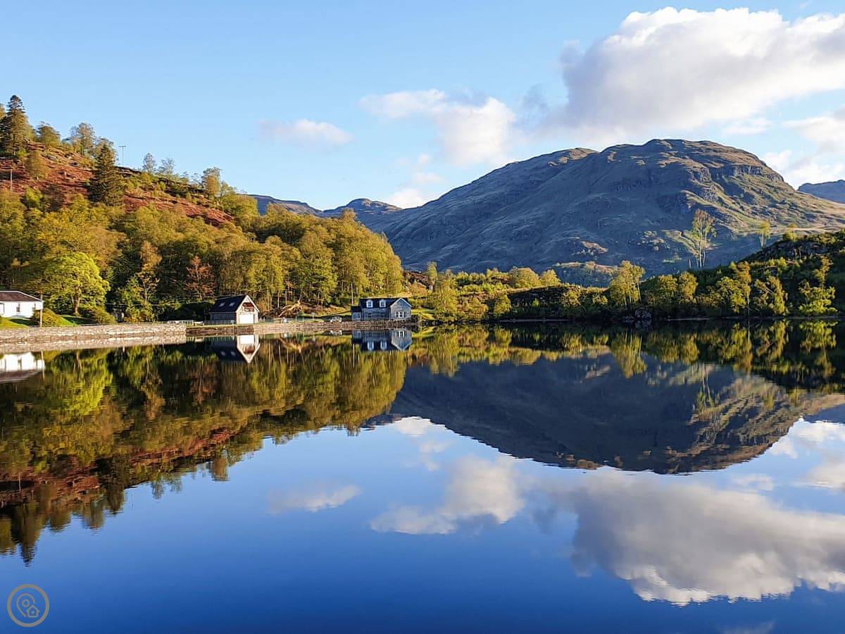 Lochside House is on the shore of Loch Katrine, up near Stronachlachar. It’s a five-bedroom house that sleeps ten. It’s the right-hand side of the building in the photo, completely separate. You can book the other side as well if you need to, but normally it’s locked off.