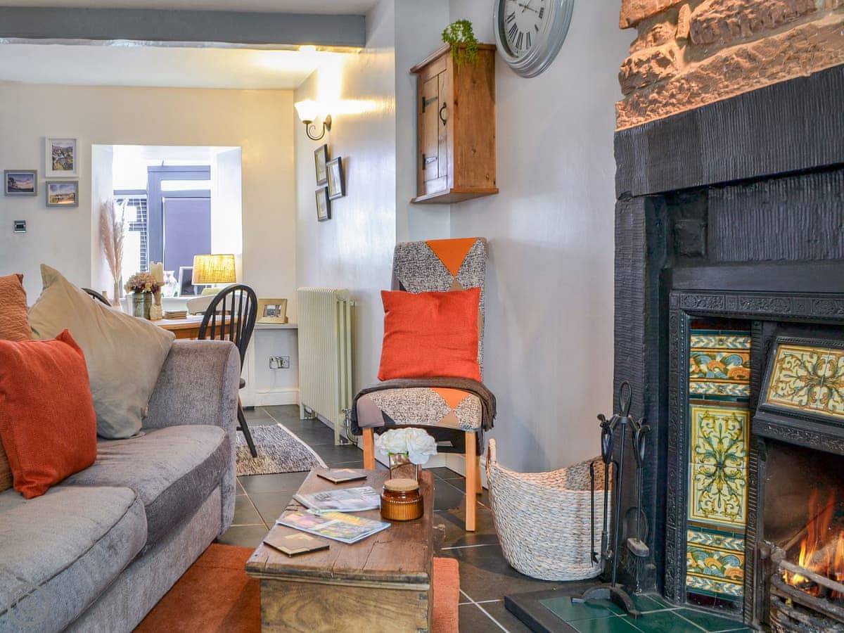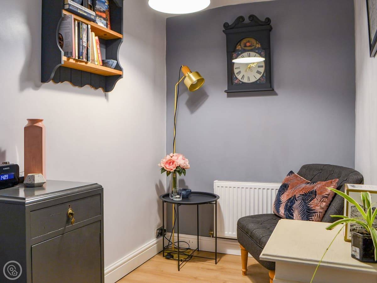 Inside, it's set up for a cosy stay. There's an open fire in the living room, a Smart TV, and a snug area to sit. The kitchen is compact but has what you need. It leads out to the garden. There's a separate little outbuilding with a washing machine.