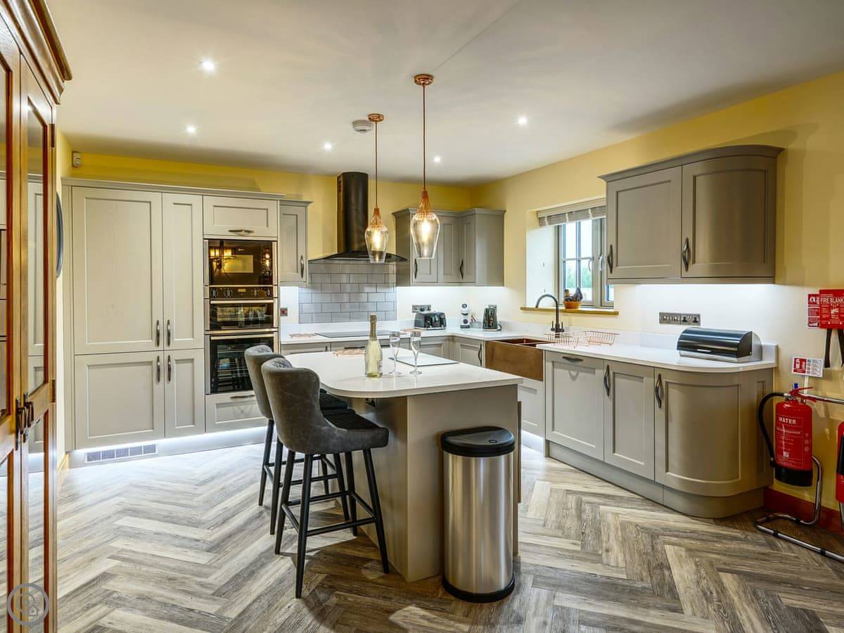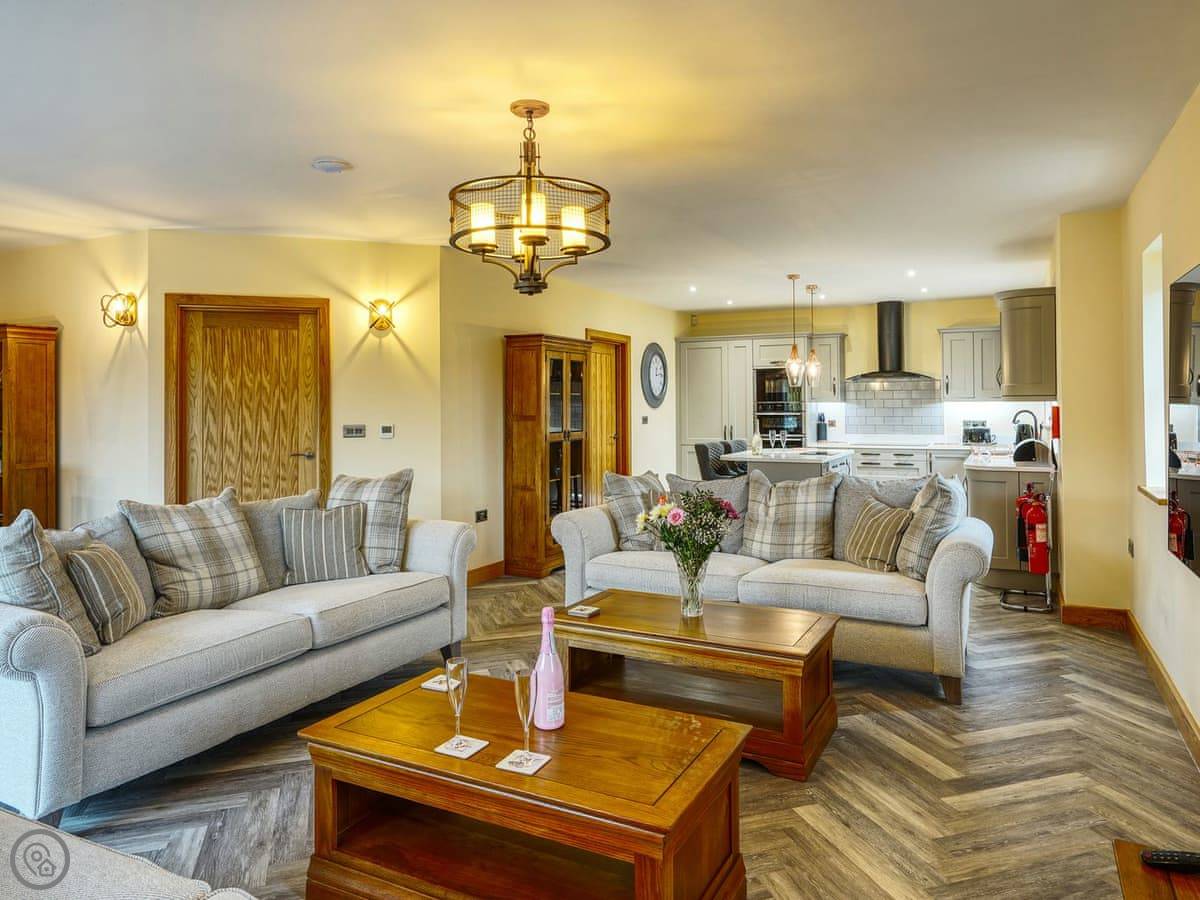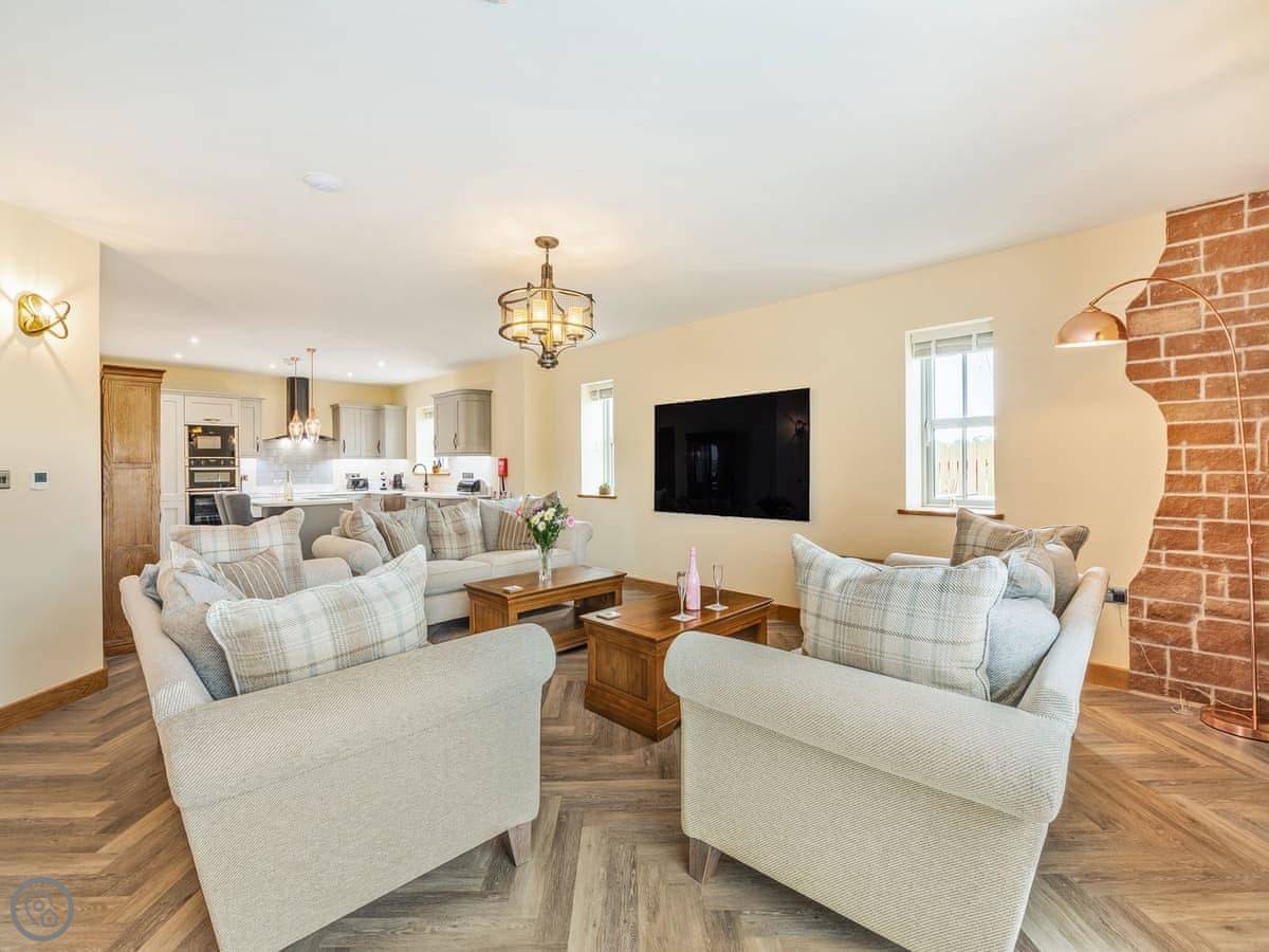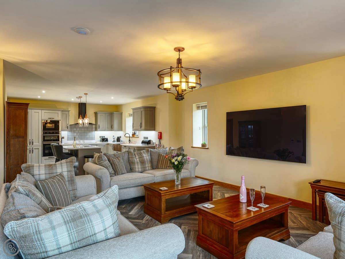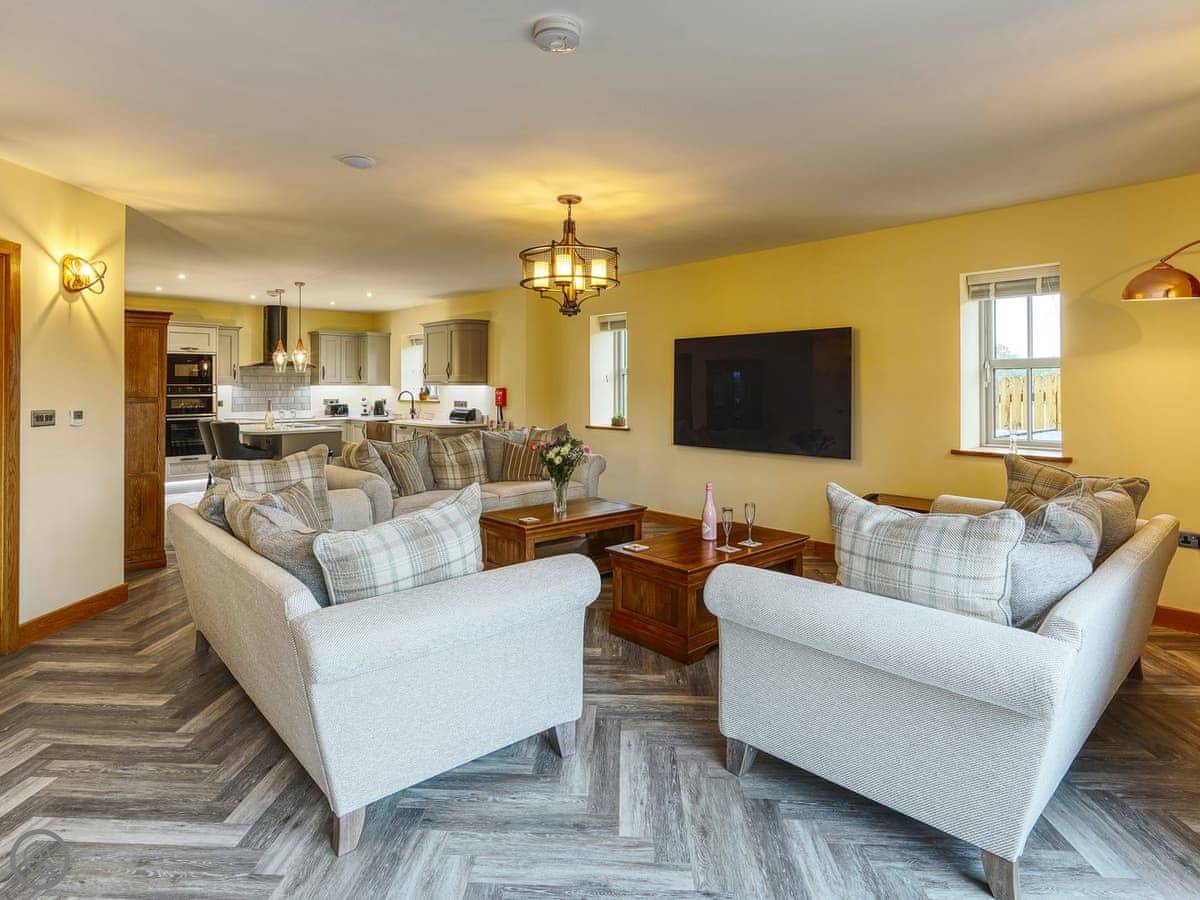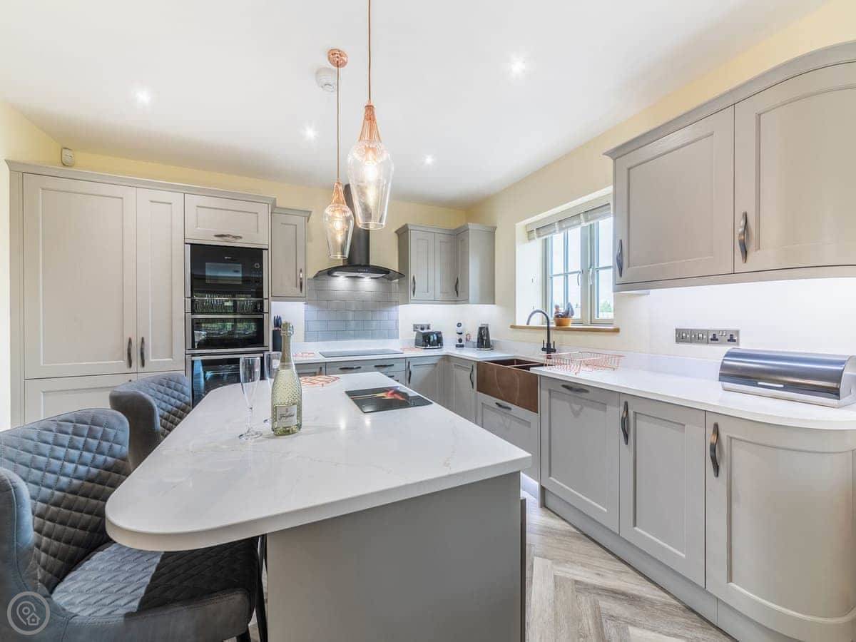It's a 5 star, luxury property that sleeps six. There are three bedrooms and each one has its own ensuite bathroom, which is handy. The living area is open plan. There's a 75 inch TV in there. The kitchen is modern and has a dishwasher and washing machine.