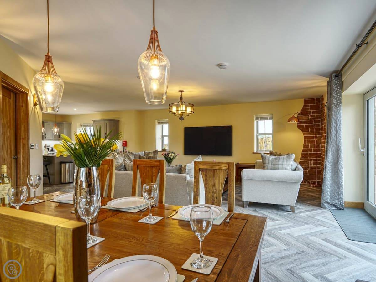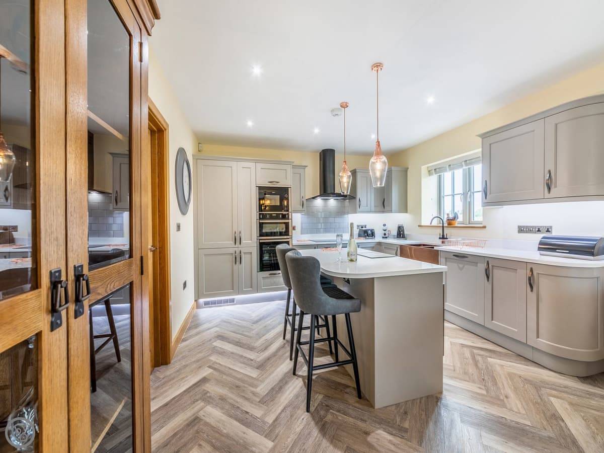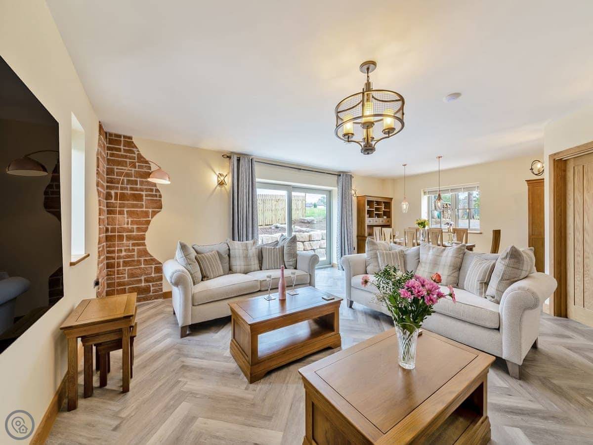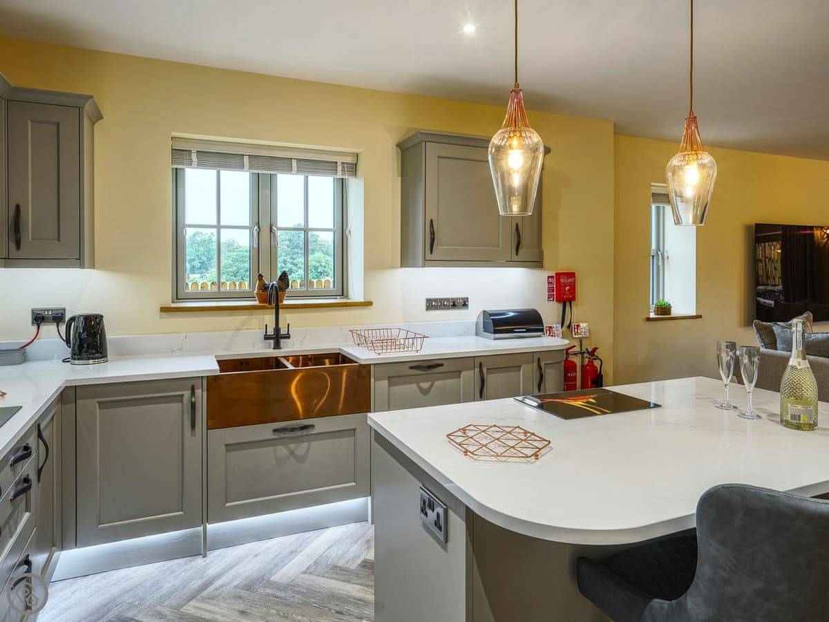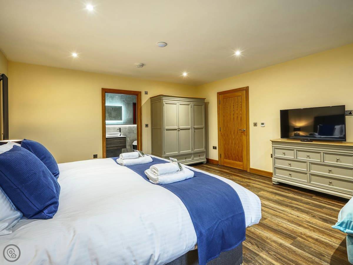 It's a 5 star, luxury property that sleeps six. There are three bedrooms and each one has its own ensuite bathroom, which is handy. The living area is open plan. There's a 75 inch TV in there. The kitchen is modern and has a dishwasher and washing machine.
