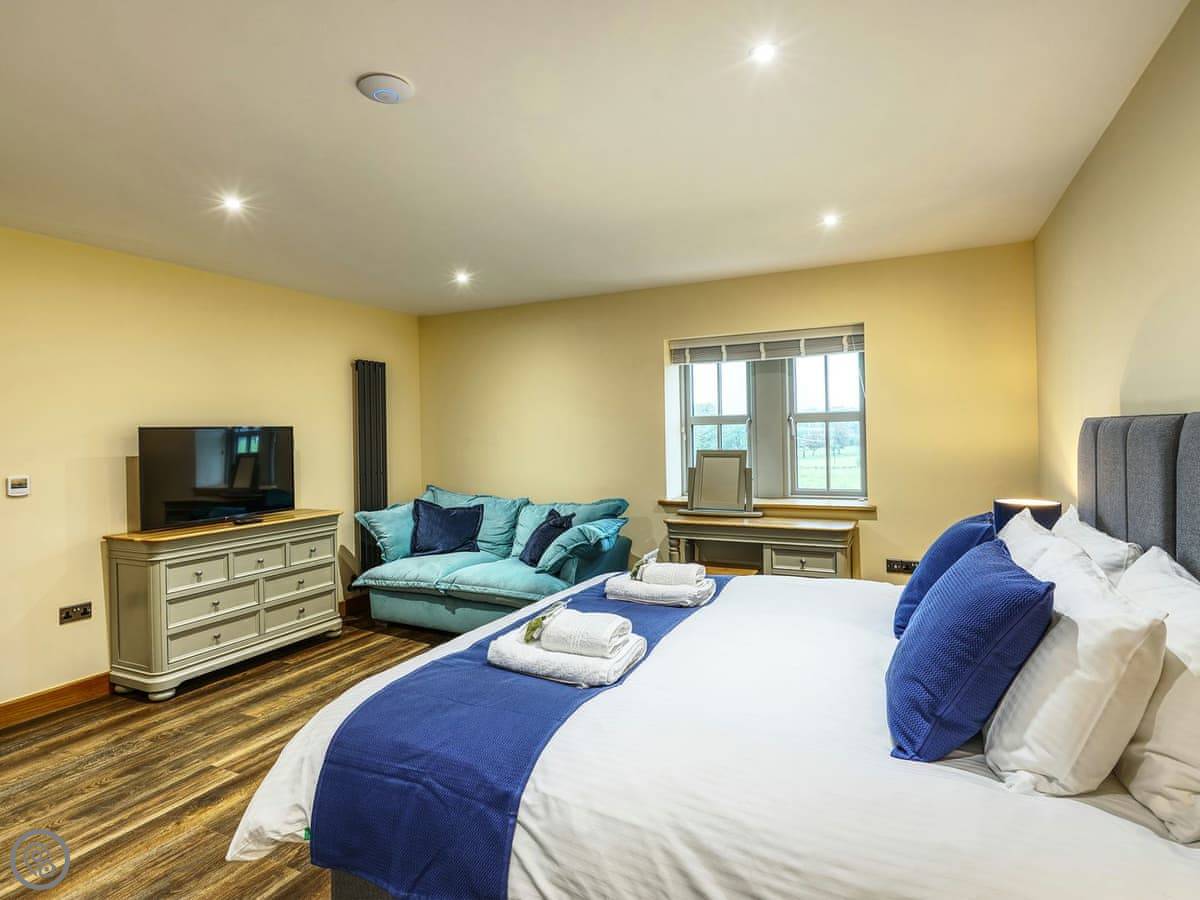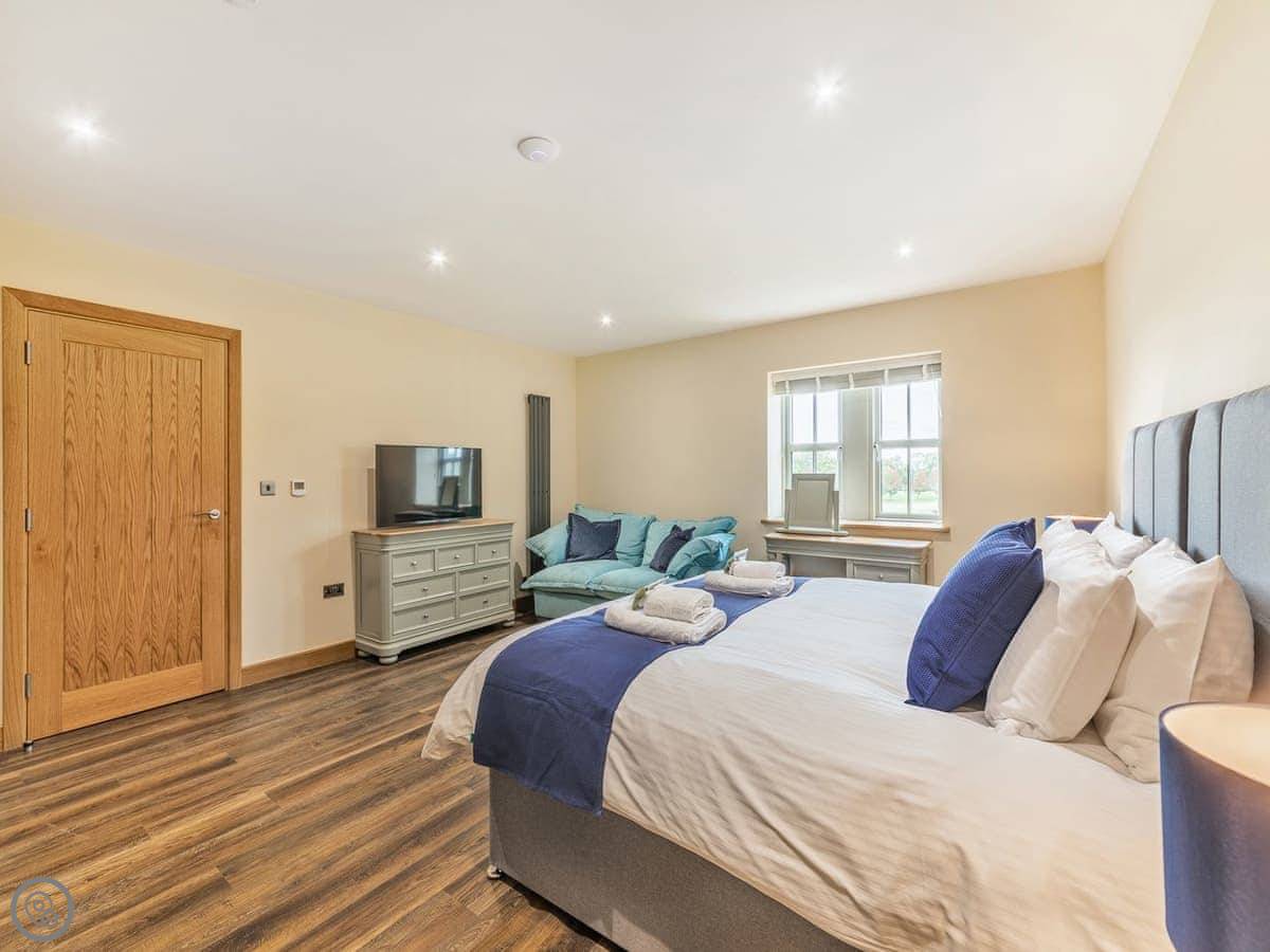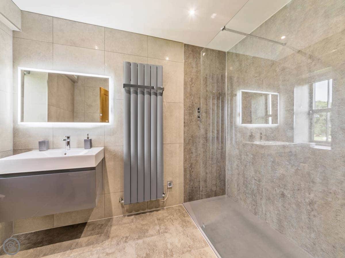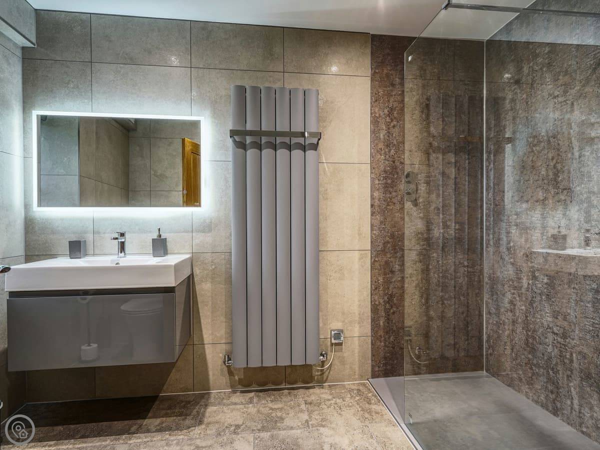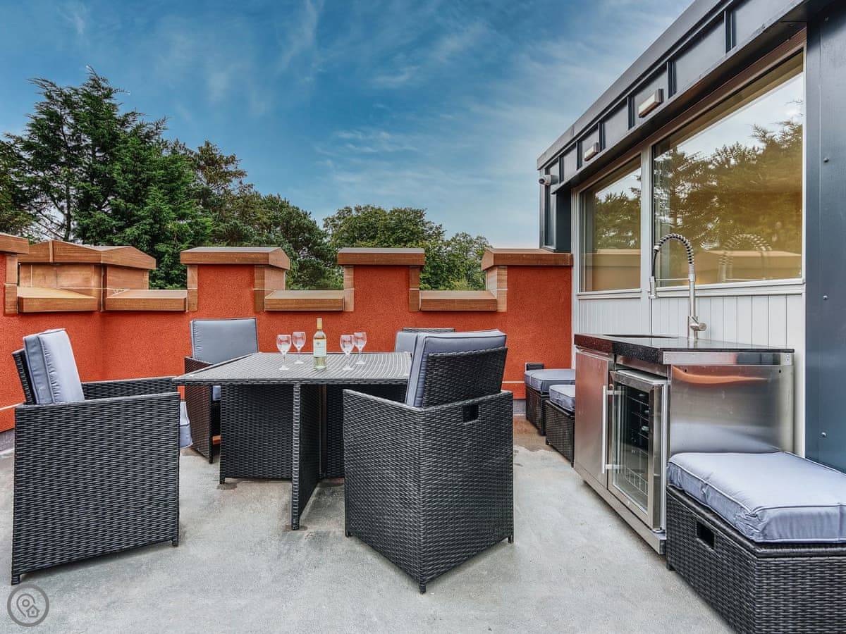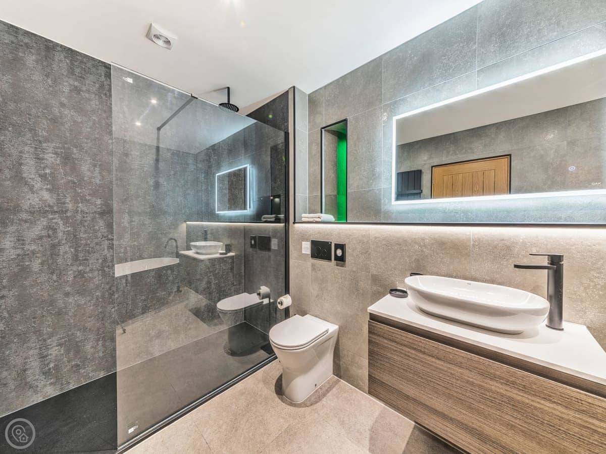 It's a 5 star, luxury property that sleeps six. There are three bedrooms and each one has its own ensuite bathroom, which is handy. The living area is open plan. There's a 75 inch TV in there. The kitchen is modern and has a dishwasher and washing machine.