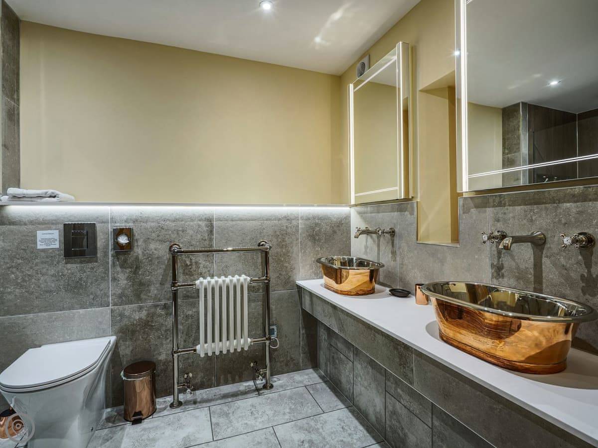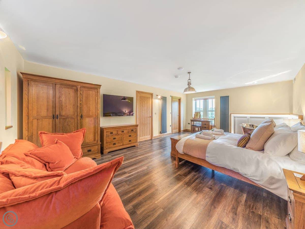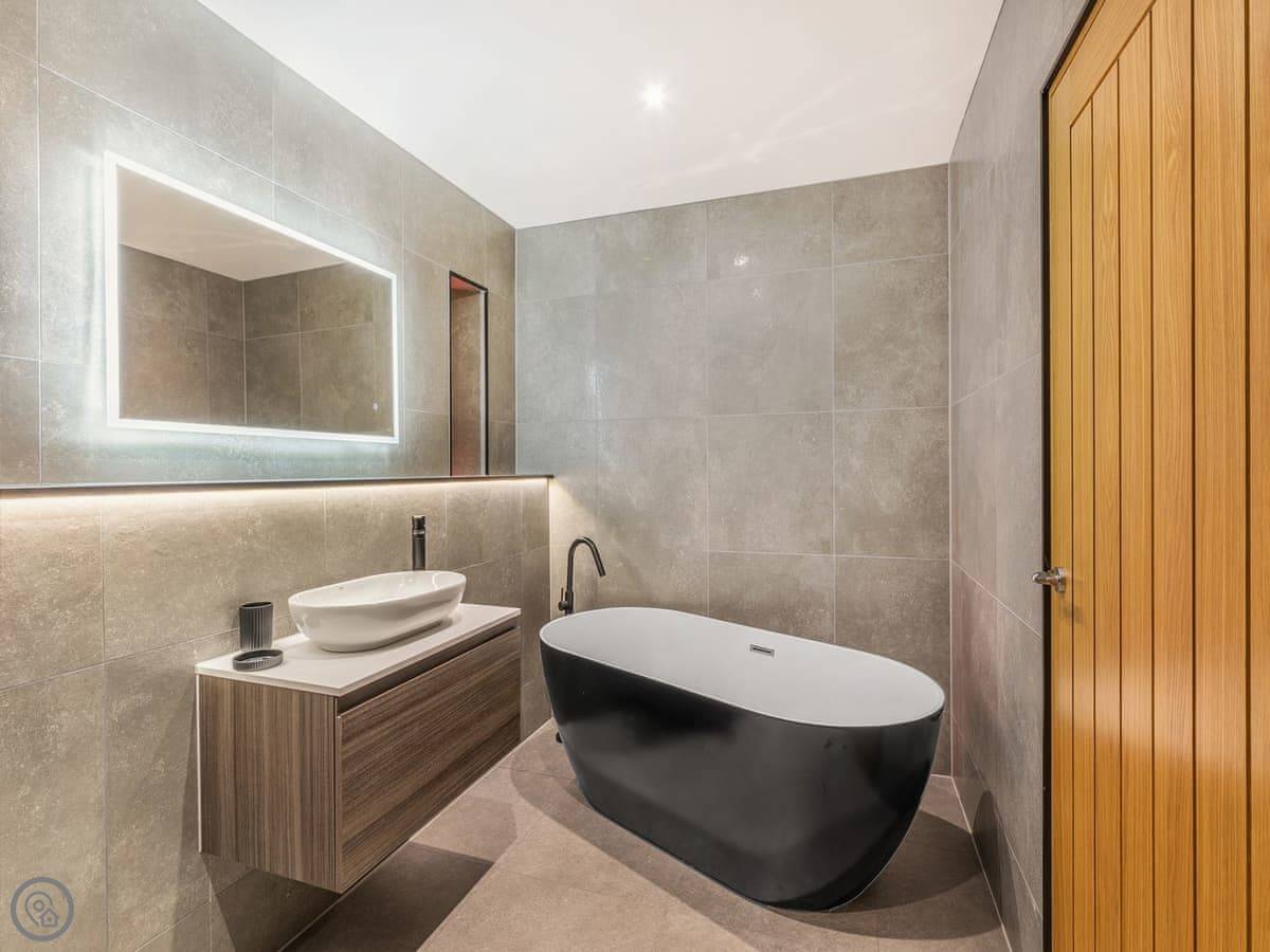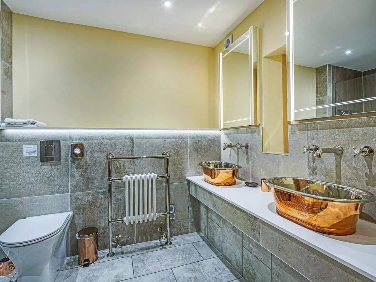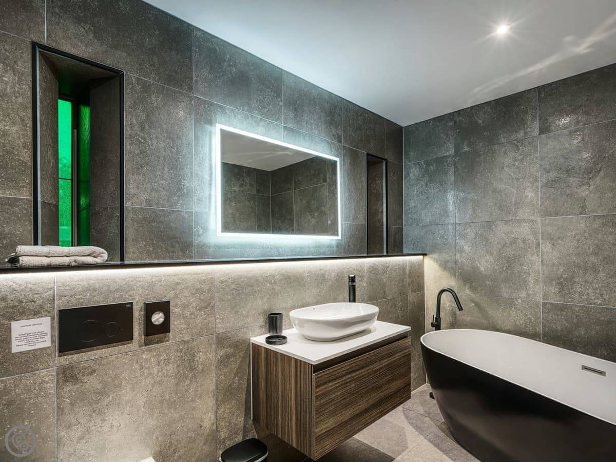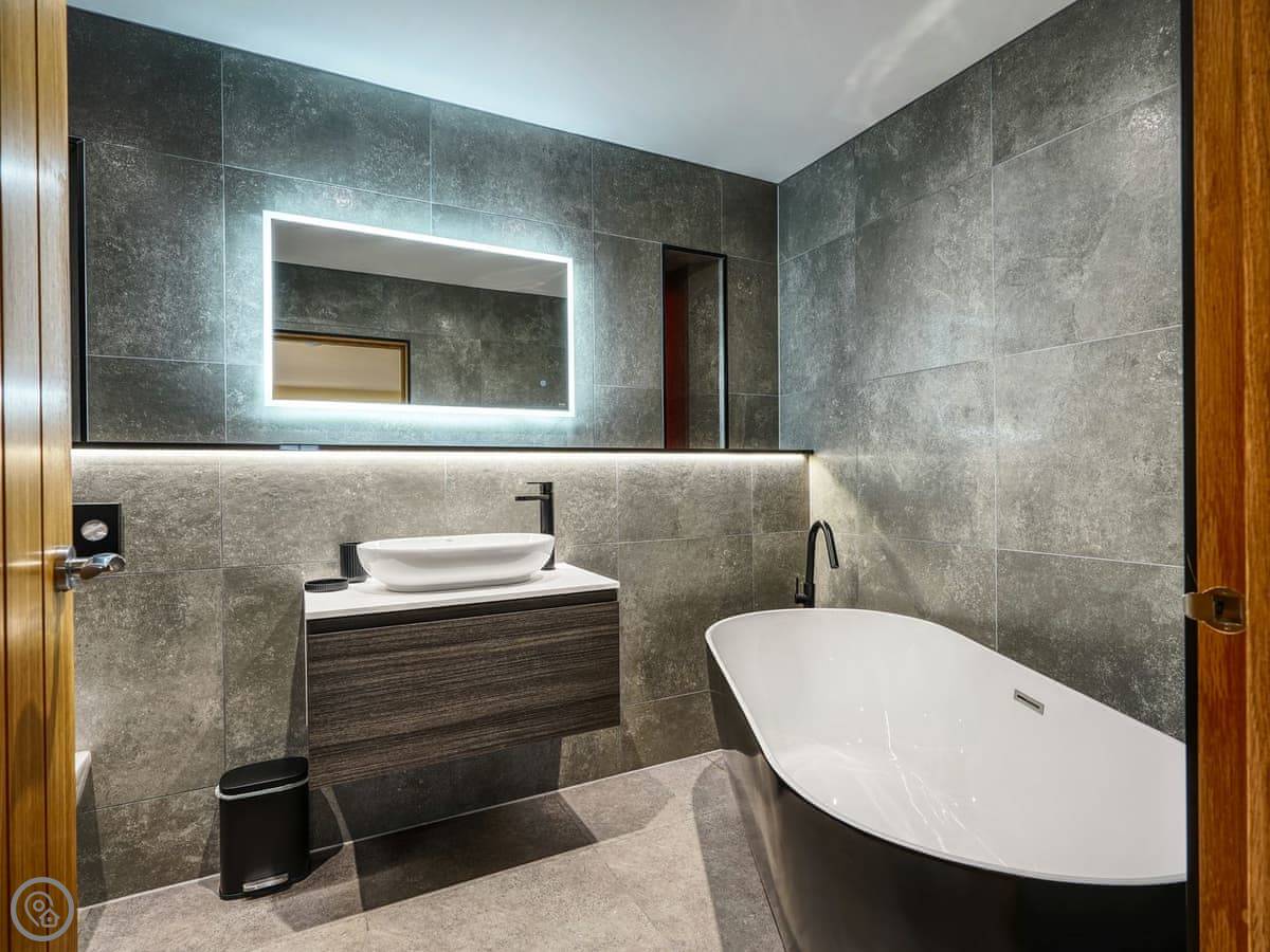 It's a 5 star, luxury property that sleeps six. There are three bedrooms and each one has its own ensuite bathroom, which is handy. The living area is open plan. There's a 75 inch TV in there. The kitchen is modern and has a dishwasher and washing machine.