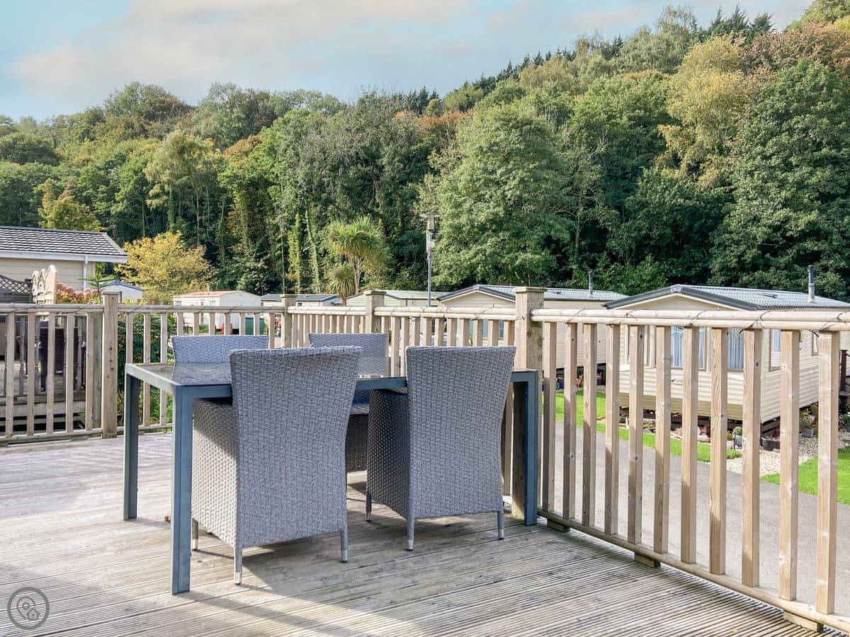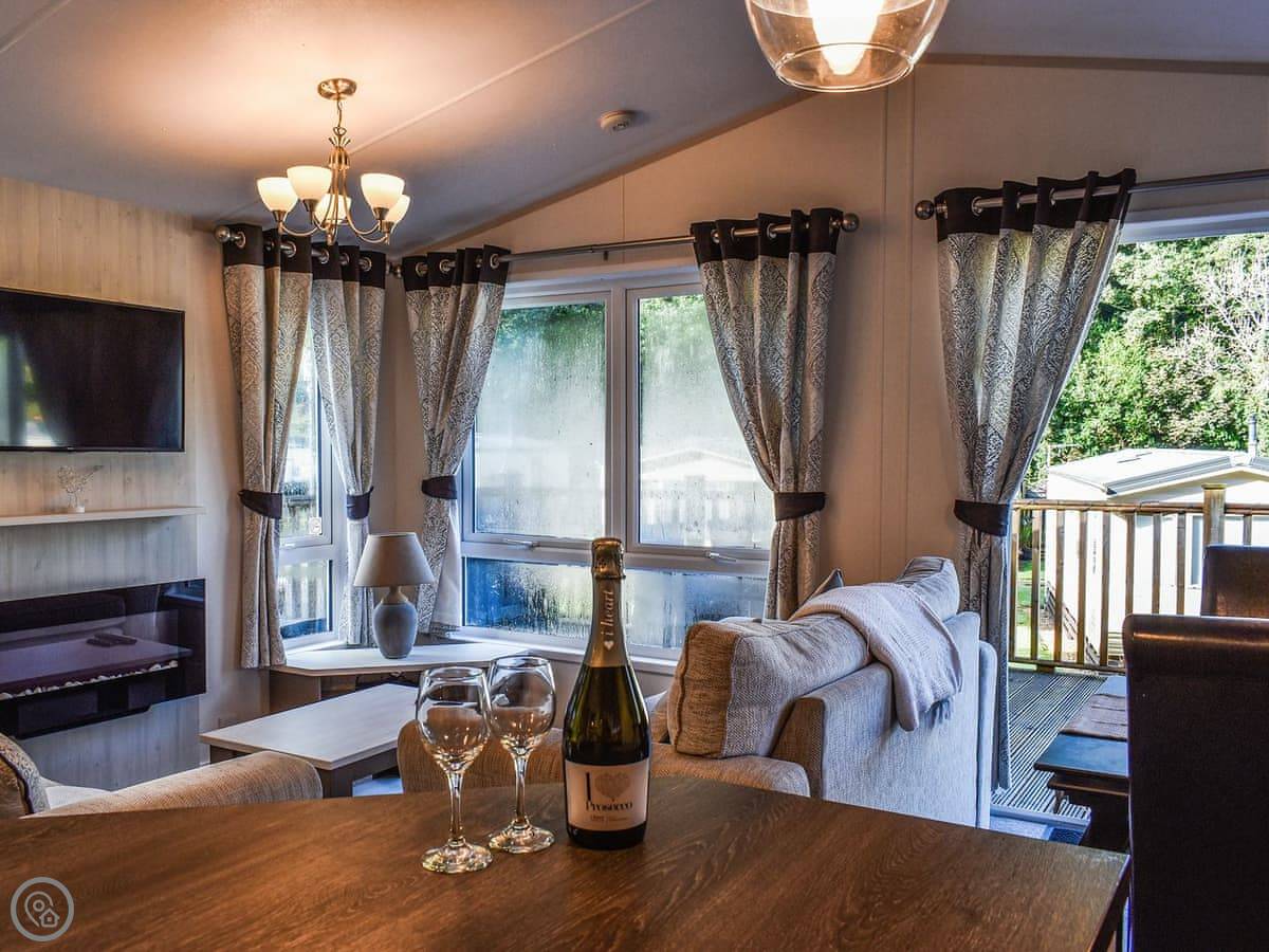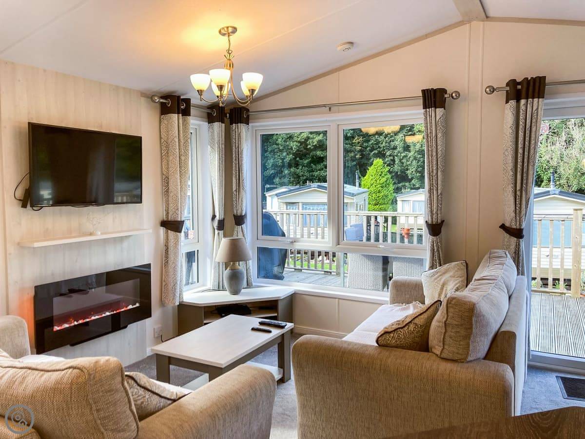 The living area is open plan, with doors that open out onto a deck. The deck is enclosed, which is handy if you've got a dog. You can bring one dog. There's a Smart TV with a Firestick and a modern electric fire.