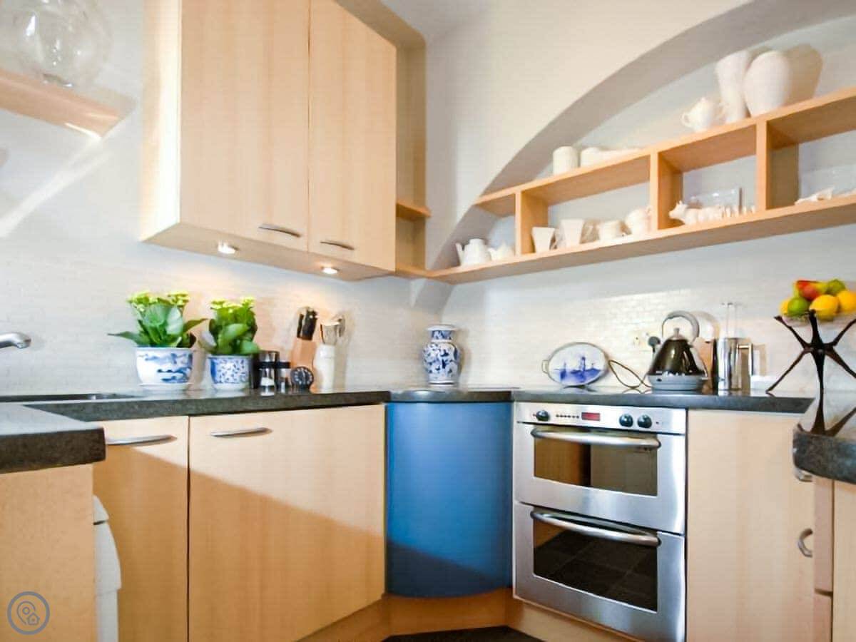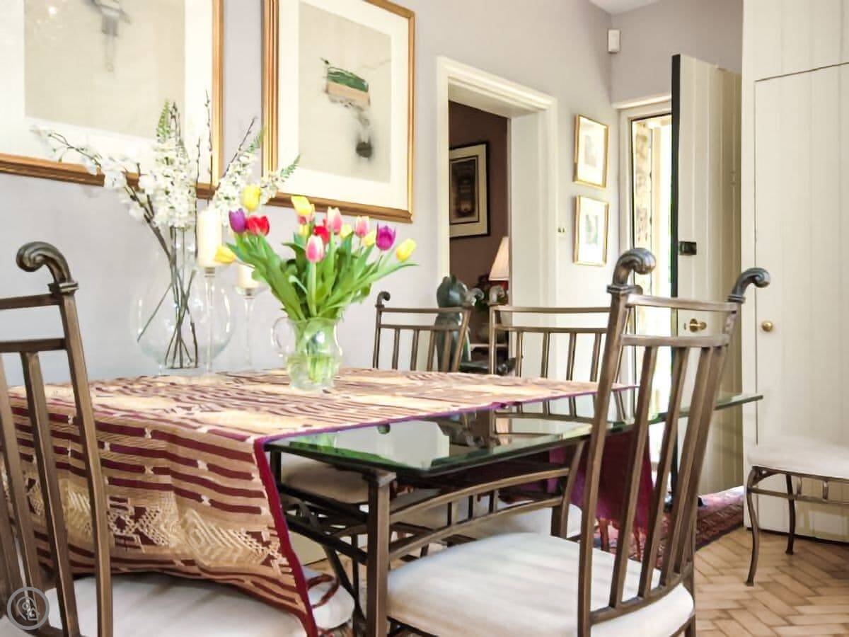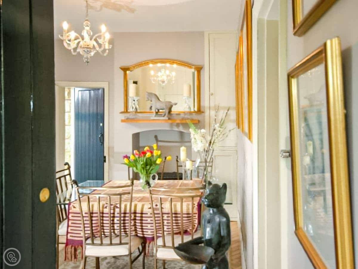 Inside, the front room is comfortable. The kitchen is compact but has what you need. The dining hall has space for six.
