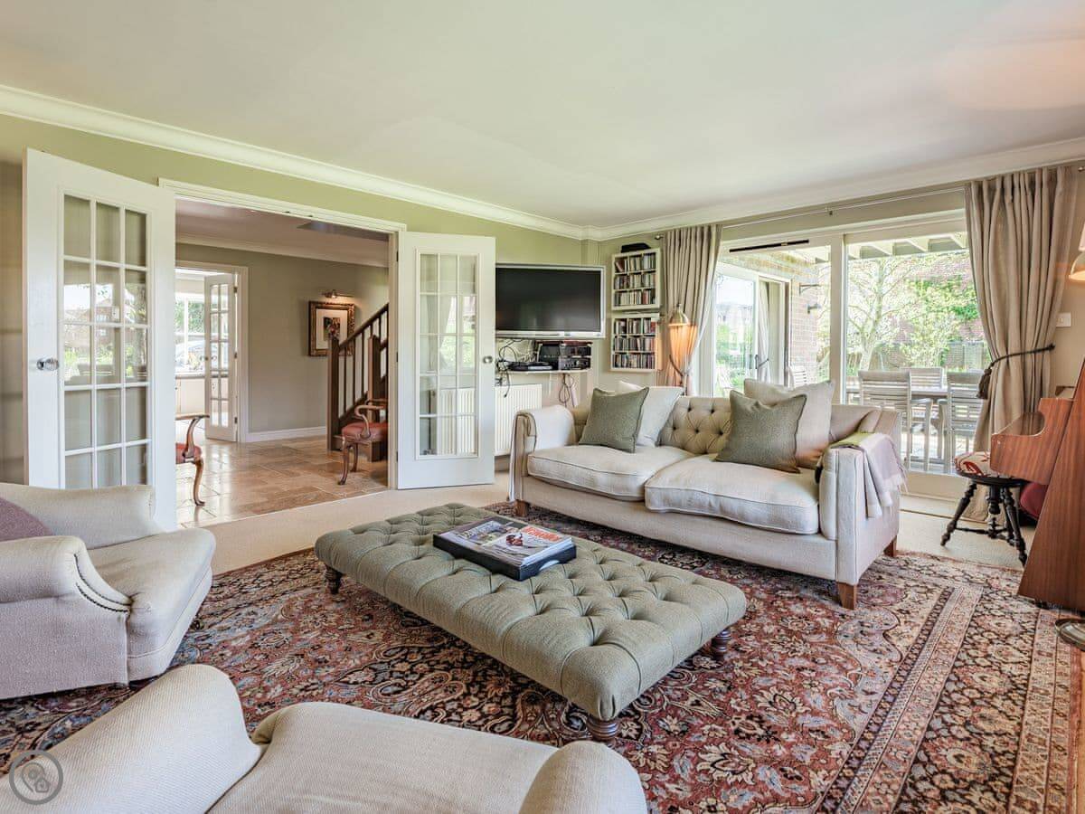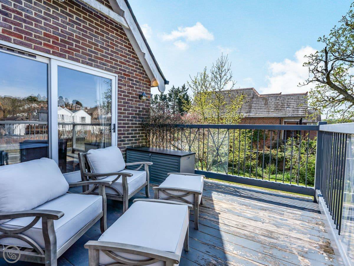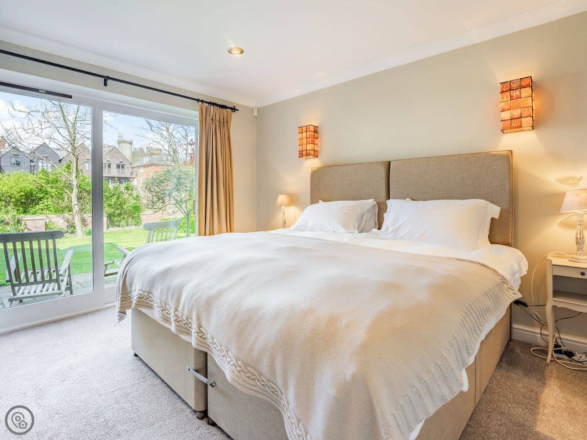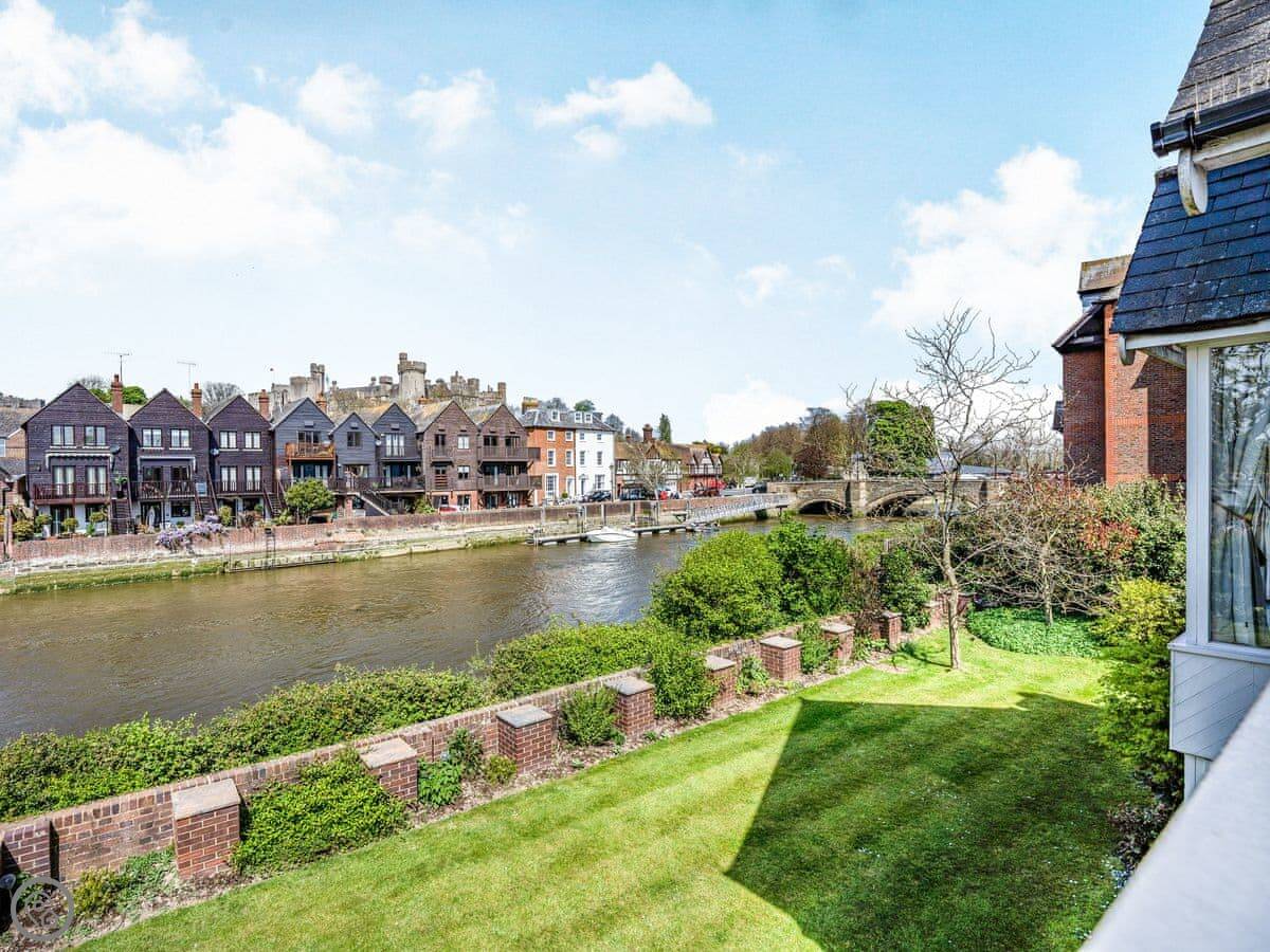 Riverside House is perfectly placed right on the banks of the river Arun with views across the water to the castle and the cathedral both rising majestically above the town. Whether you are looking for a great house for an extended family gathering or somewhere special for a group of friends to get together you are unlikely to find anywhere better. Each of the five bedrooms has an en-suite bath or shower room and three of them have both a bath and a separate shower. The sublime principal bedroom suite has a super kingsize bed, sitting area and indulgent bathroom with double end freestanding bath, walk-in shower and double sinks. Both the bedroom and bathroom offer outstanding views of the castle and the cathedral and also shares a large balcony with the twin bedroom. The third bedroom has a kingsize cabin bed. The other two bedrooms are accessed via a different staircase and one has a kingsize bed whilst the other has a twin beds. Downstairs there is a wonderful kitchen and open plan dining room with sitting-area the perfect place to gather before during and after meals. It opens onto the garden so you can spill outside and enjoy al fresco dining and entertainment if you feel inclined. For the children there is a play room next to the kitchen which is packed with lots of things of fun and interest so they should be entertained. For the adults there is a separate more formal living room with gas fireplace, the perfect place for relaxing games and listening to music or watching something on the large satellite TV. On those warm summer evenings there is nothing better than relaxing in the riverbank garden with a cold drink watching the swans paddling gracefully past. At Riverside House the experience will be enhanced with the incomparable views across the river to the castle. In the day time the garden will also be a great place to relax with shady or sunny places to sit according to your whim. At the front of the house there is ample parking on the driveway inside the electric gates for several cars which is a great benefit in Arundel where off road parking is hard to come by.