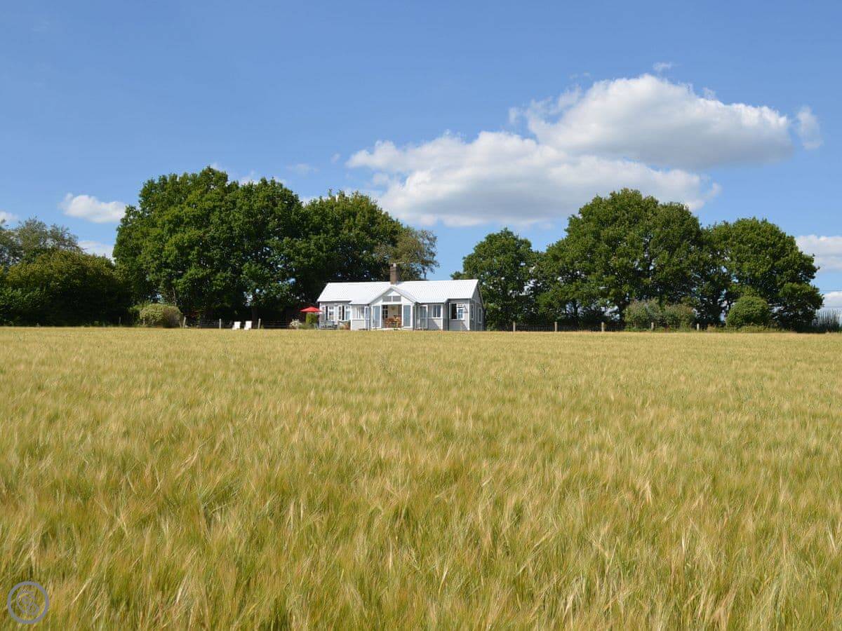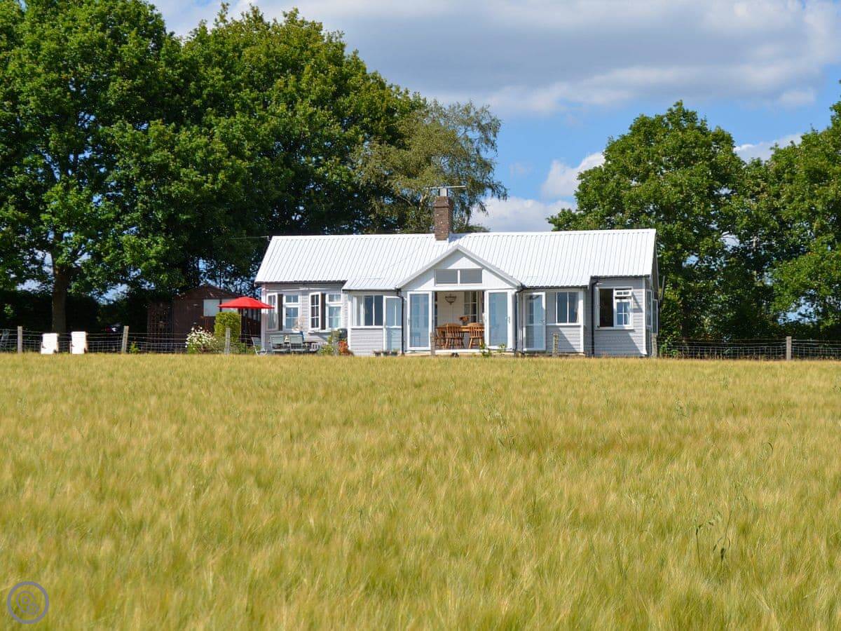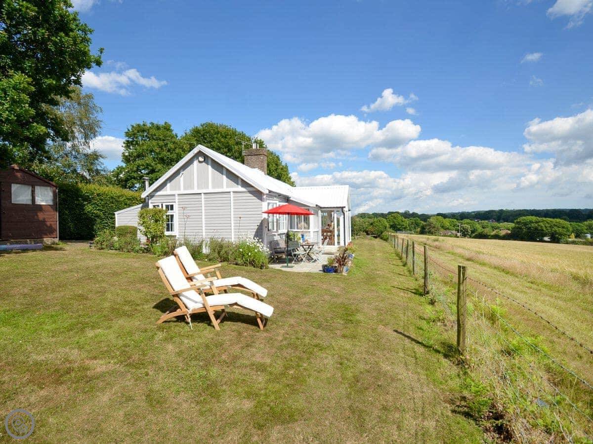 This is Spring Harbour. It's in High Hurstwood, which is a small village near Crowborough and Uckfield. It's a detached cottage on its own. The main thing about it is the view. You look out from the veranda across fields to the South Downs in the distance. It's very quiet.