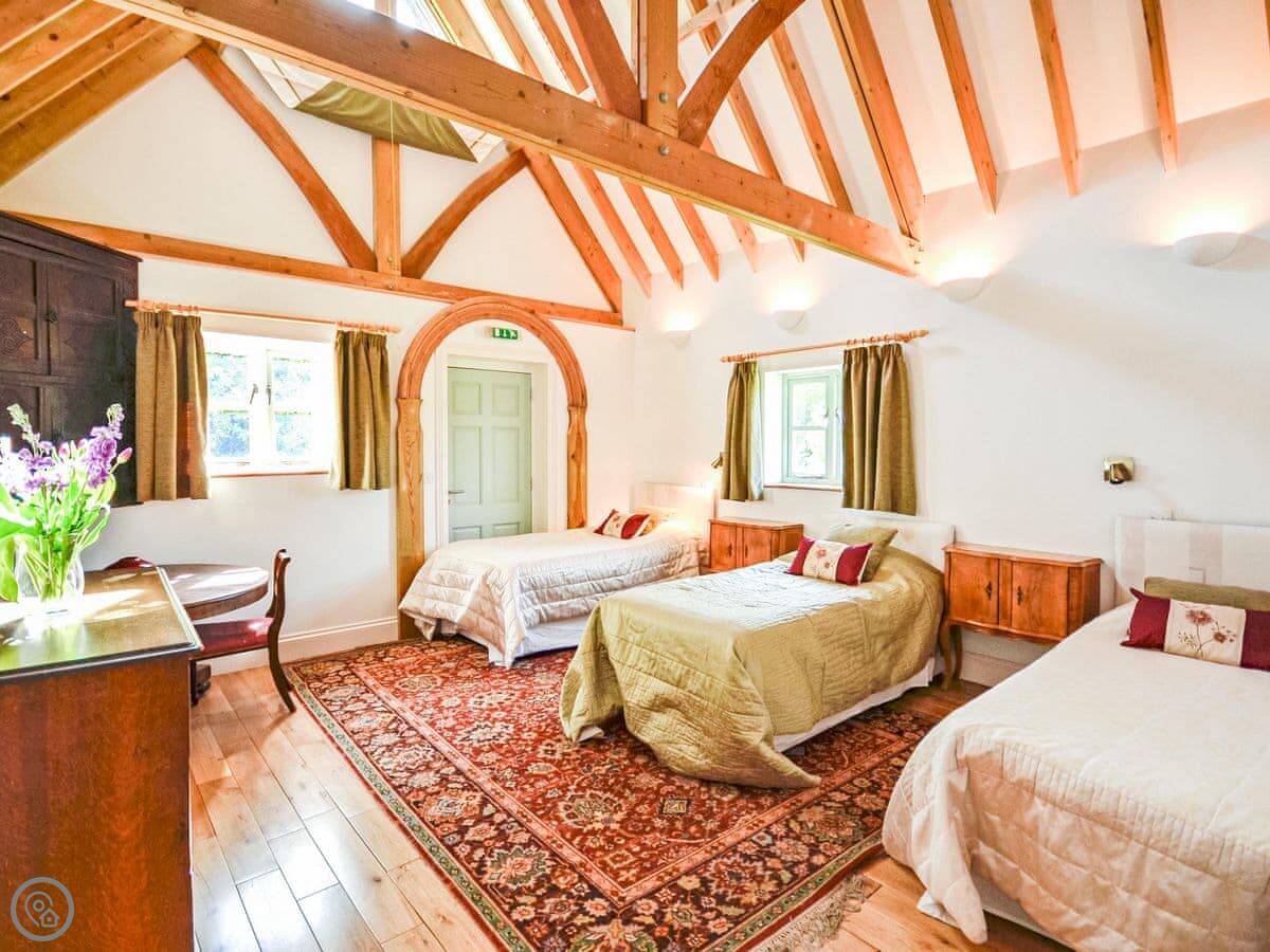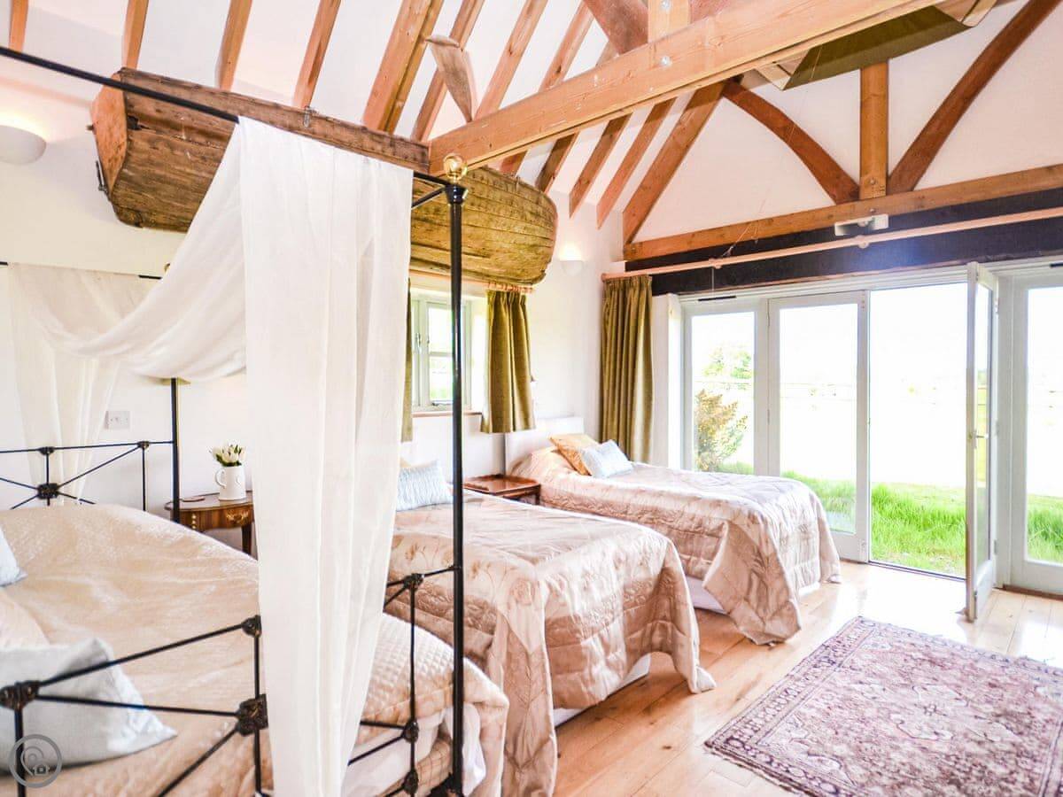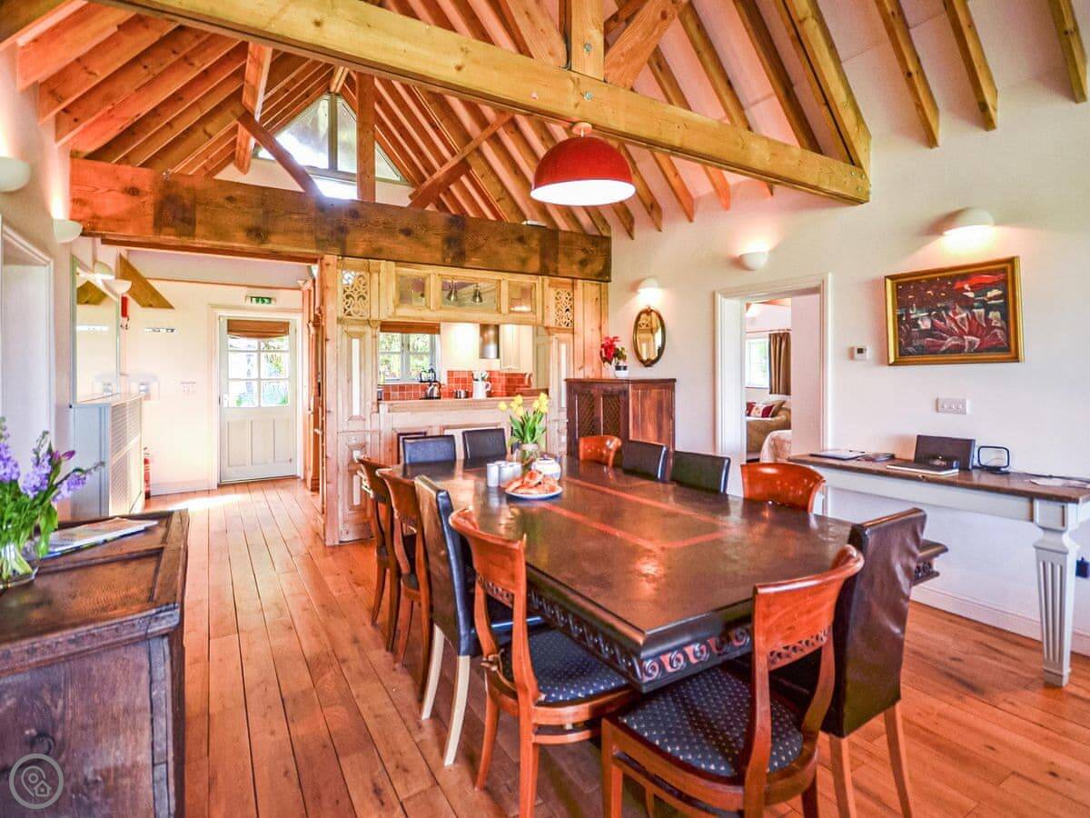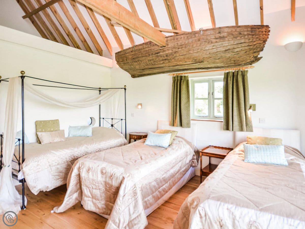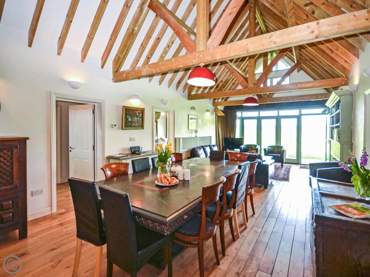 House On The Brooks is in Ashington, West Sussex. It's a big, open-plan house built like an old Saxon hall, with the roof beams showing. It sleeps fourteen people across four bedrooms, and each bedroom has its own bathroom.