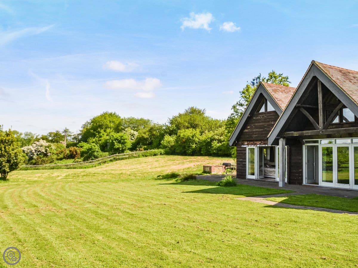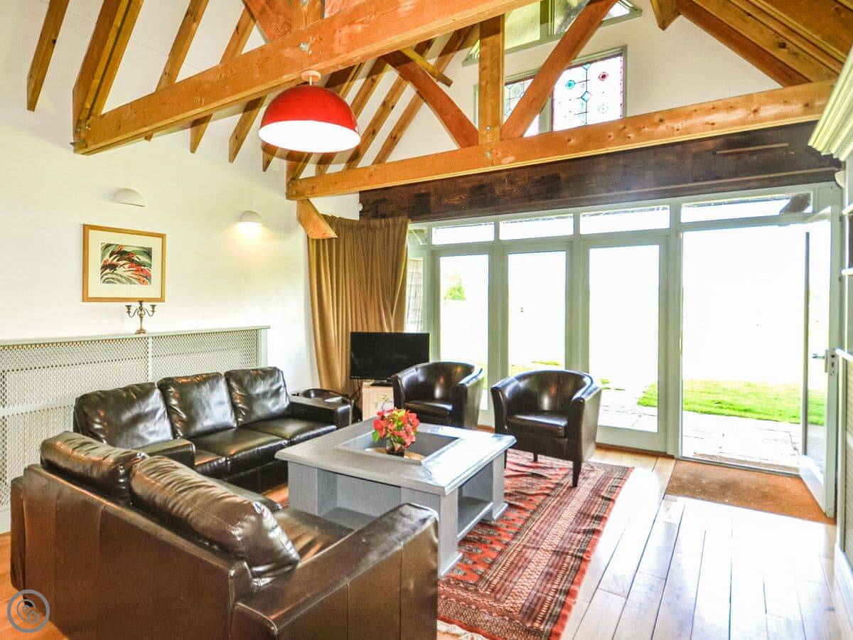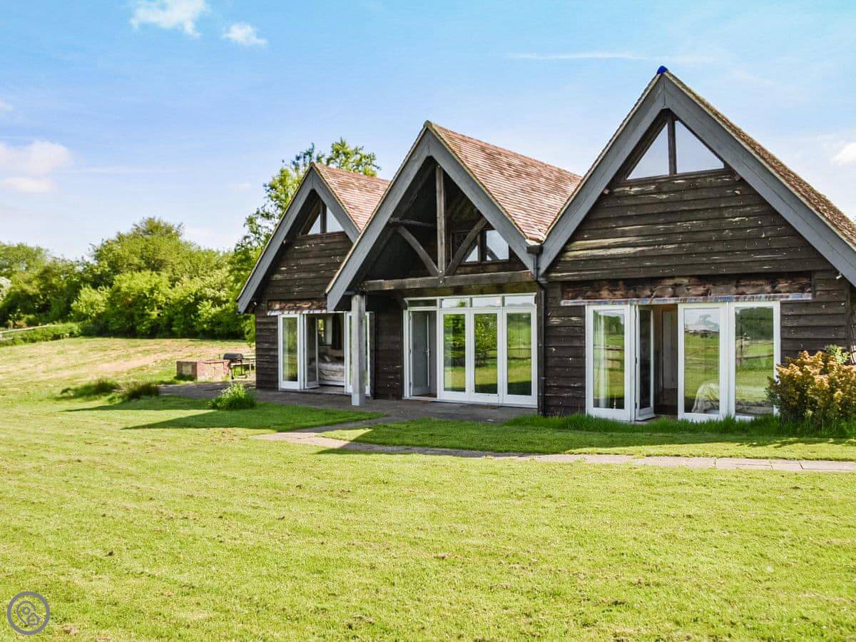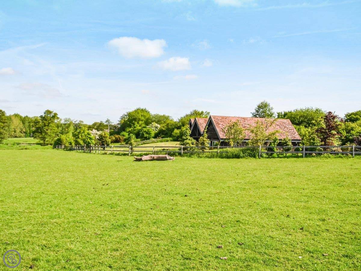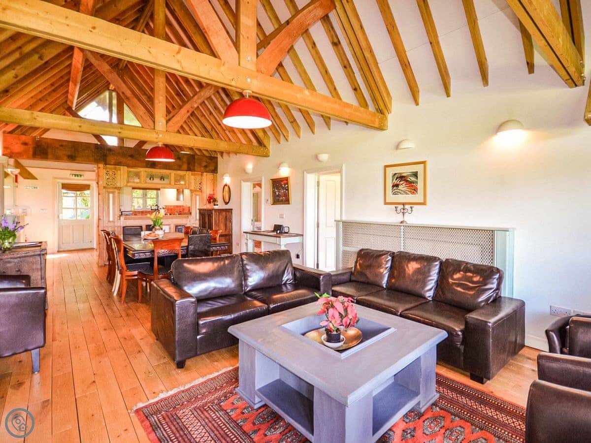 House On The Brooks is in Ashington, West Sussex. It's a big, open-plan house built like an old Saxon hall, with the roof beams showing. It sleeps fourteen people across four bedrooms, and each bedroom has its own bathroom.