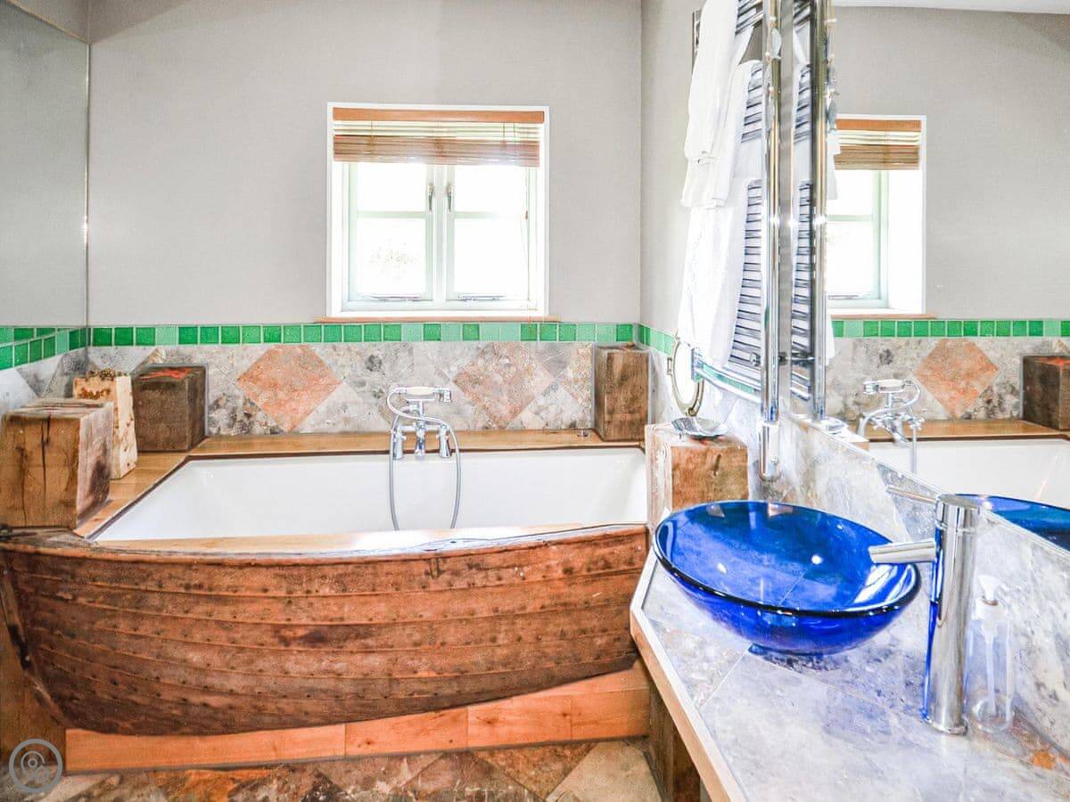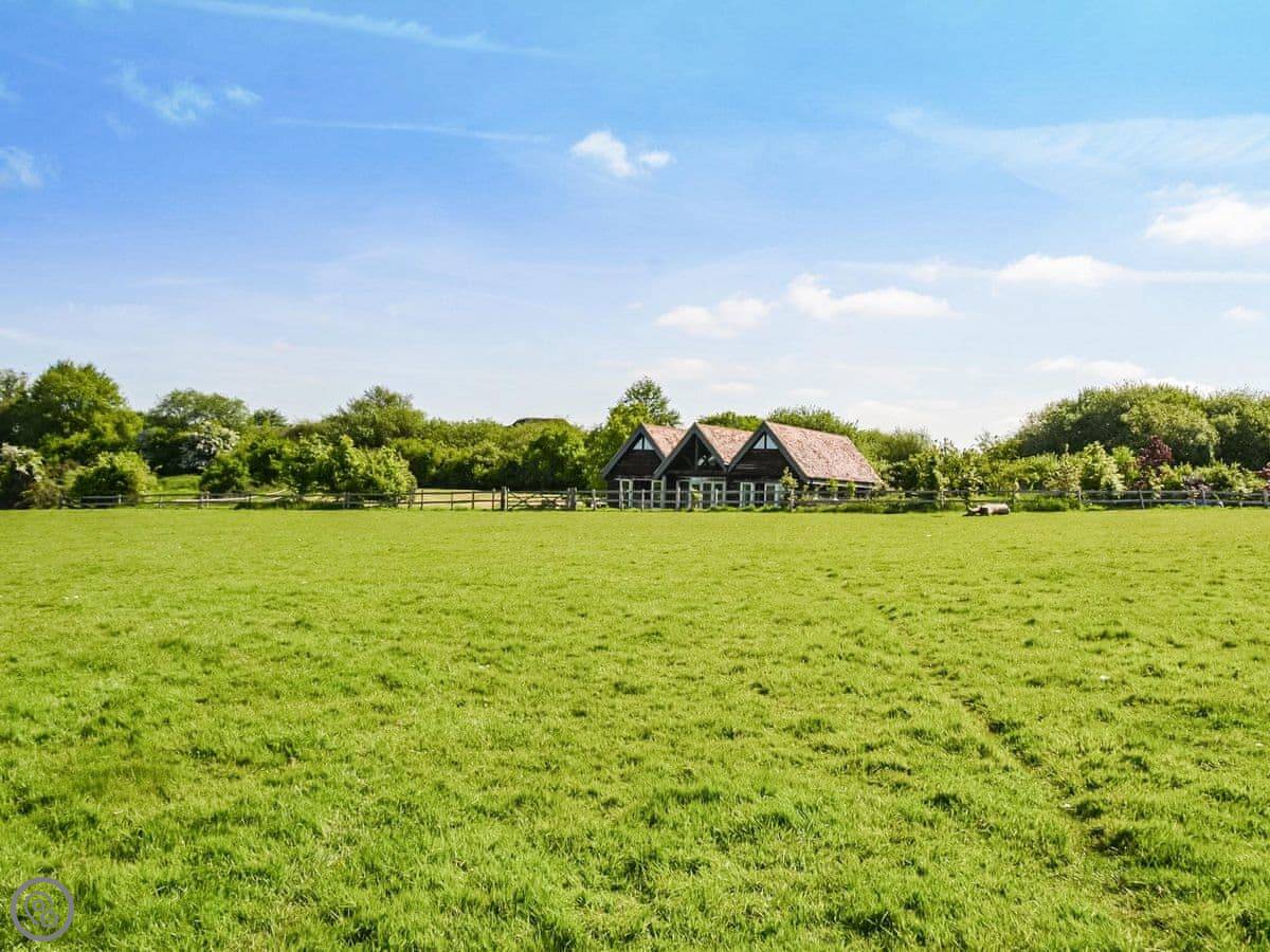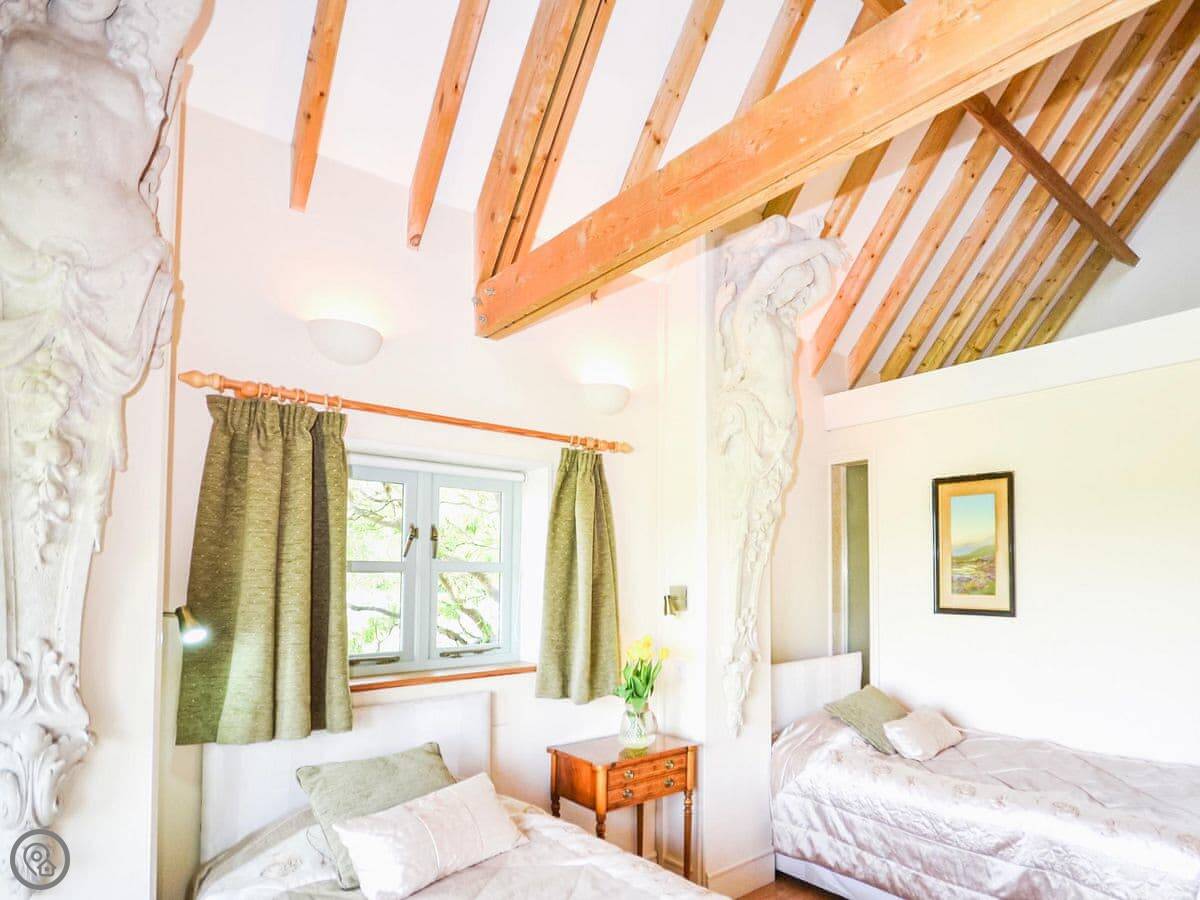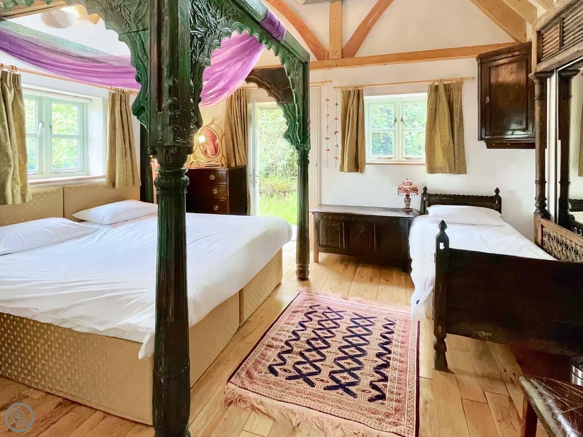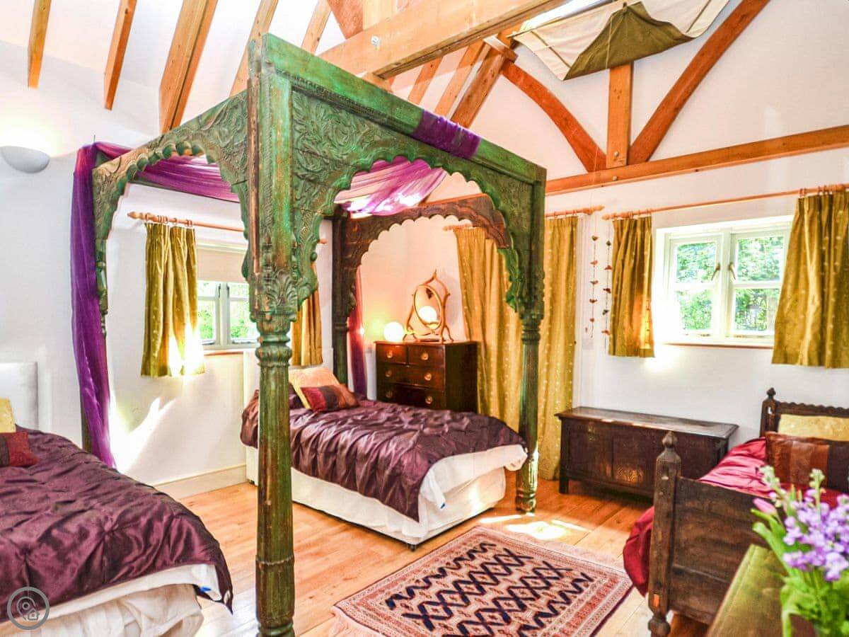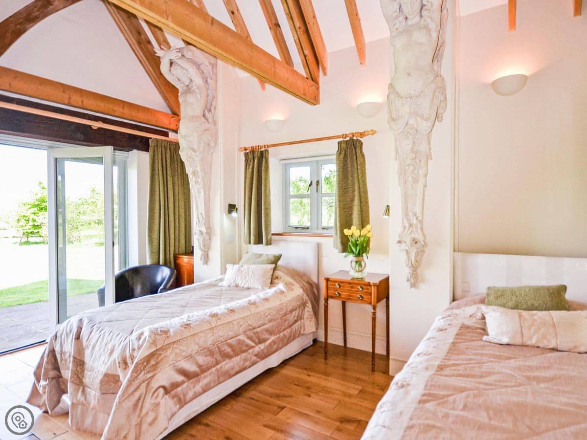 House On The Brooks is in Ashington, West Sussex. It's a big, open-plan house built like an old Saxon hall, with the roof beams showing. It sleeps fourteen people across four bedrooms, and each bedroom has its own bathroom.