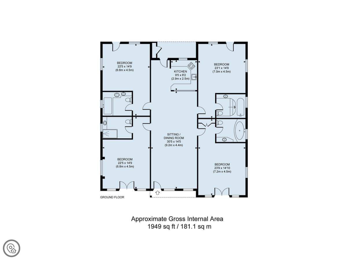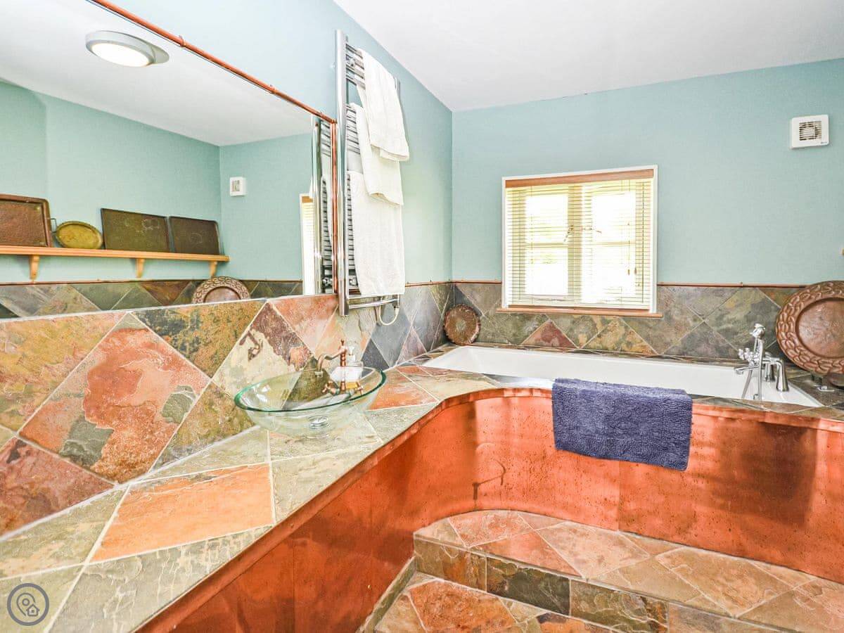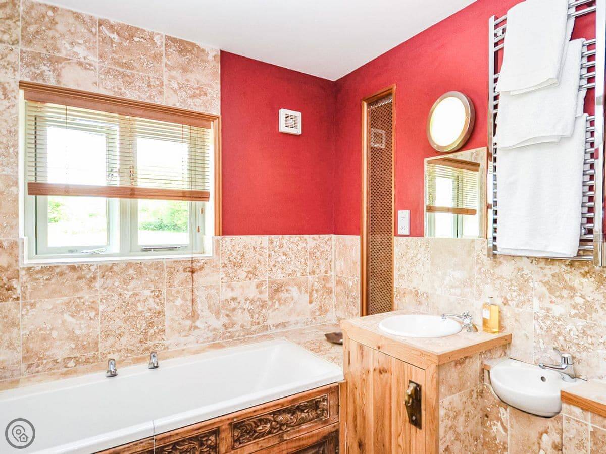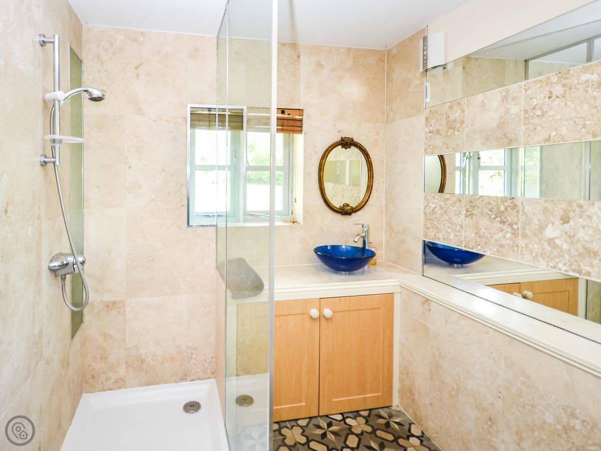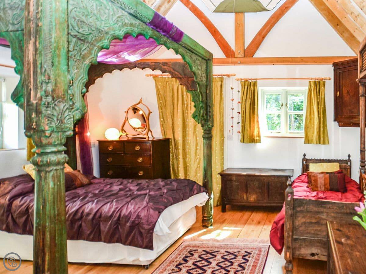 House On The Brooks is in Ashington, West Sussex. It's a big, open-plan house built like an old Saxon hall, with the roof beams showing. It sleeps fourteen people across four bedrooms, and each bedroom has its own bathroom.