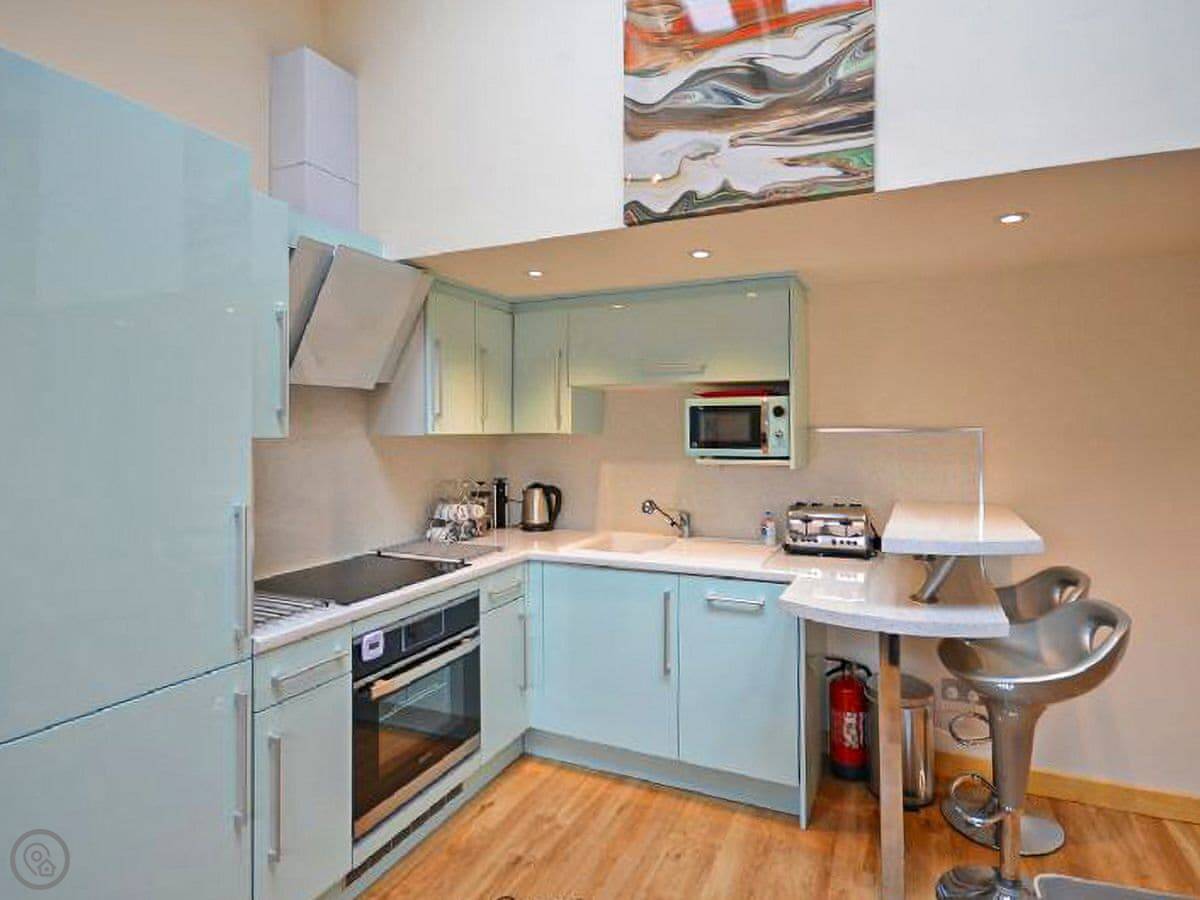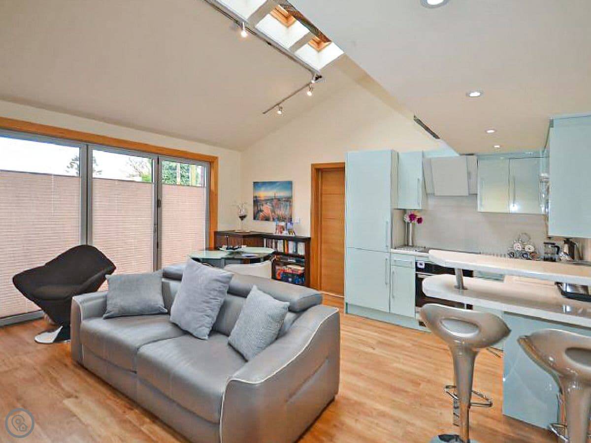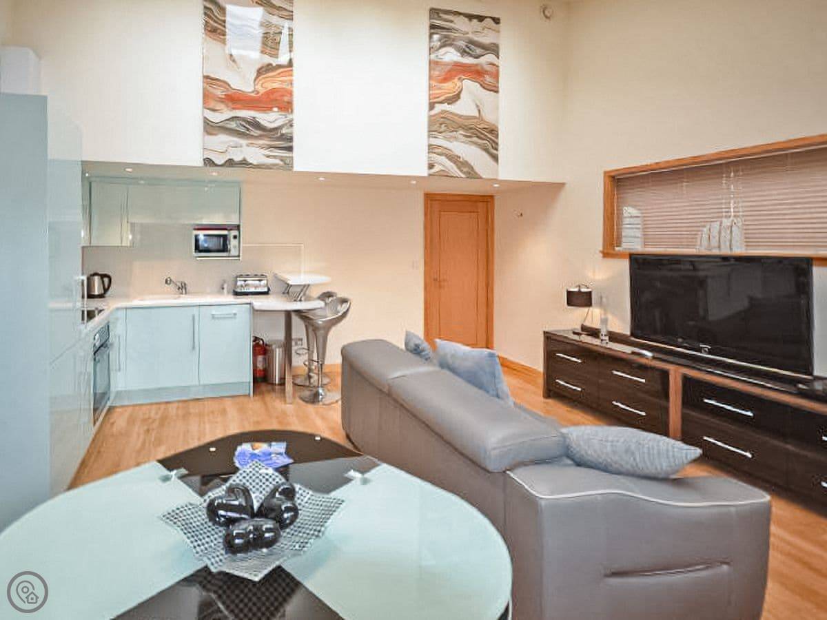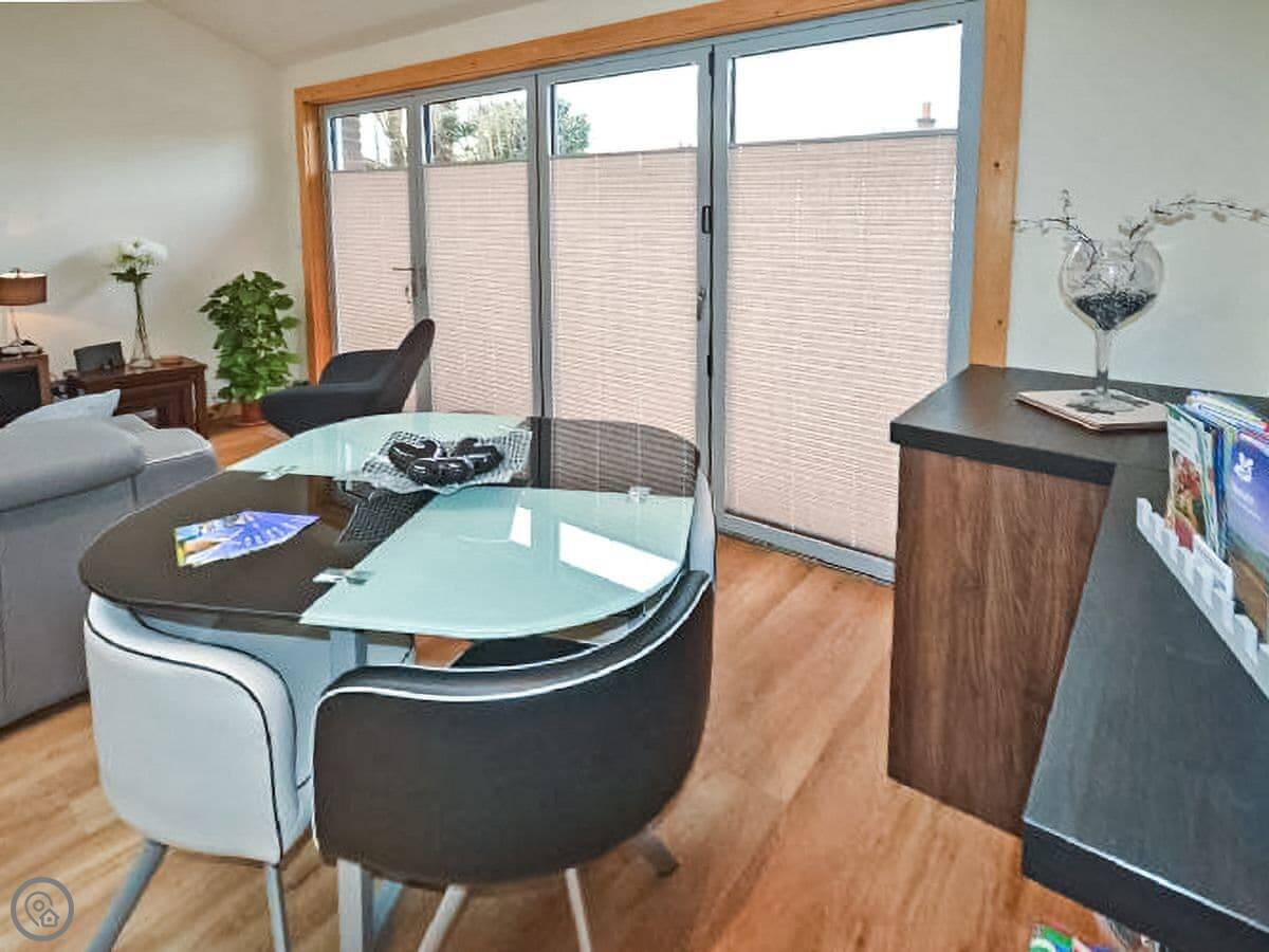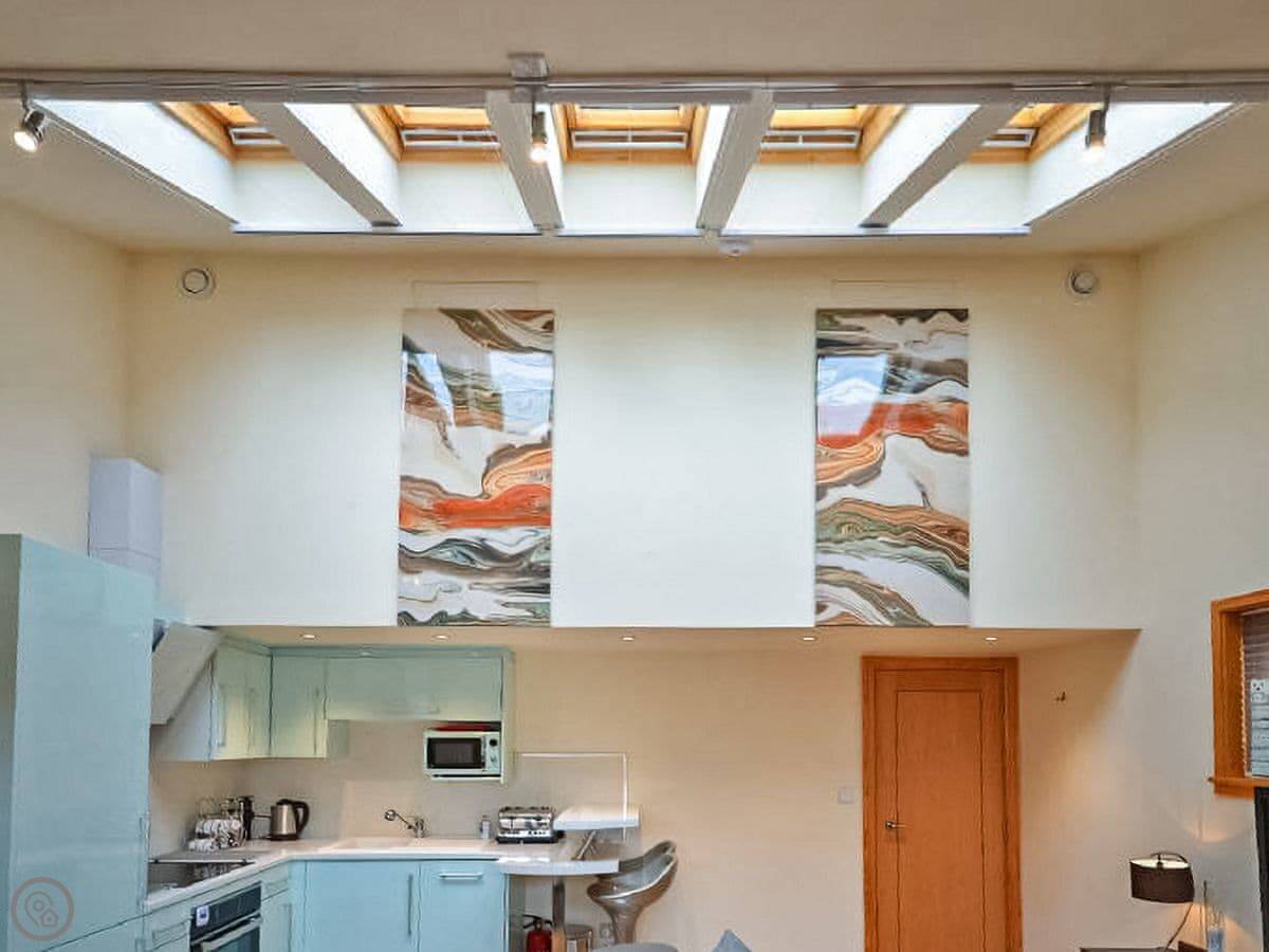 It's got a 4 Star rating. That just means it's well-equipped and tidy. The main room is open-plan, with the kitchen, a dining table, and a sofa. The ceiling is high, which makes it feel bigger. The underfloor heating is good when it's cold.