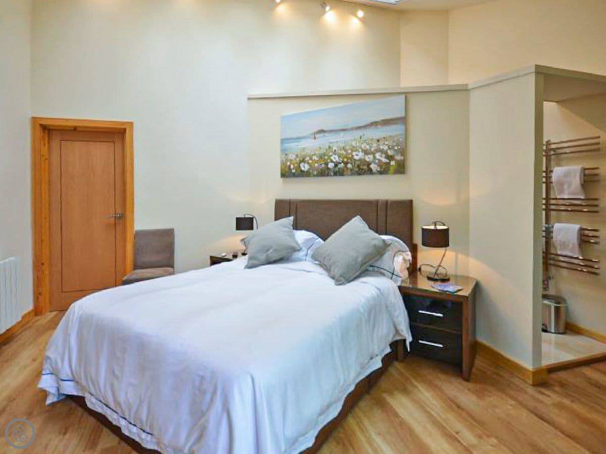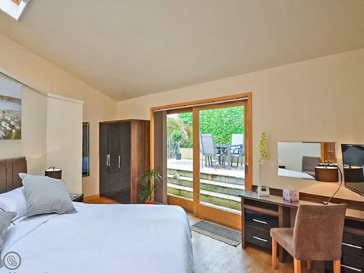 The bedroom area has a king-size bed and big windows that look onto the patio. The blinds are electric. The bathroom is a wet-room style, so the shower is in the corner. It's fine.