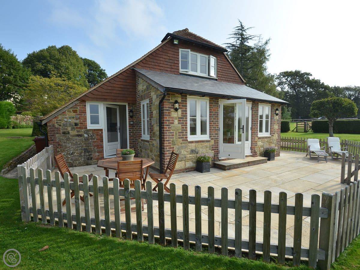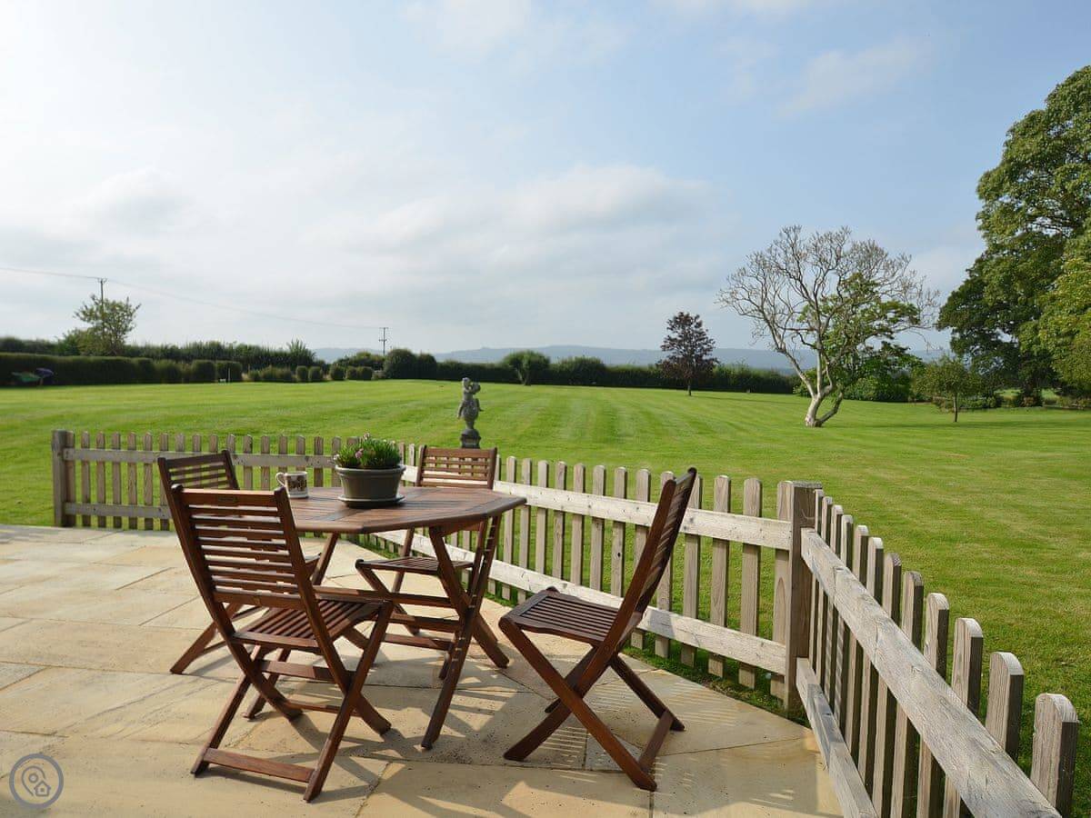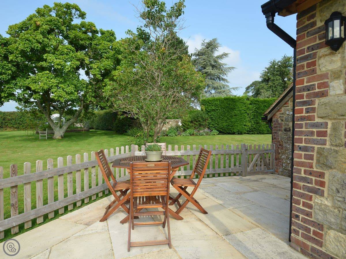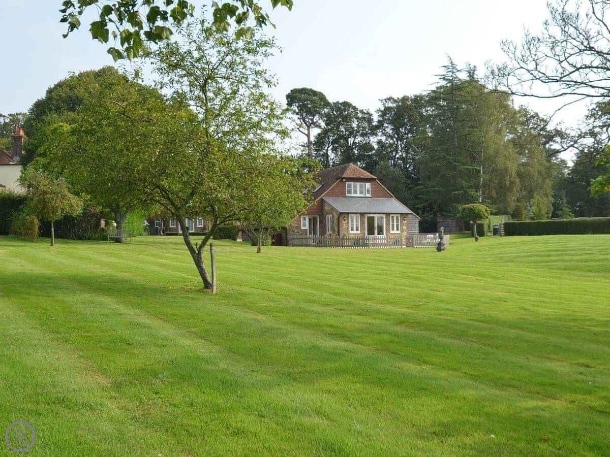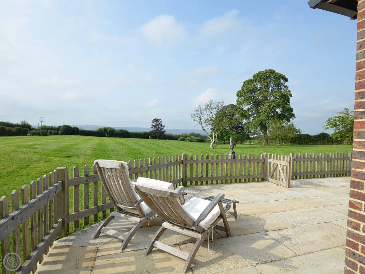The main thing about the place is the view. The front looks straight out over fields to Petworth House parkland. The back terrace gets the sun and has the same view over the garden to the South Downs. There are sun loungers and a table out there.