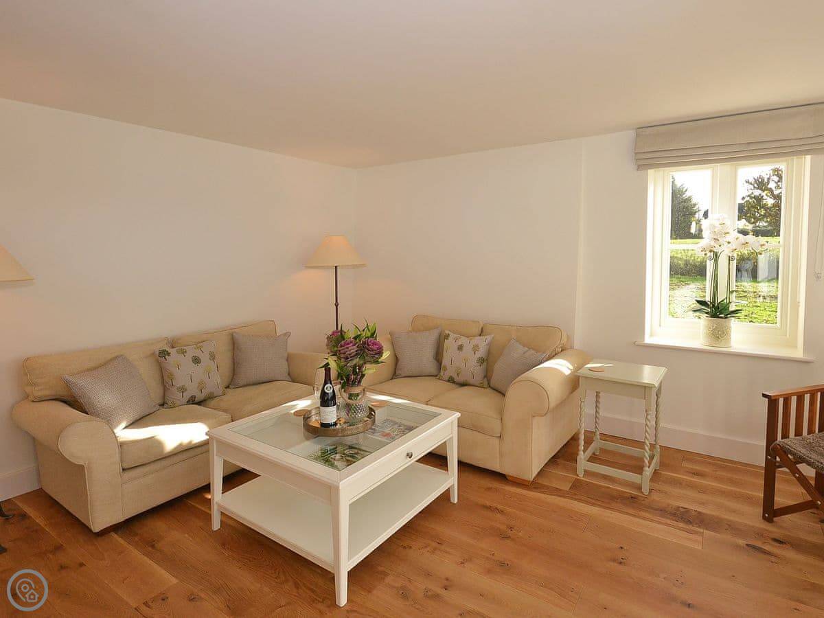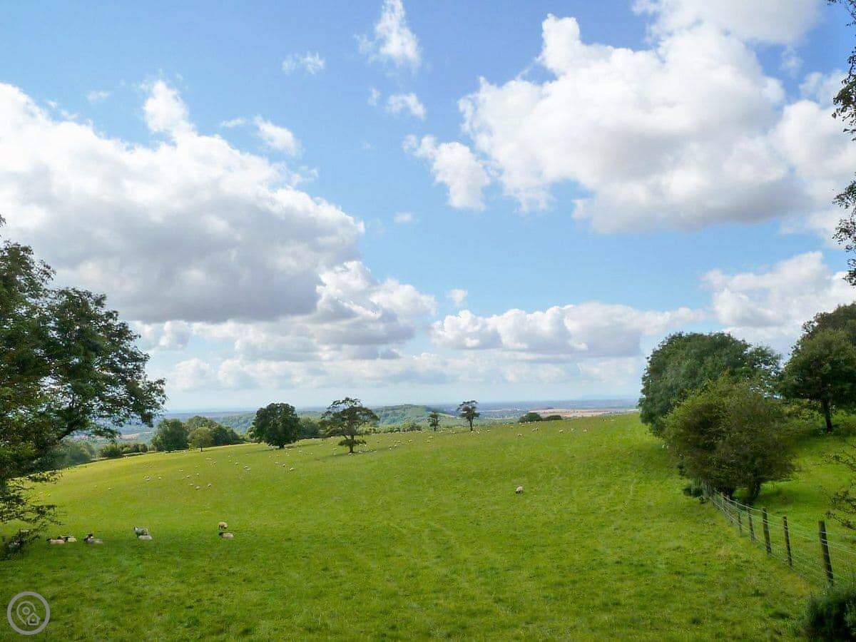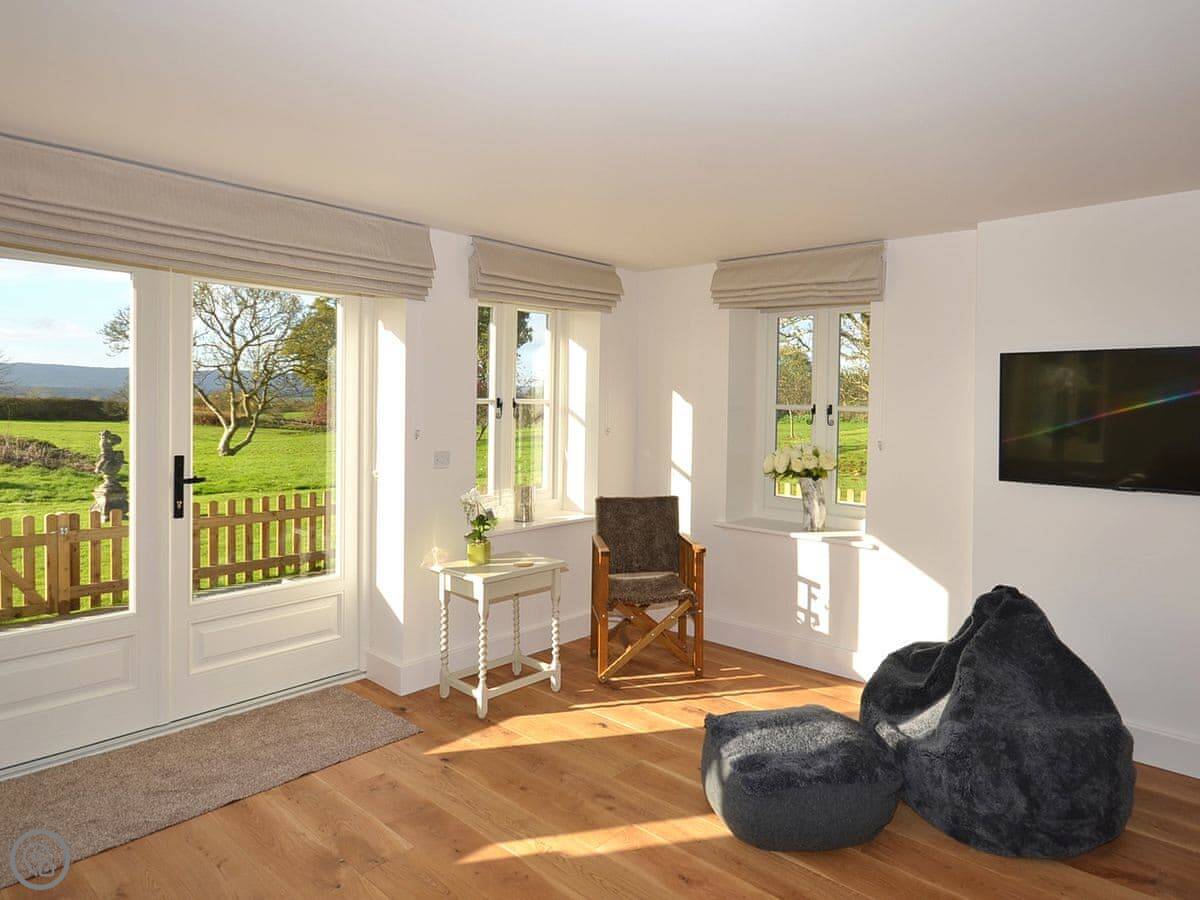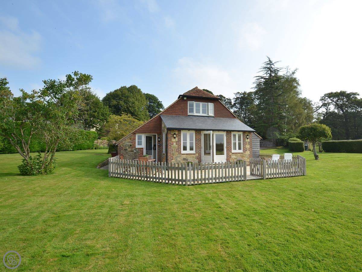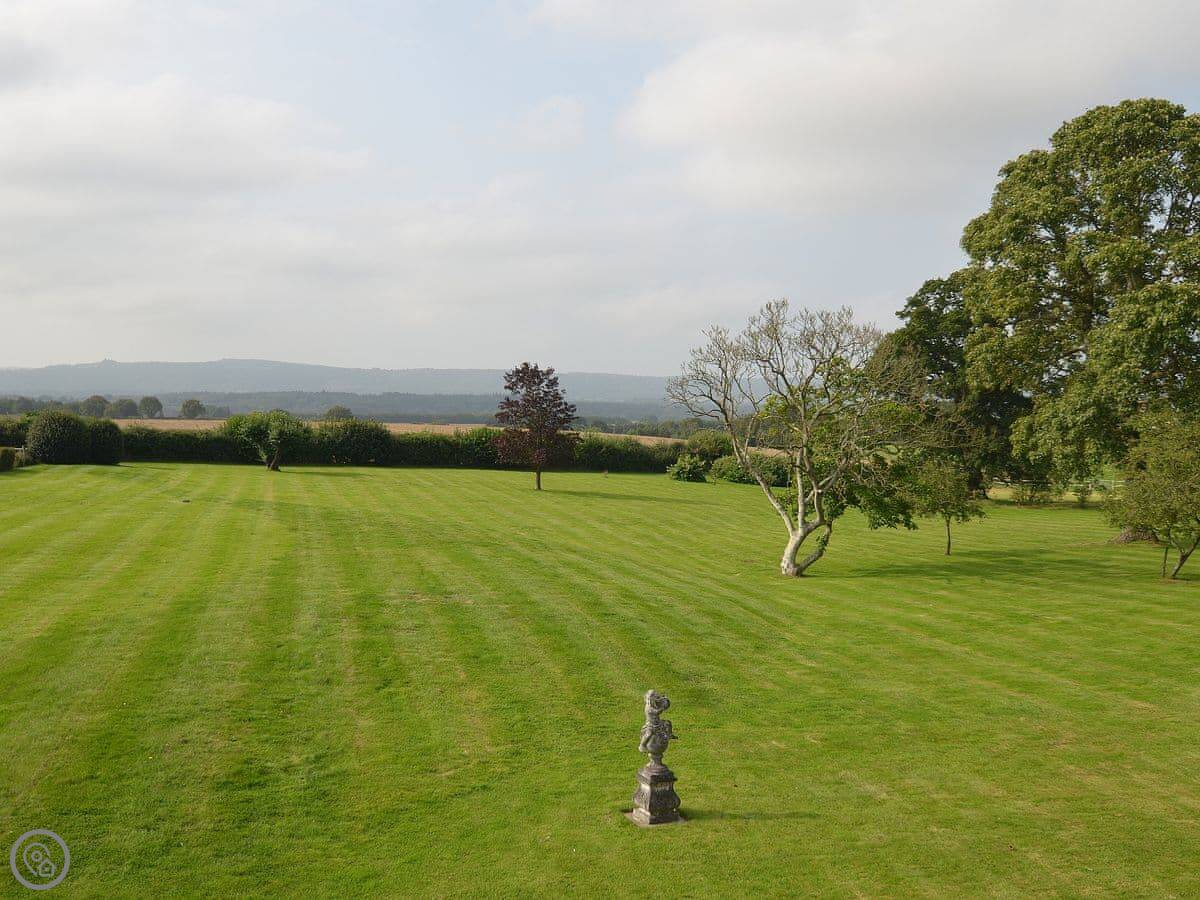 The main thing about the place is the view. The front looks straight out over fields to Petworth House parkland. The back terrace gets the sun and has the same view over the garden to the South Downs. There are sun loungers and a table out there.
