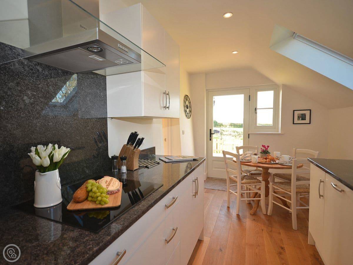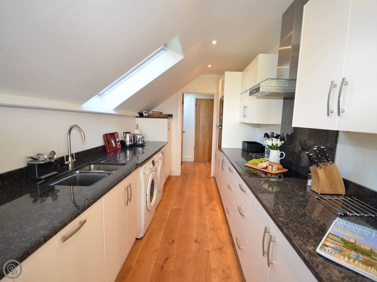 The stairs are fine. The kitchen is a galley style, so it's long and narrow, but it's well equipped. There's underfloor heating downstairs for cooler days.