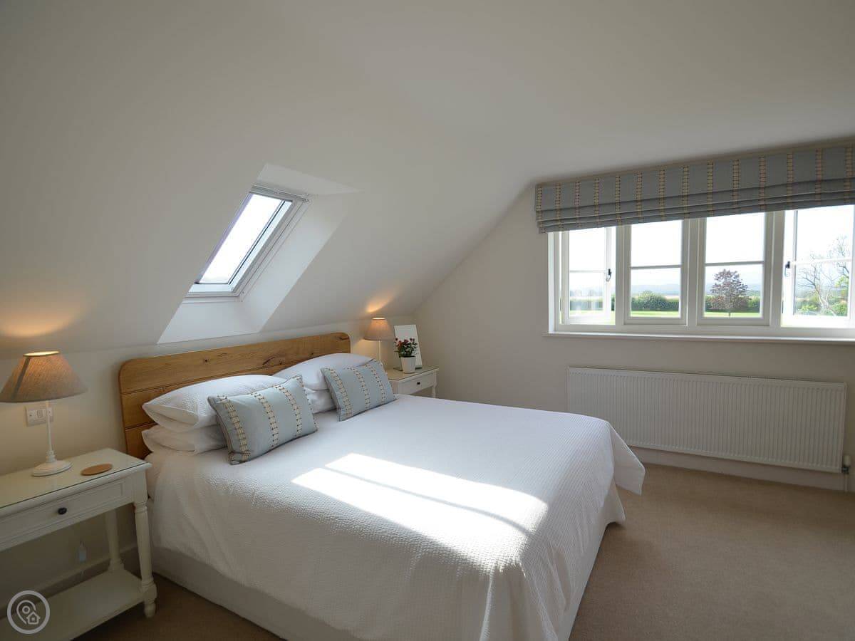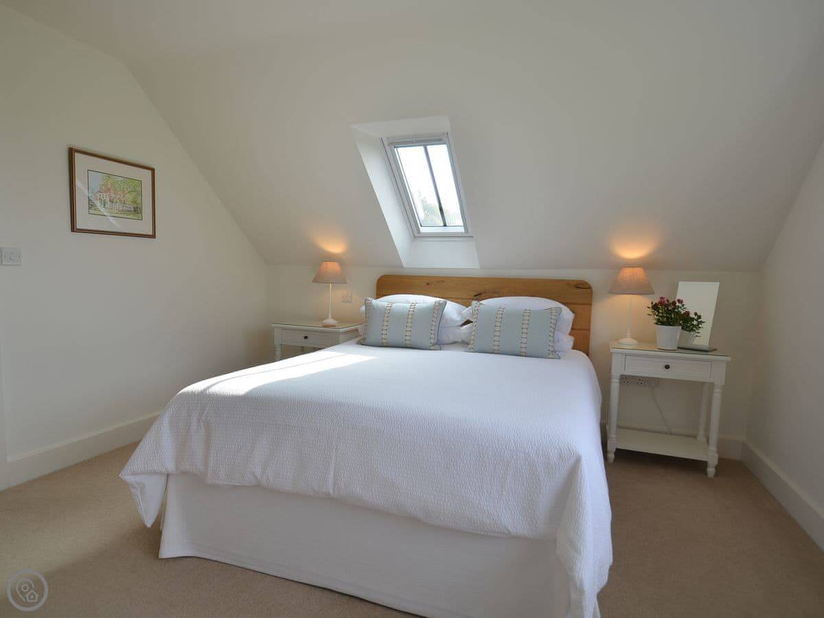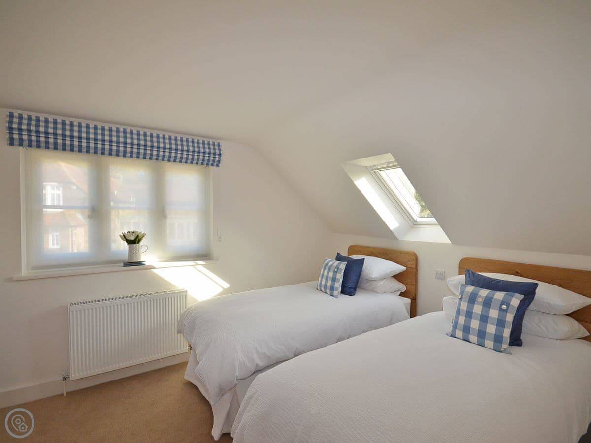 It sleeps four. Two bedrooms and two bathrooms. Upstairs is the main bedroom with a king-size bed and a twin room. The family bathroom is between them. Downstairs there's another shower room, which is handy.