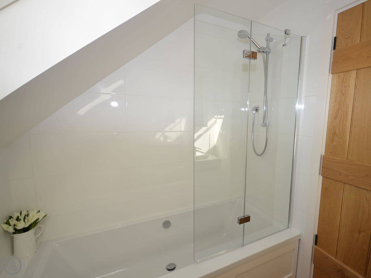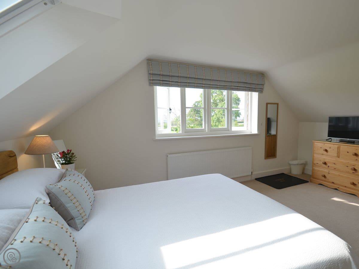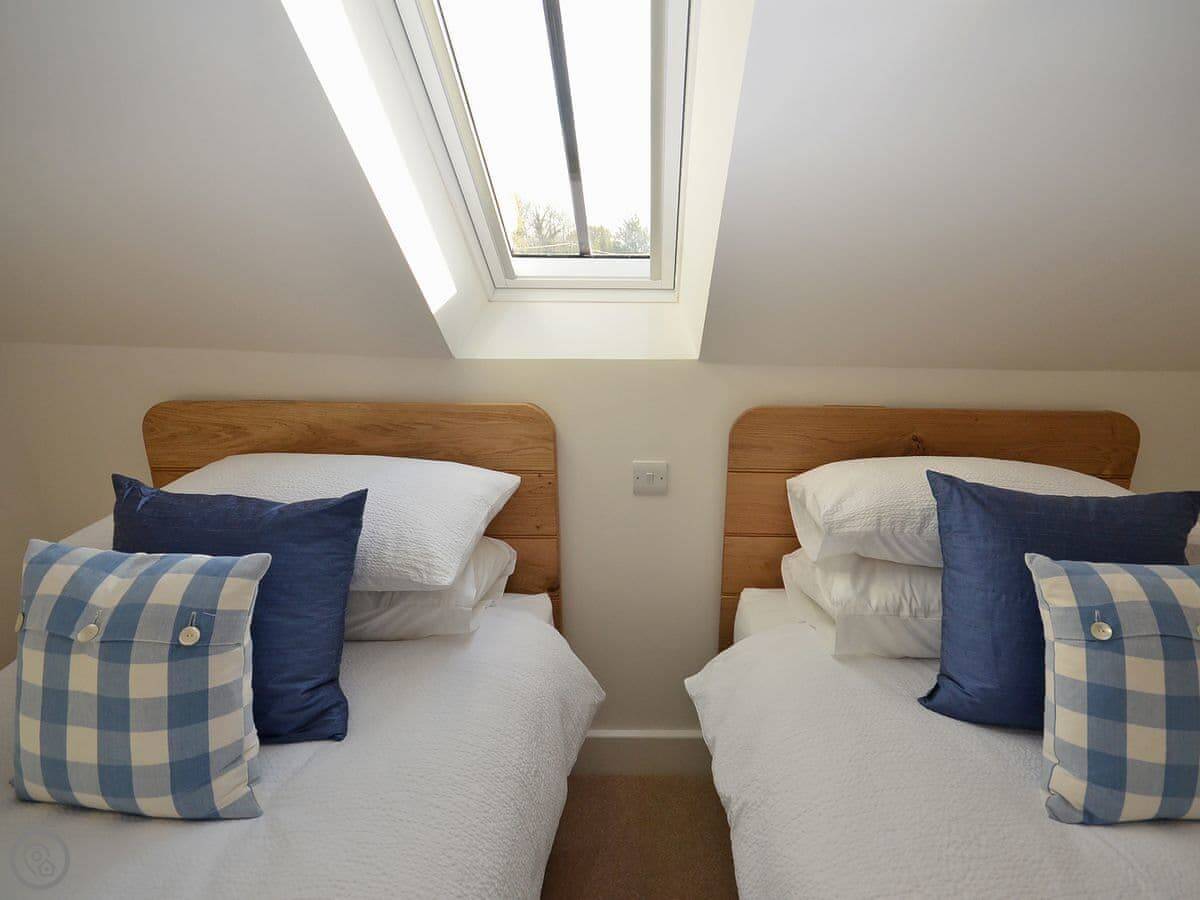 It sleeps four. Two bedrooms and two bathrooms. Upstairs is the main bedroom with a king-size bed and a twin room. The family bathroom is between them. Downstairs there's another shower room, which is handy.