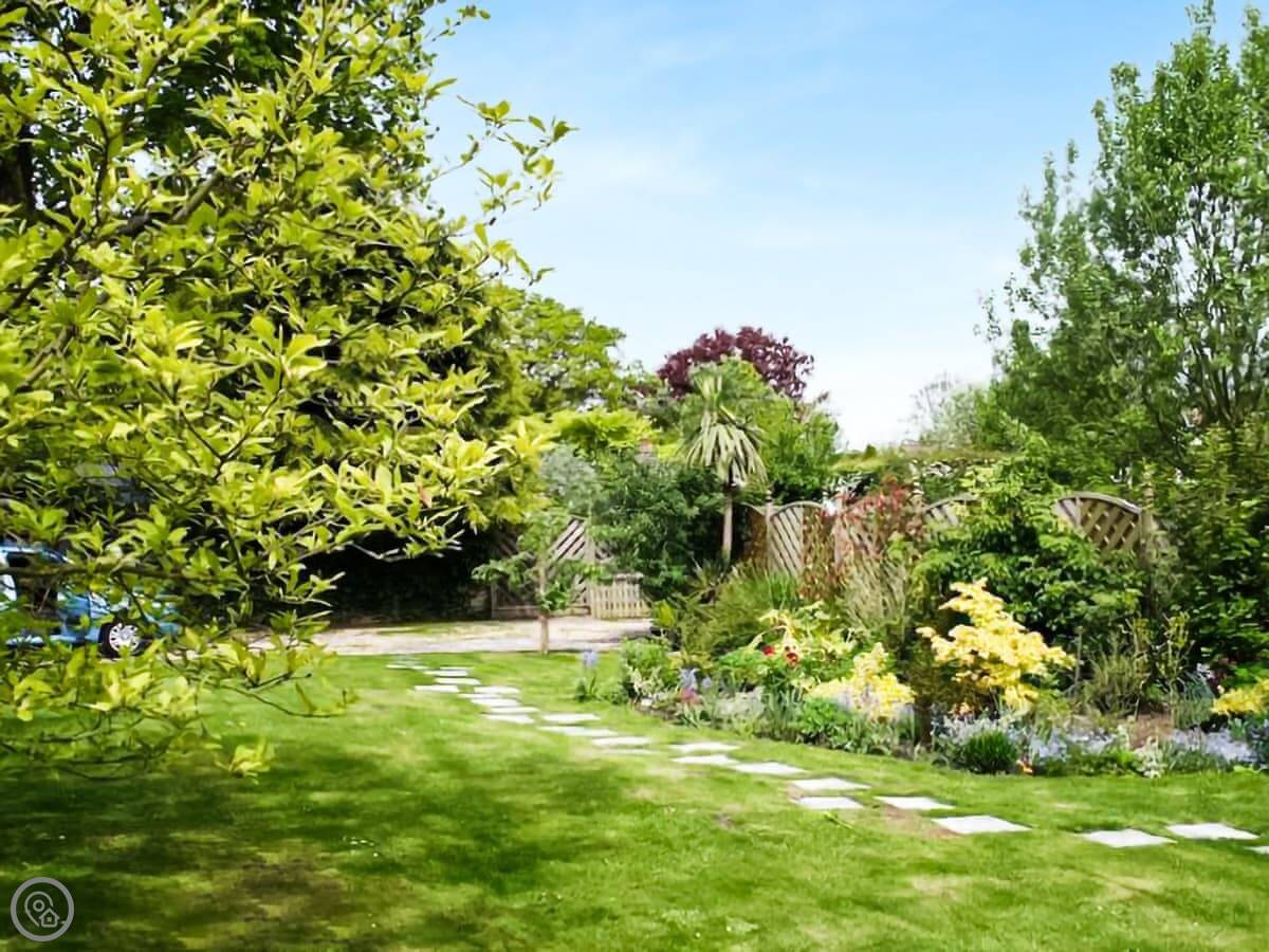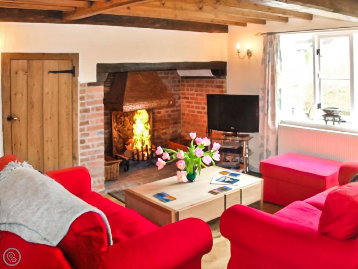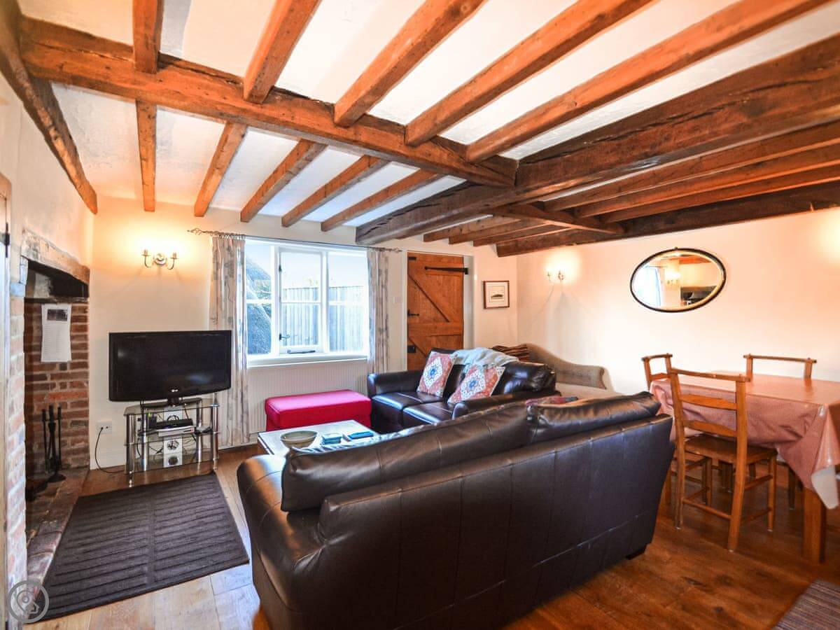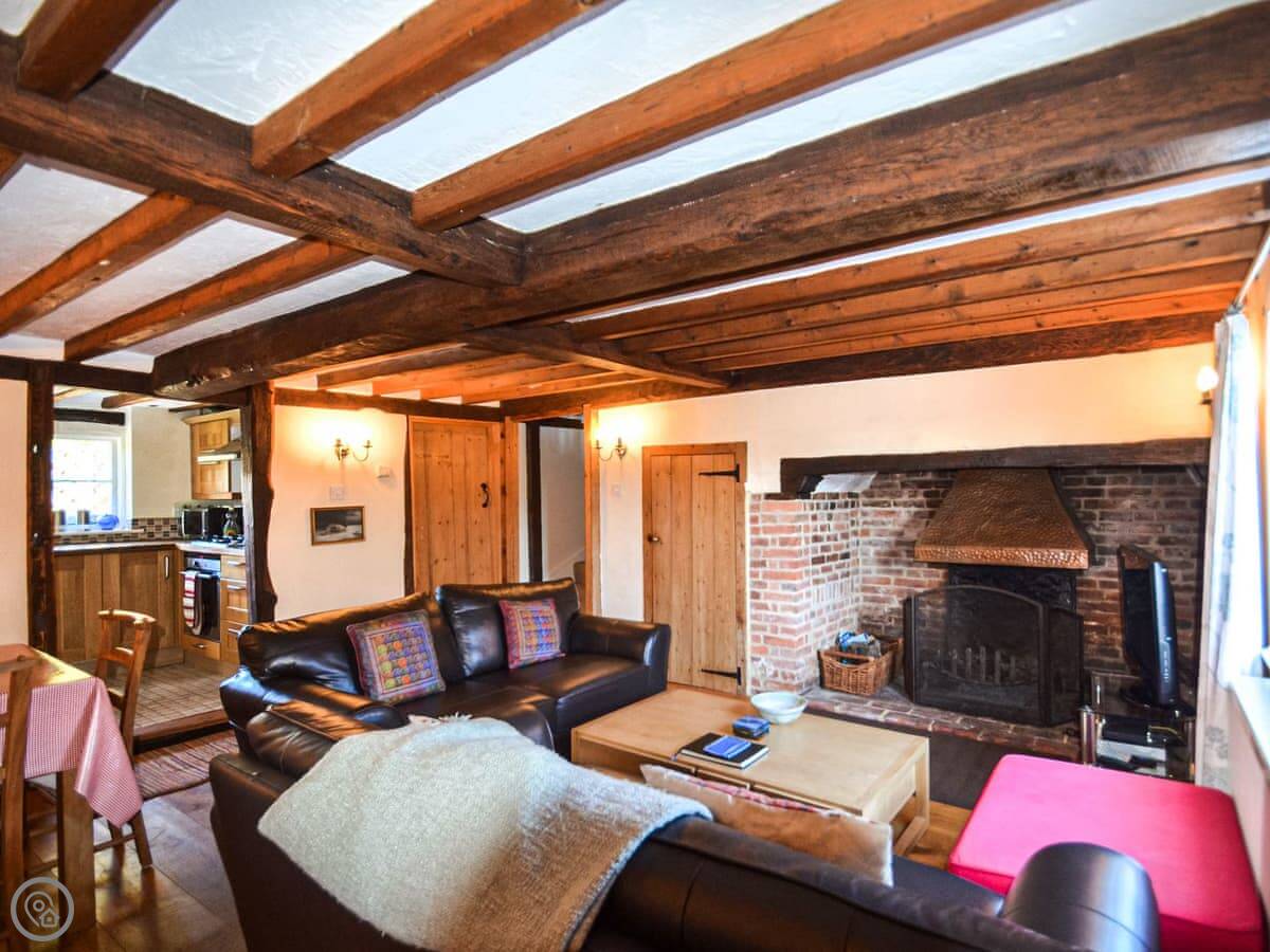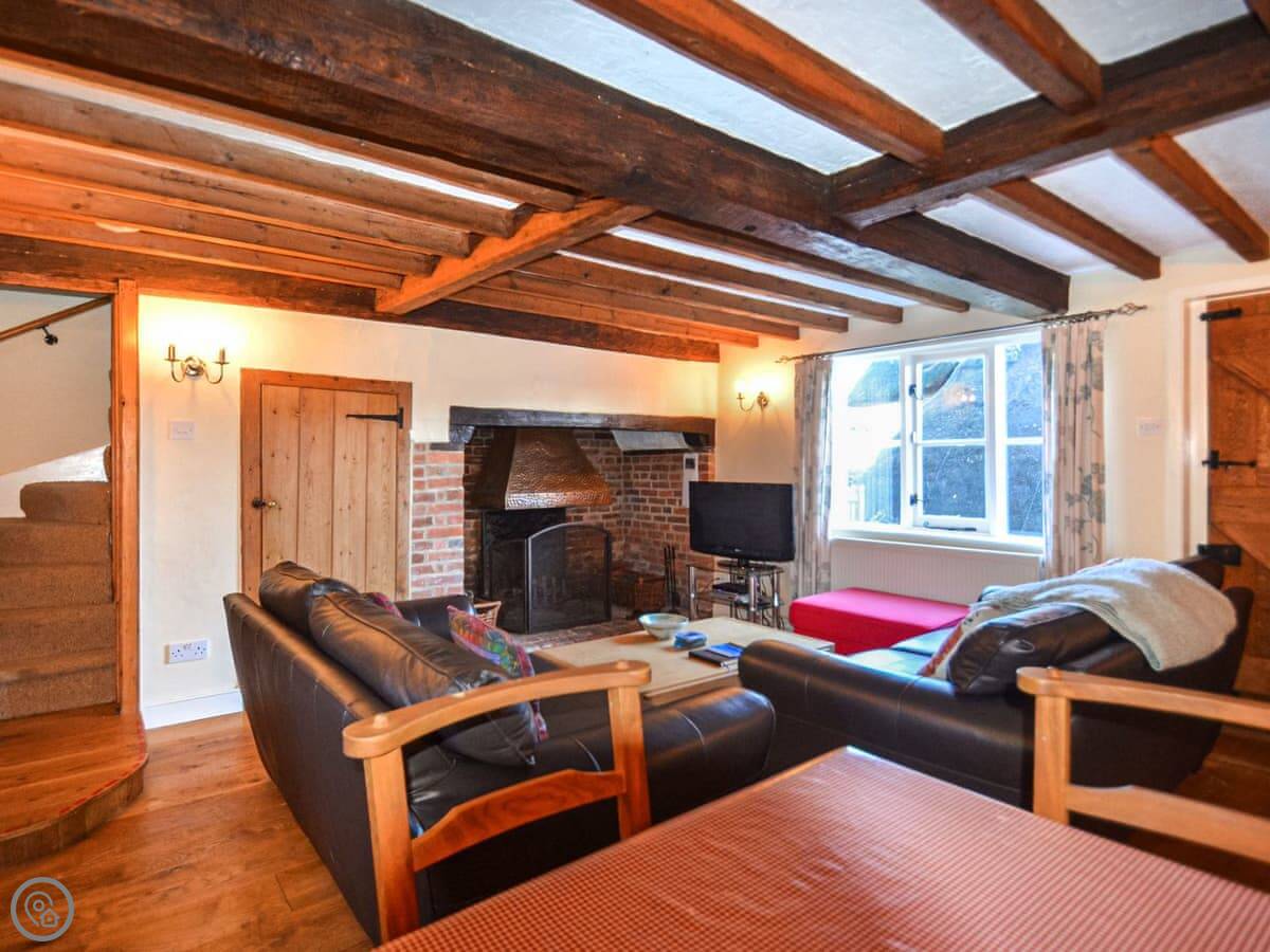 The main room is a combined lounge and dining area with a big inglenook fireplace. You can have an open fire. It's beamed. The garden is sizeable and enclosed, with a patio area right outside the kitchen door.