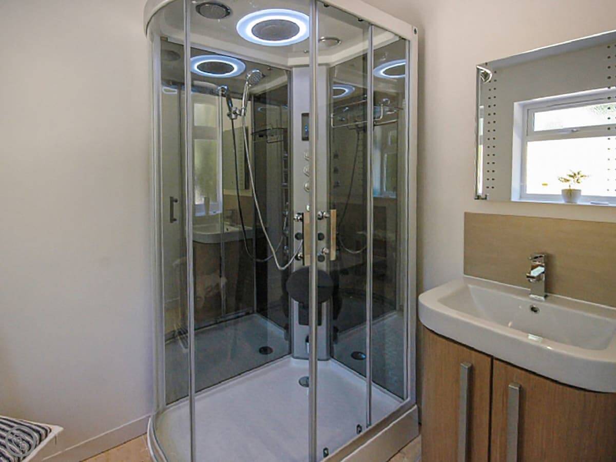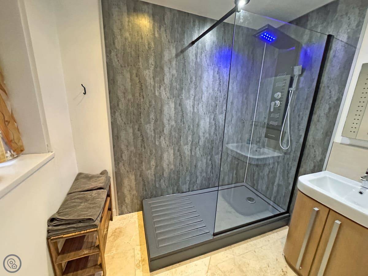 Inside, it's open plan. There's a TV, WiFi, a washing machine, and bedding and towels are included. The shower is in the bathroom. There is no bath.