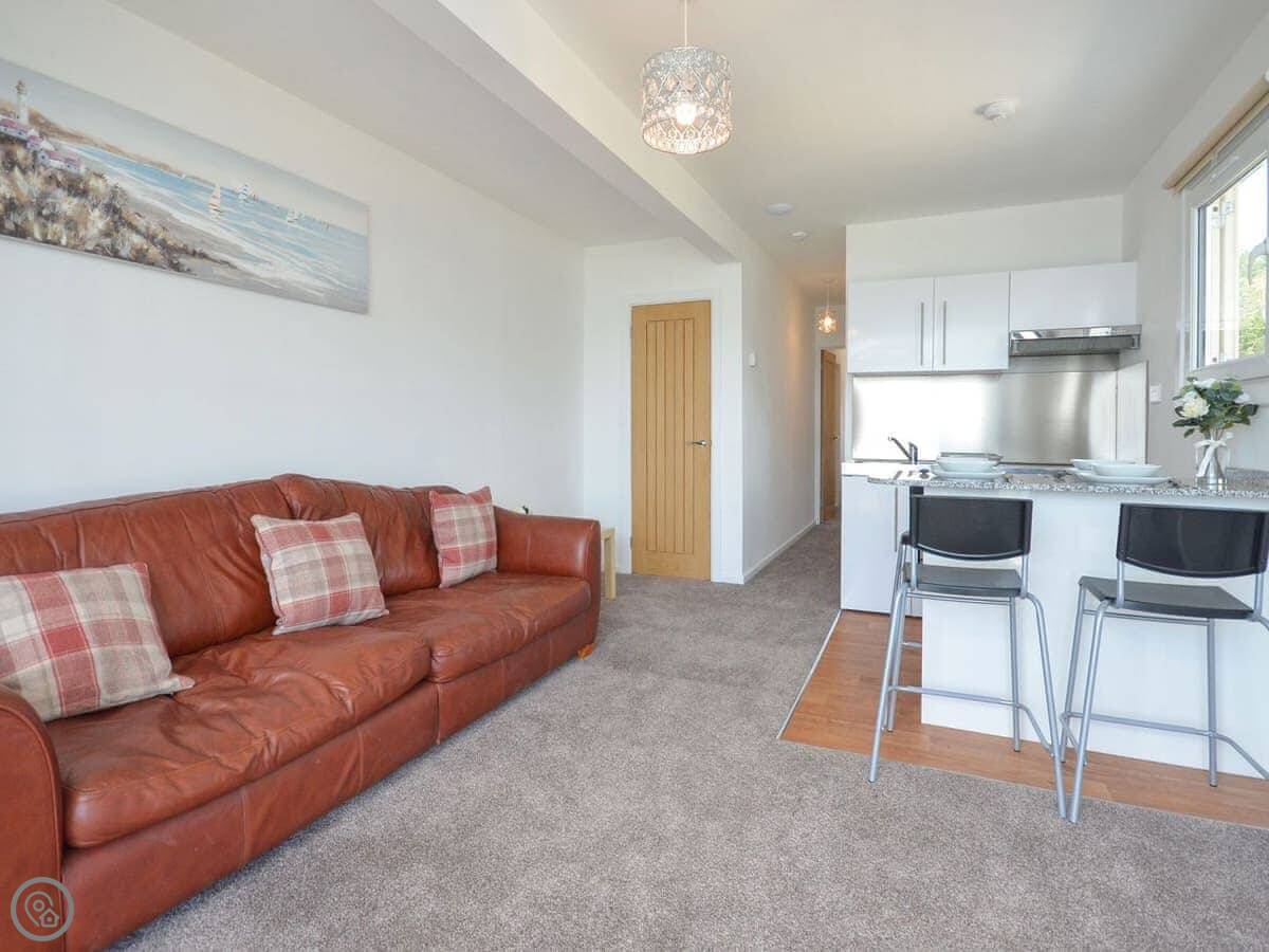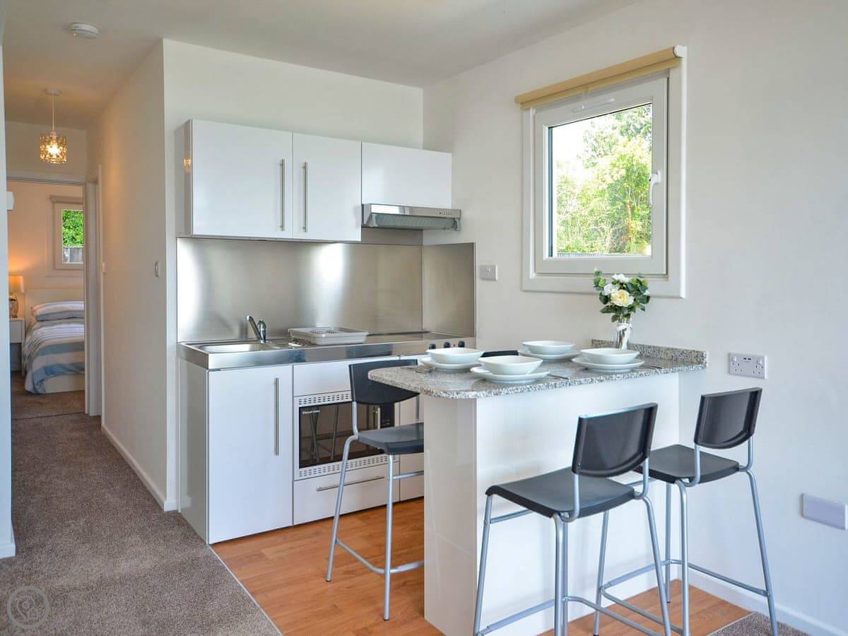 The living area and kitchen are combined. The kitchen has a two-ring electric hob and a combi microwave oven. It's fine for basic meals. There's a TV and WiFi. All your bedding and towels are included.