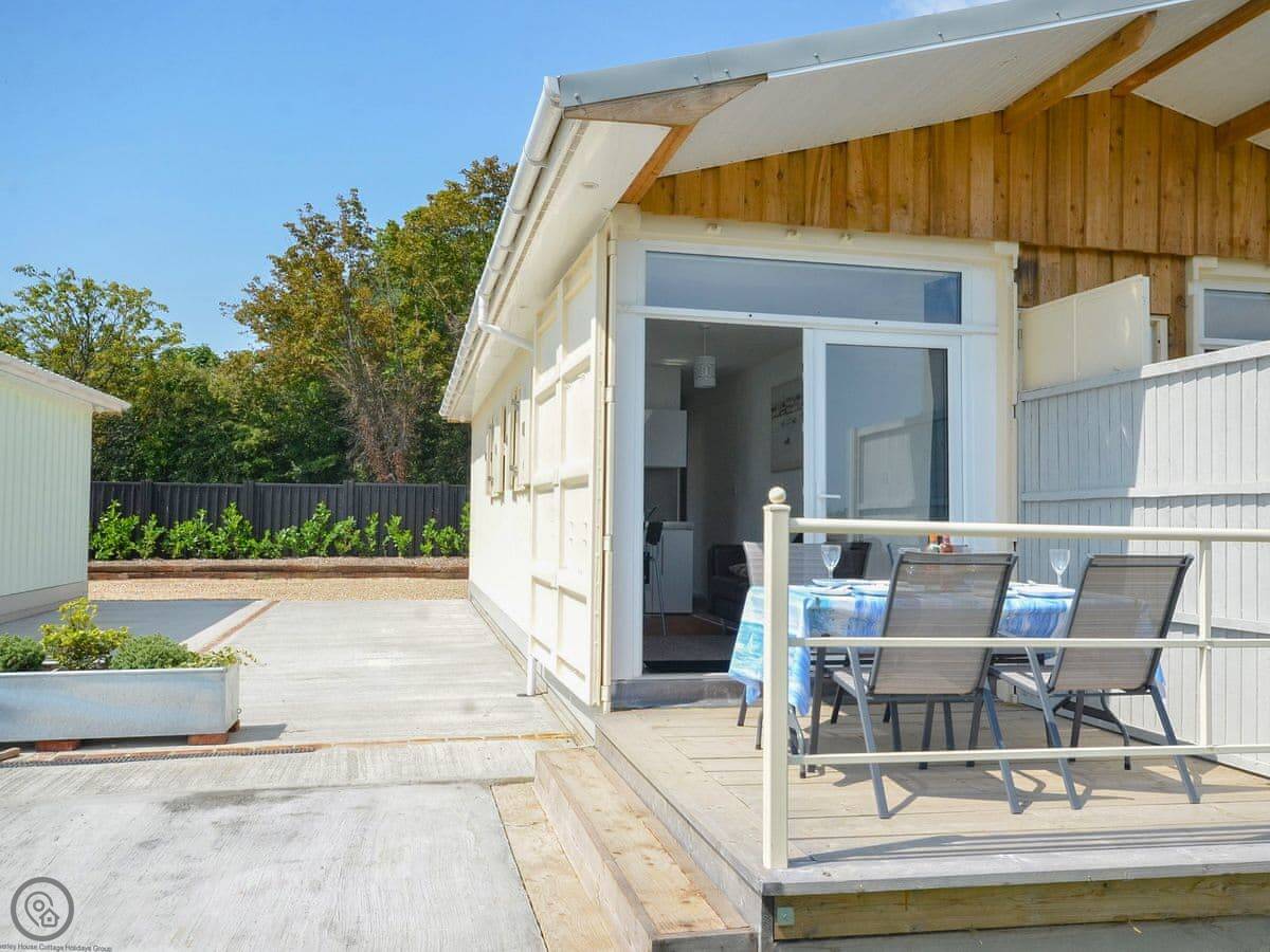 Lake Lodge 2 is one of three identical lodges on the Chichester Water sports site. It's all on one floor. It sleeps four in two bedrooms and has one bathroom. It's got a 4 Star rating, so it's decent and clean. It's compact. I'd say it's best for a couple or a small family.