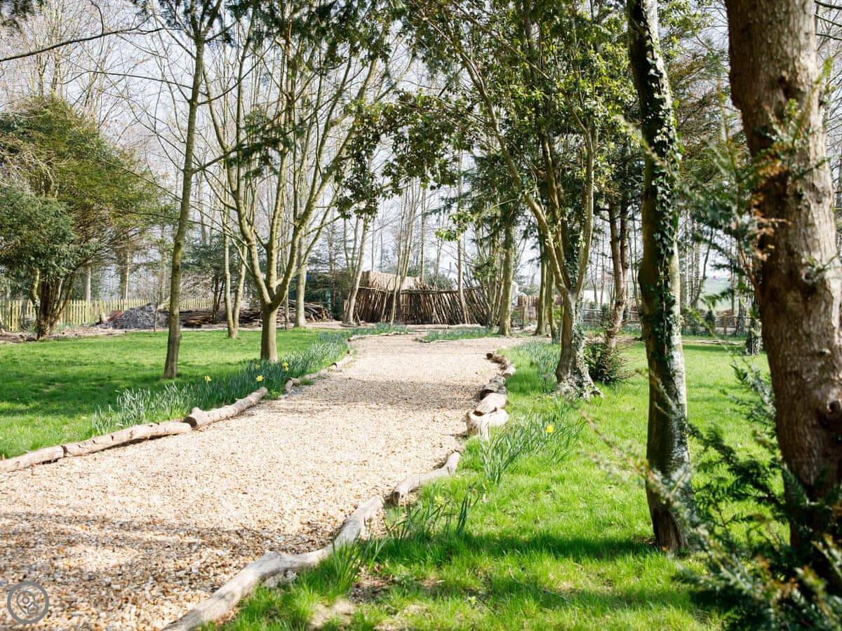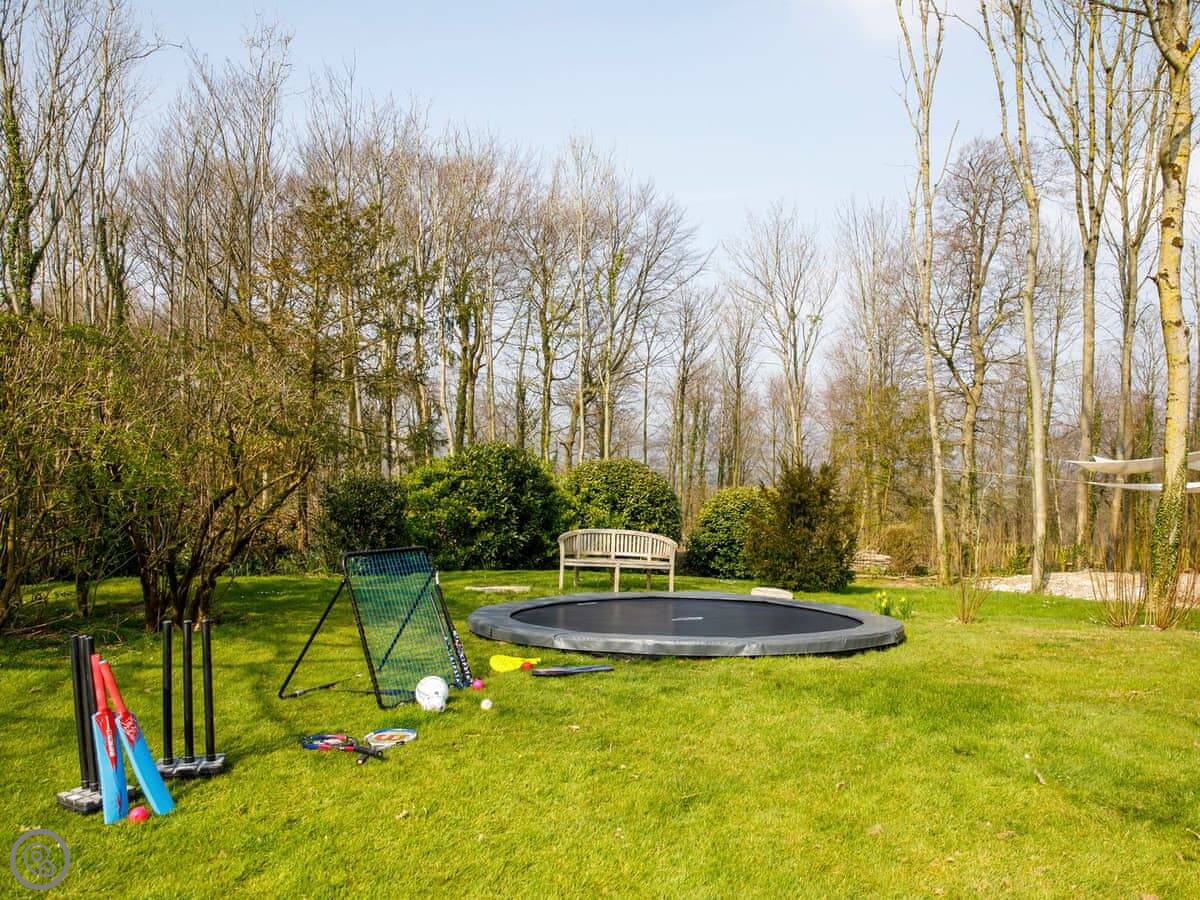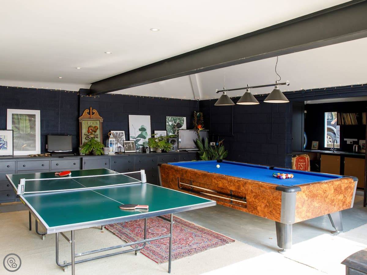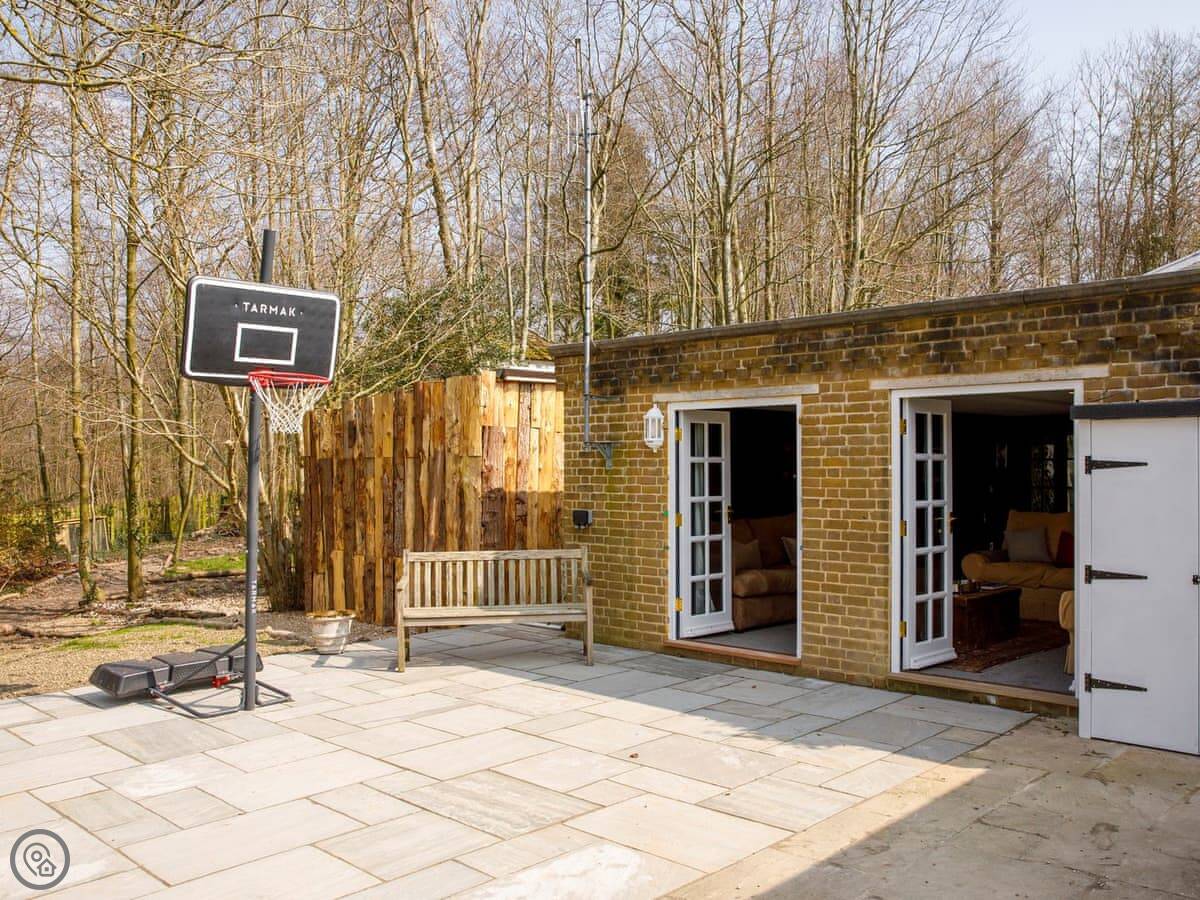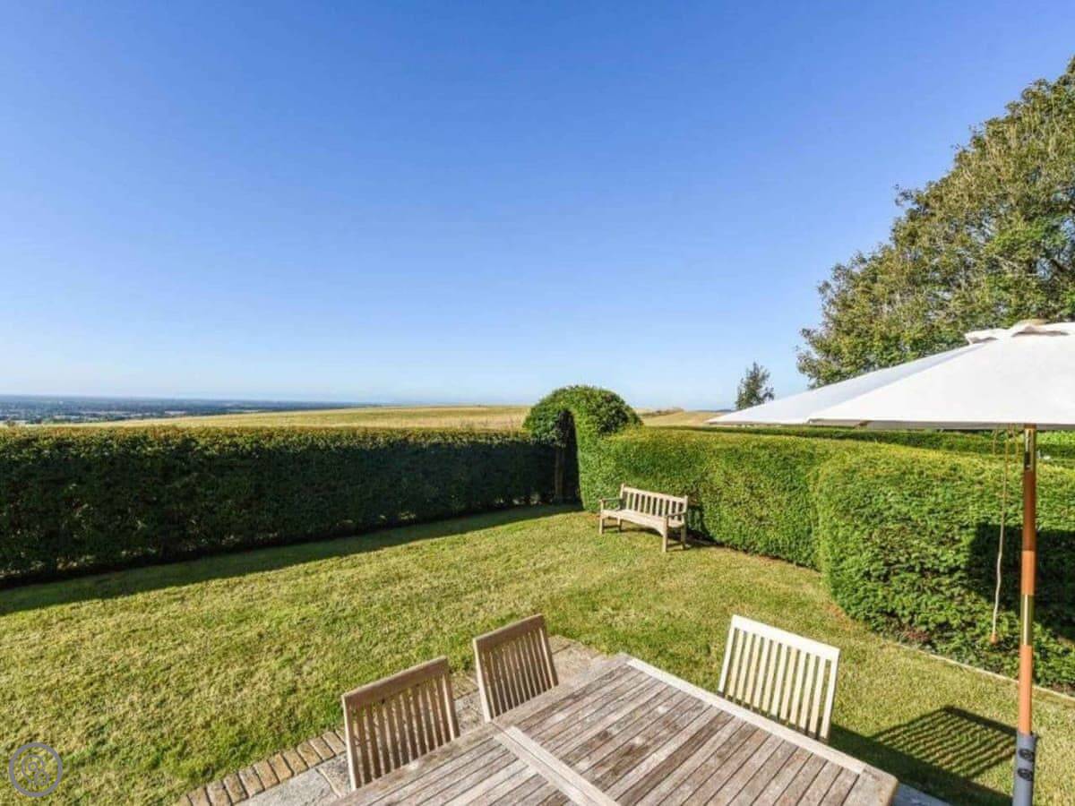 Outside, there are a couple of outbuildings. One is a games room with table tennis and a snooker table. The other is the music room. The grounds are large, with a lawn and a woodland trail. You can walk straight out of the gate onto the footpaths across the South Downs. The Trundle, which is an old hill fort, is right next door.