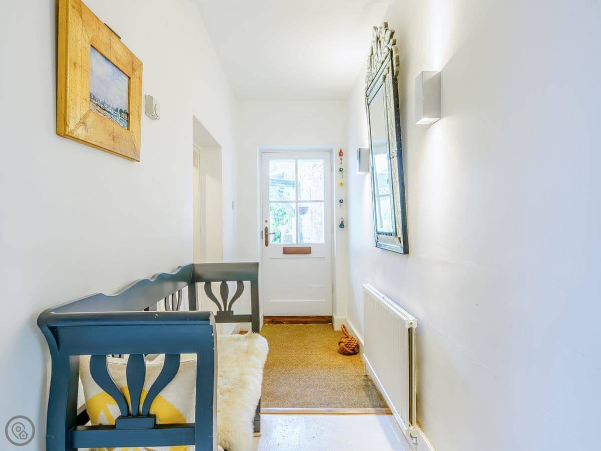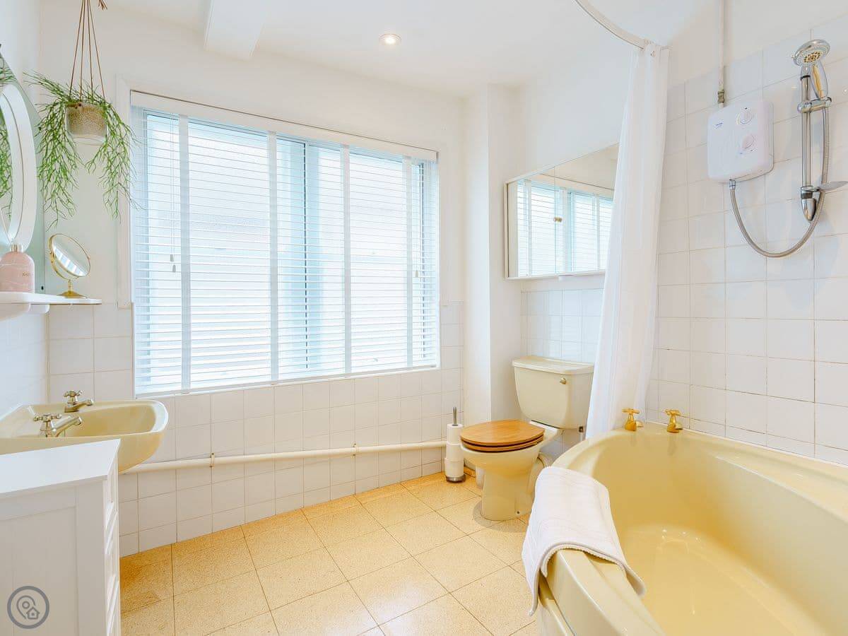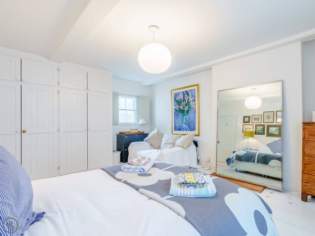 It sleeps four, with two bedrooms. Both rooms have king size beds. There's one bathroom upstairs with a corner bath and a shower over it, and a separate cloakroom downstairs.
