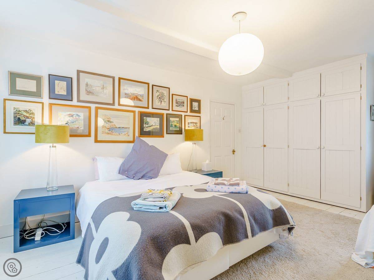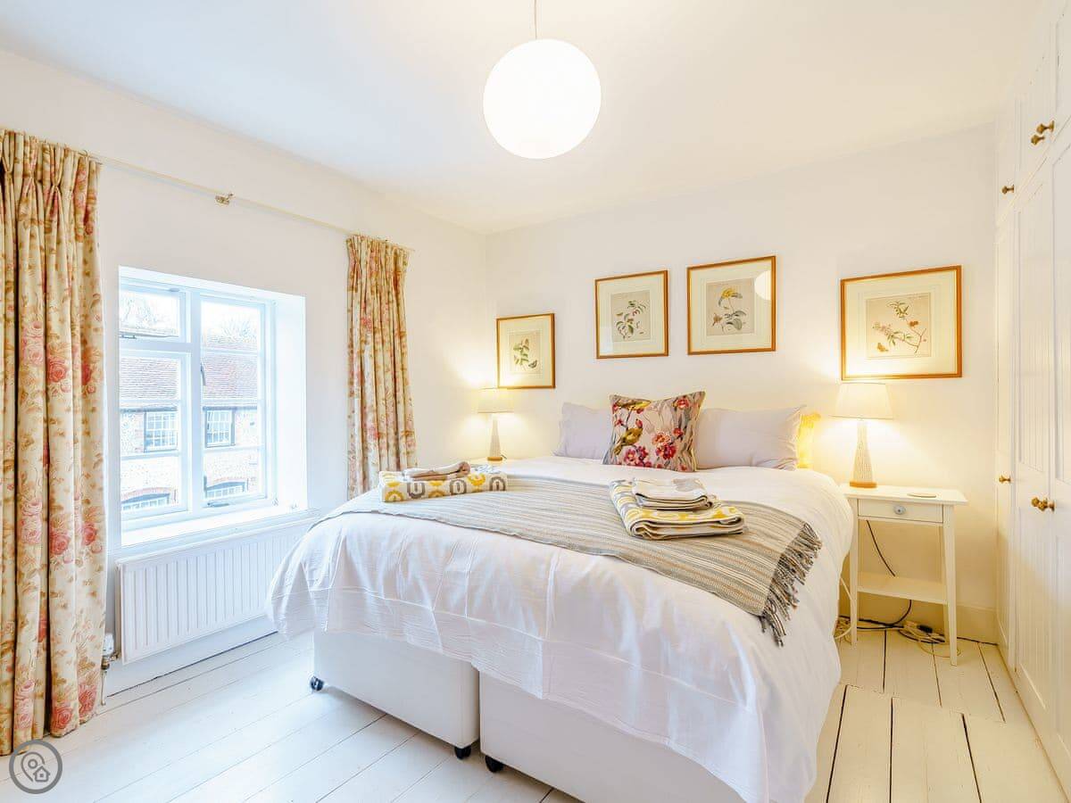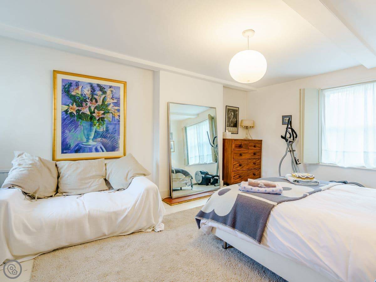 It sleeps four, with two bedrooms. Both rooms have king size beds. There's one bathroom upstairs with a corner bath and a shower over it, and a separate cloakroom downstairs.