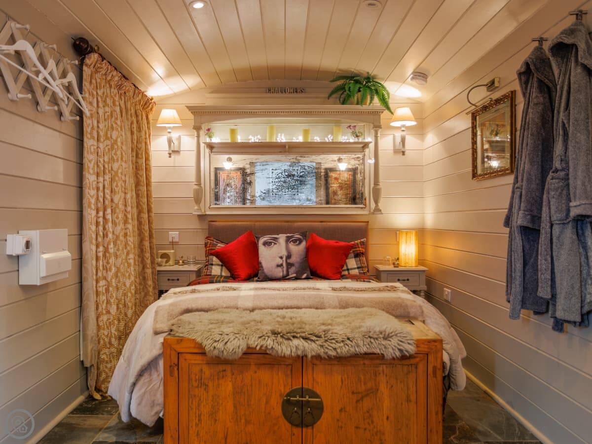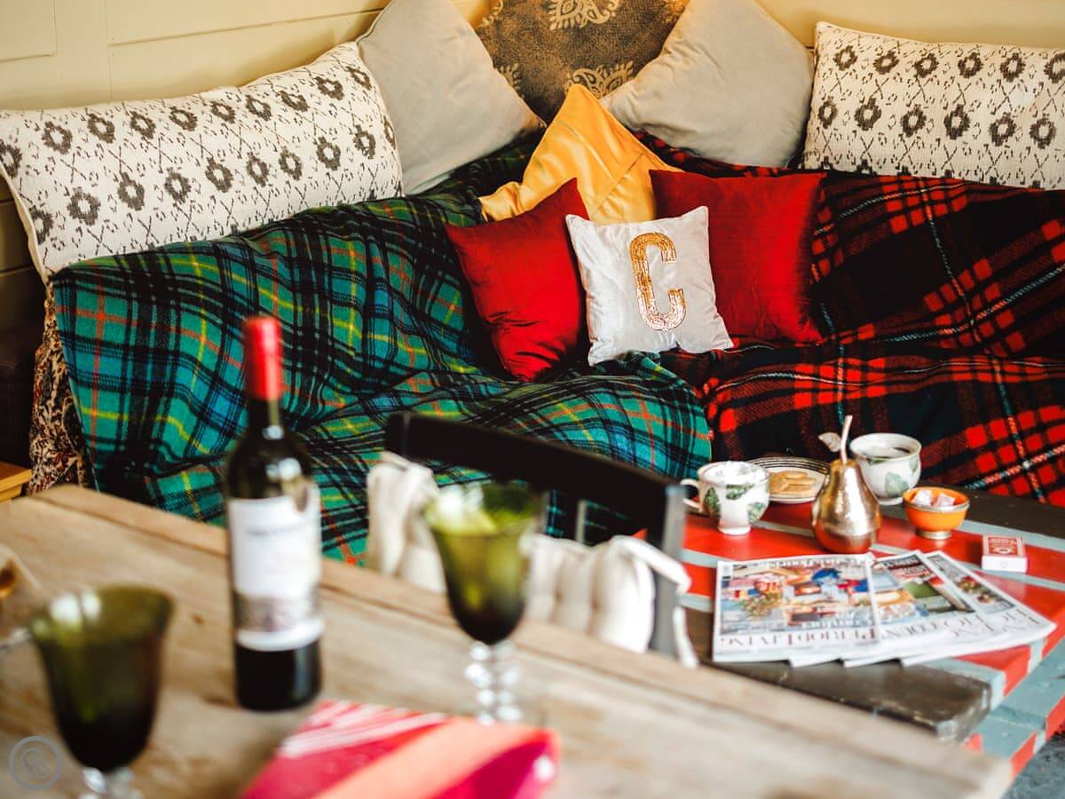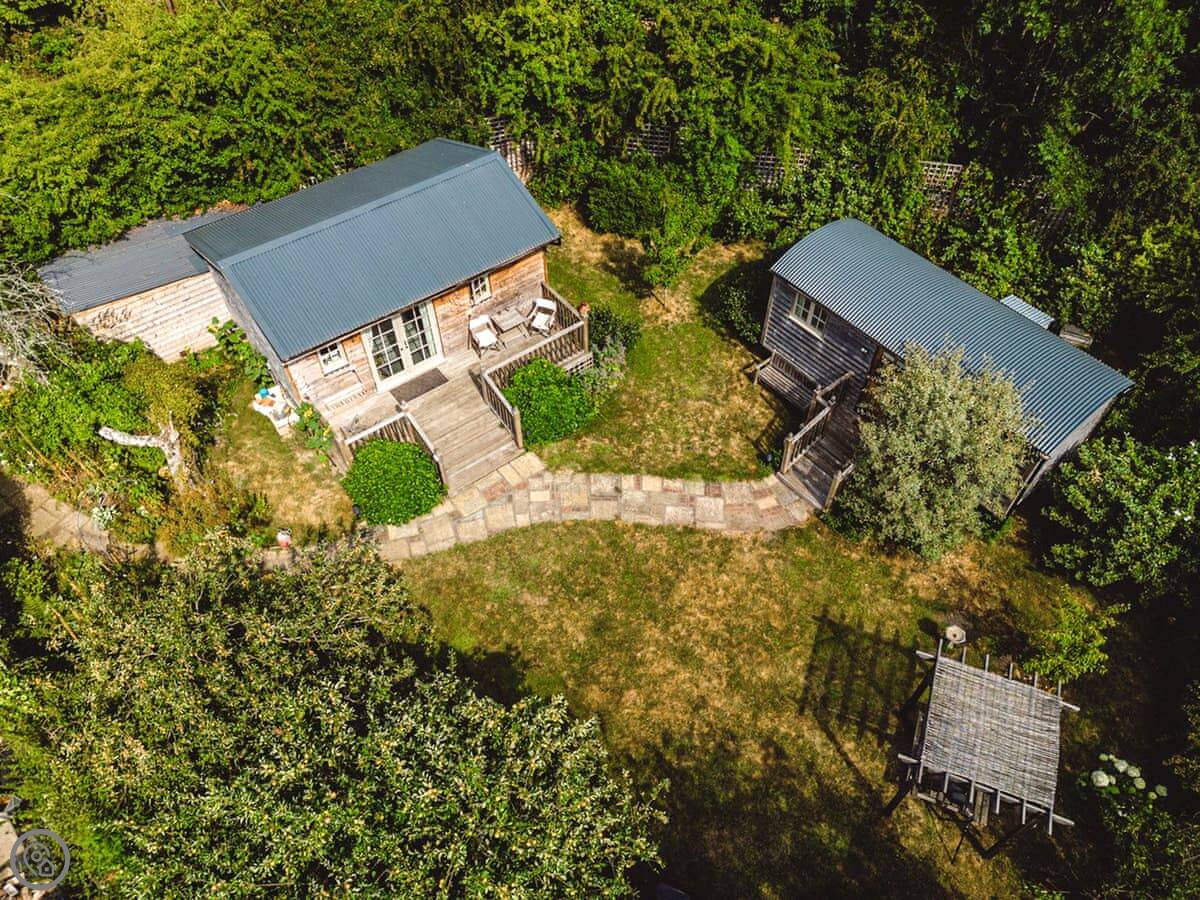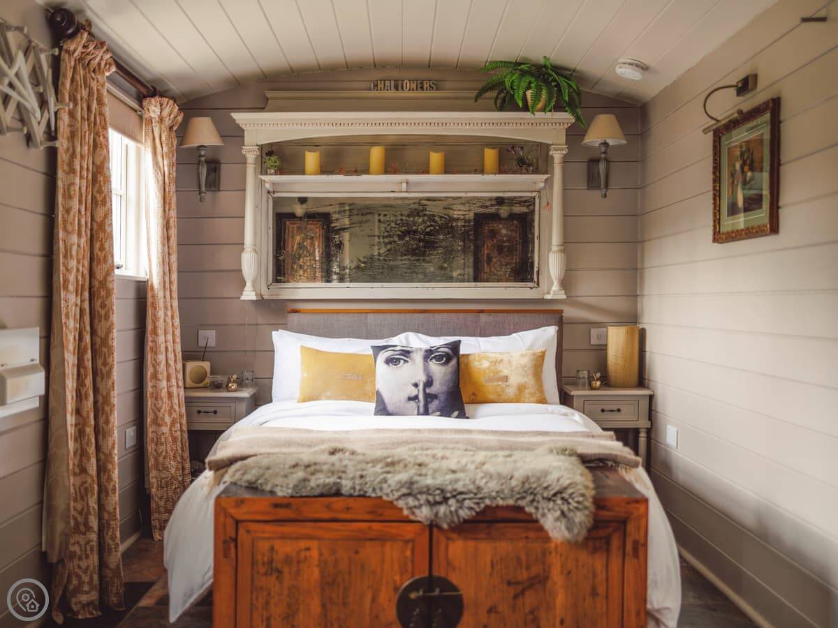 The Challoners is nestled in the heart of the East Sussex Weald and redefines what to expect from a premium glamping holiday experience. As you enter through the gate, your two wood-clad cabins greet you unassumingly, but step inside and the lavish attention to detail can really be appreciated. The shepherd’s hut houses the bedroom which offers a sumptuous Hypnos double bed, while delicate finishing touches include ornate furnishings and an antique electric stove heater. Through double sliding doors is a gorgeous en-suite bathroom with roll-top bath. In a separate lodge, are your living quarters. Adorned with chic rustic style, this too is exclusively yours and features an open plan living space complete with large corner sofa and a selection of books, games, and puzzles. For ultimate comfort and convenience there is also a walk-in shower room. Both cabins feature underfloor heating throughout for cosy winter evenings in this wonderful self-catering retreat.