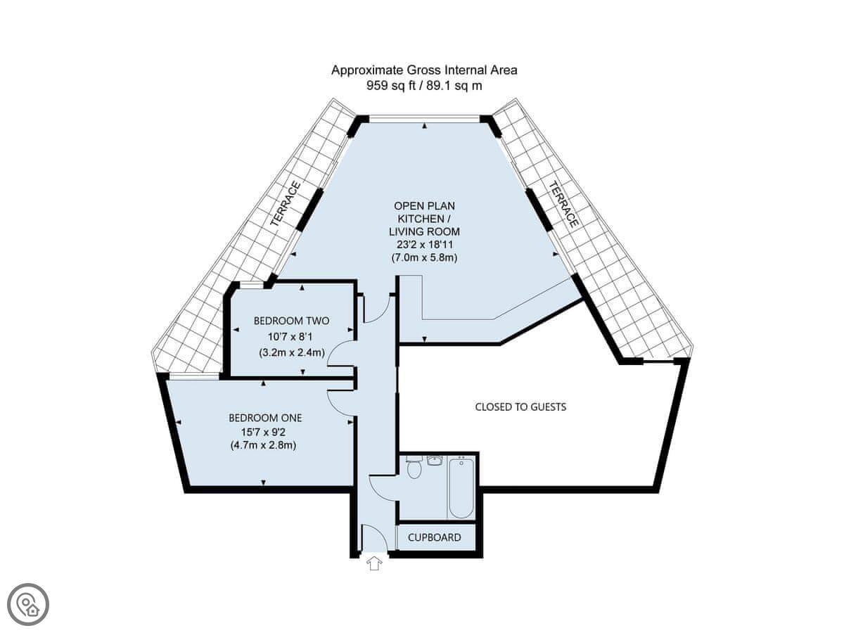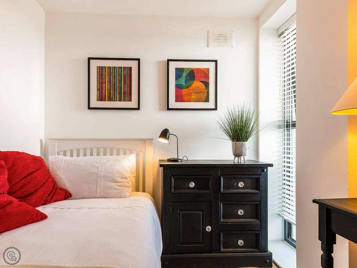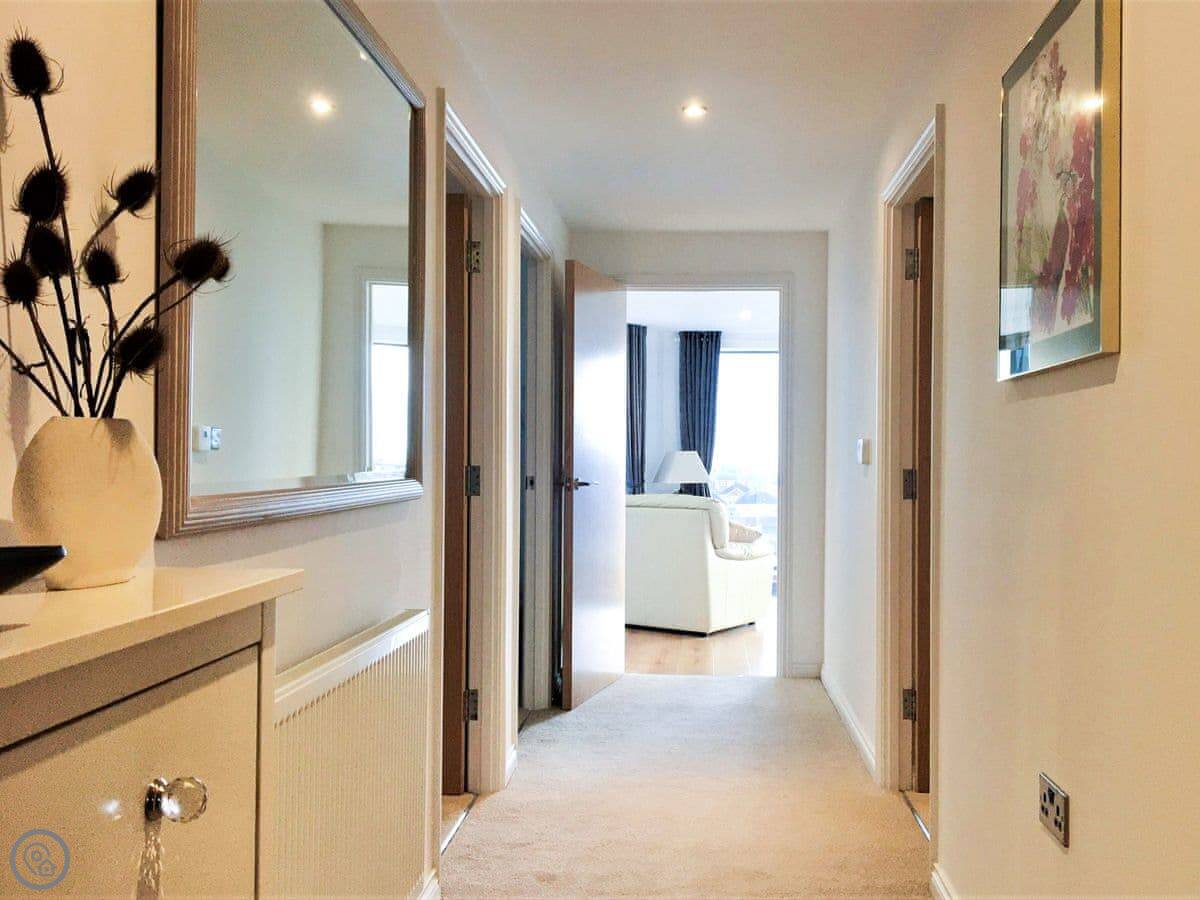 The living space has been carefully arranged to make the most of the views; the comfortable sofas look out over the ever-changing landscape with the dining table and well-equipped sleek white kitchen sitting just behind. A 43" Smart TV also offers plenty of access to entertainment when the curtains are closed. There are two bedrooms both offering remarkable views south. The inviting, spacious master has been decorated in warm tones and features a kingsize bed, built-in mirrored wardrobes and a TV. The second bedroom is smartly furnished in contemporary style with a single bed and views south over the east balcony. At the top of the hallway, a chic practical family bathroom offers a bath with a shower over and completes this luxury coastal apartment.