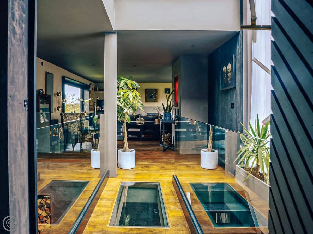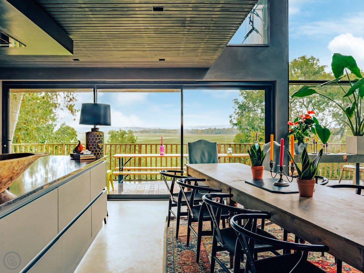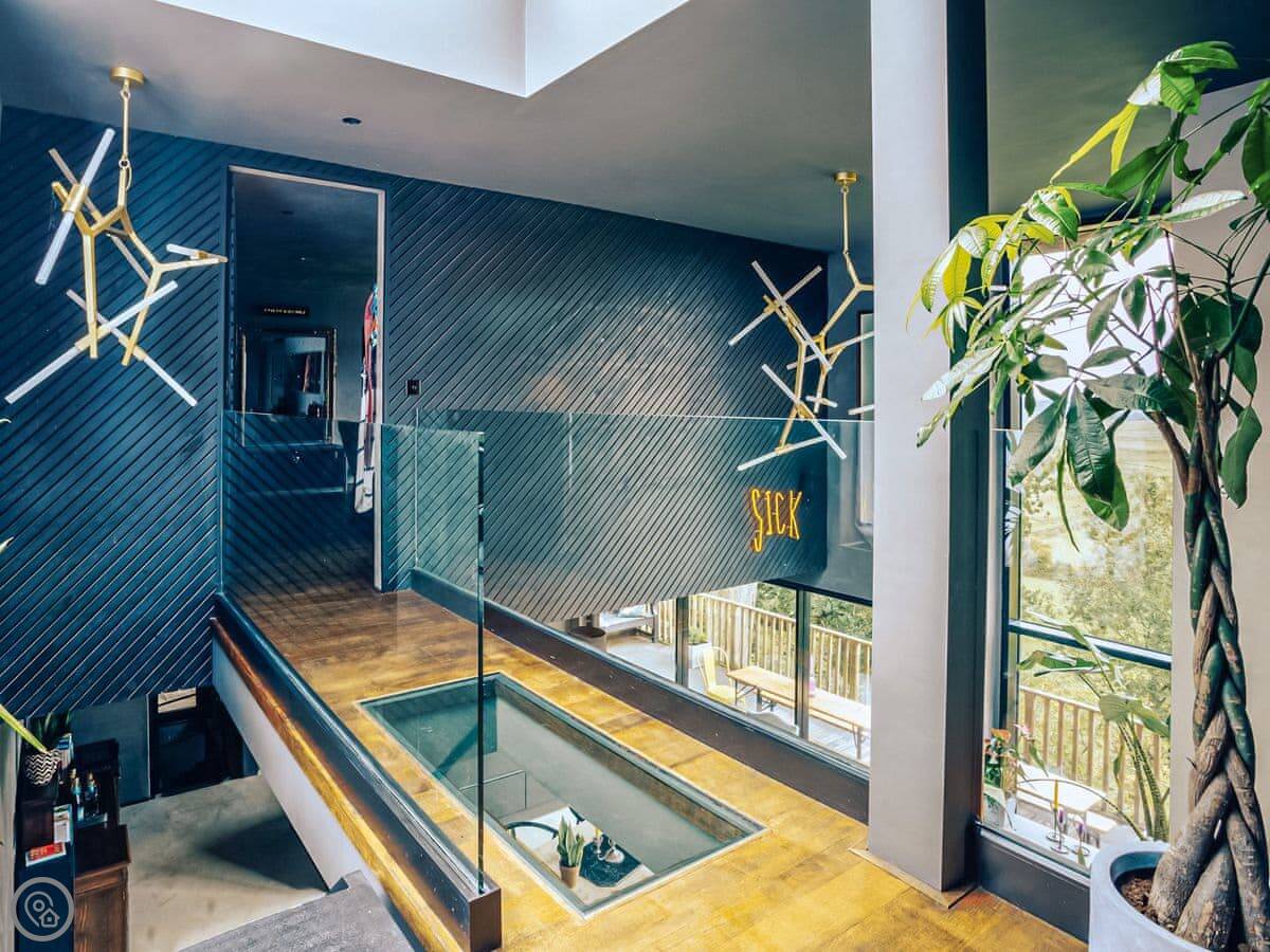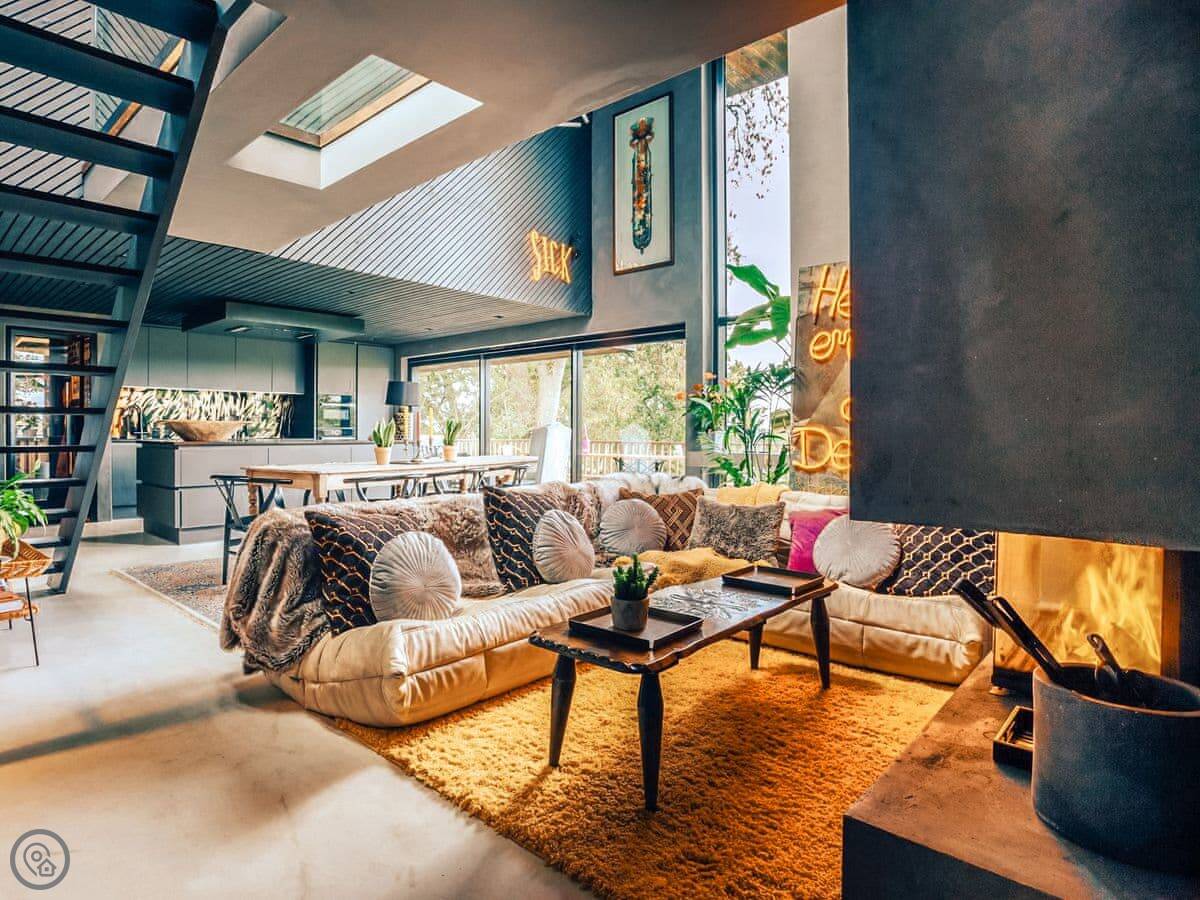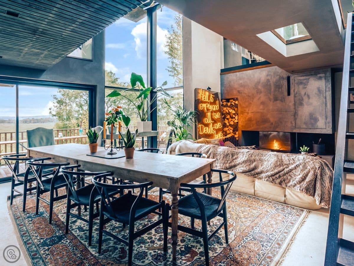 A wonderfully eclectic and playful luxury home in the picturesque village of Amberley, West Sussex. The Rook is a large holiday home sleeping up to 13 guests and offers a wood-fired tub outside, a high end architectural design and stunning views across the Wild Brooks and South Downs. The Rook is as bold in its interior design as it is outside. Clay plaster walls, antiques and contemporary artwork and furnishings adorn the house in a vibrant mix of colours and textures. Through the entrance porch, the cavernous open-plan living space greets you with double-height ceilings and a jaw-dropping panorama across the Amberley Wildbrooks. The kitchen and dining table sit in front of wide doors which lead out onto a long terrace. Heading up the open staircase from the kitchen, the first floor galleried landing is a gloriously spacious, double aspect room with a huge corner sofa, flatscreen TV and a projector. Across the glass floored bridge at the opposite end of the house is the master bedroom suite sleeping four guests. The other three bedrooms are found on the ground floor. Outside, beyond the dining terrace, the sizeable grounds include a secluded, wood-fired tub with sun deck, a large lawn, private bluebell woods with yoga platform and a meditation pod.