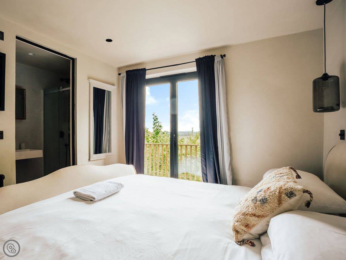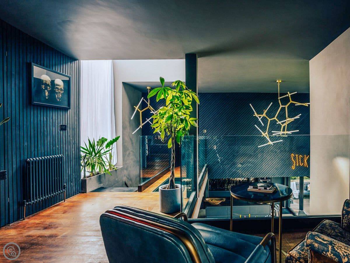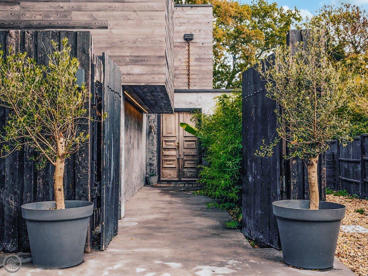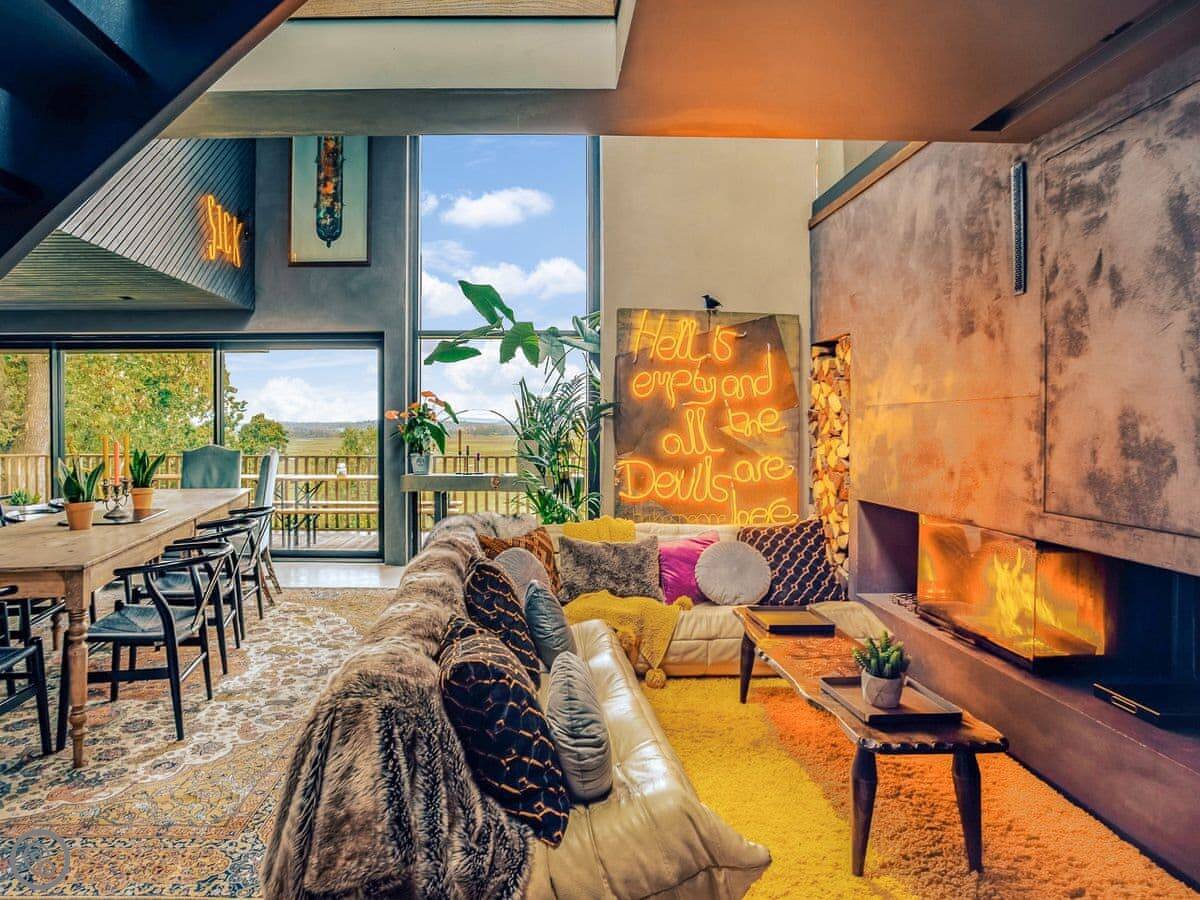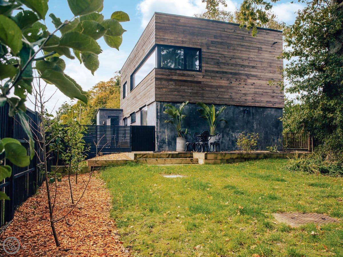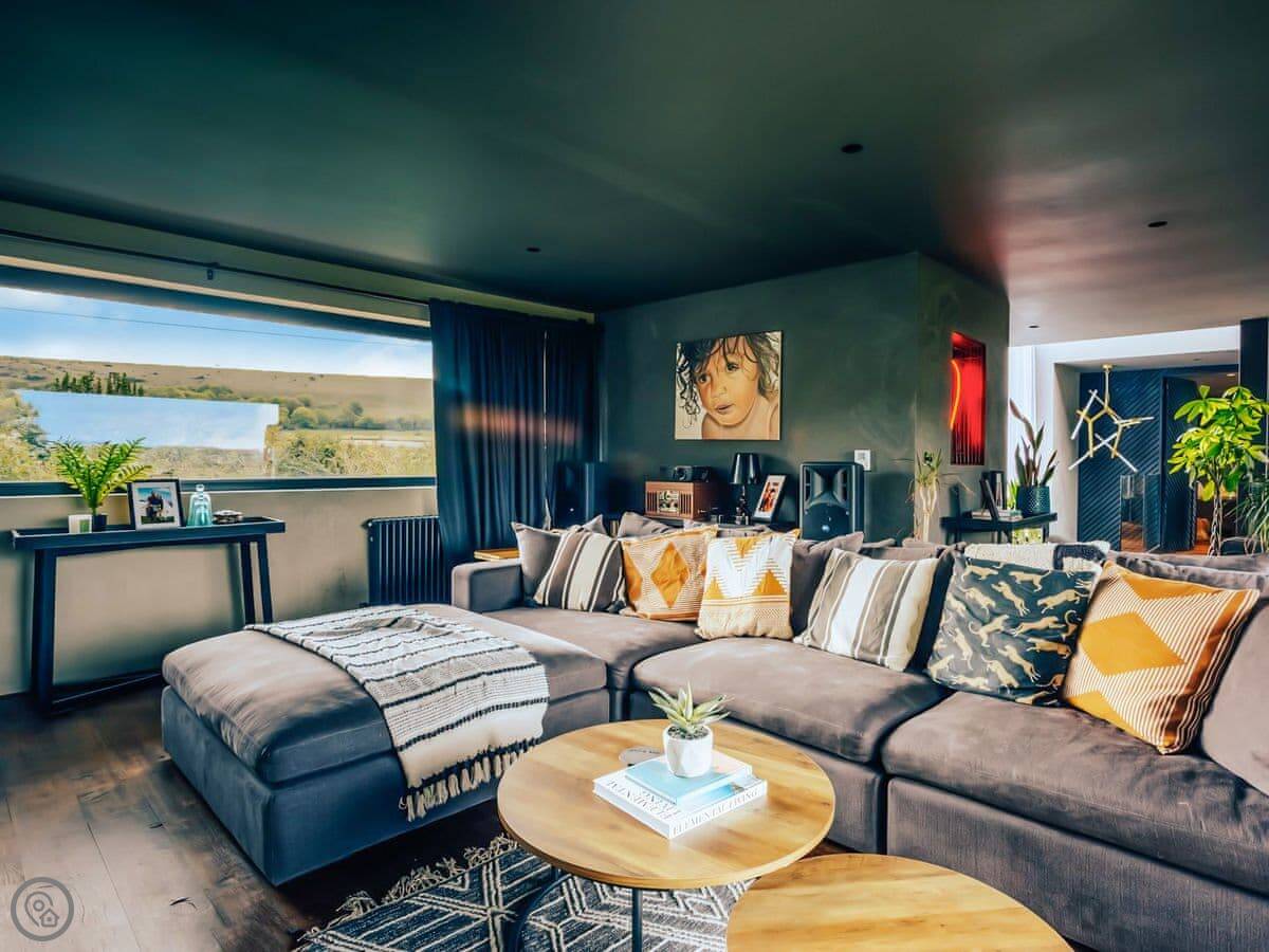 A wonderfully eclectic and playful luxury home in the picturesque village of Amberley, West Sussex. The Rook is a large holiday home sleeping up to 13 guests and offers a wood-fired tub outside, a high end architectural design and stunning views across the Wild Brooks and South Downs. The Rook is as bold in its interior design as it is outside. Clay plaster walls, antiques and contemporary artwork and furnishings adorn the house in a vibrant mix of colours and textures. Through the entrance porch, the cavernous open-plan living space greets you with double-height ceilings and a jaw-dropping panorama across the Amberley Wildbrooks. The kitchen and dining table sit in front of wide doors which lead out onto a long terrace. Heading up the open staircase from the kitchen, the first floor galleried landing is a gloriously spacious, double aspect room with a huge corner sofa, flatscreen TV and a projector. Across the glass floored bridge at the opposite end of the house is the master bedroom suite sleeping four guests. The other three bedrooms are found on the ground floor. Outside, beyond the dining terrace, the sizeable grounds include a secluded, wood-fired tub with sun deck, a large lawn, private bluebell woods with yoga platform and a meditation pod.