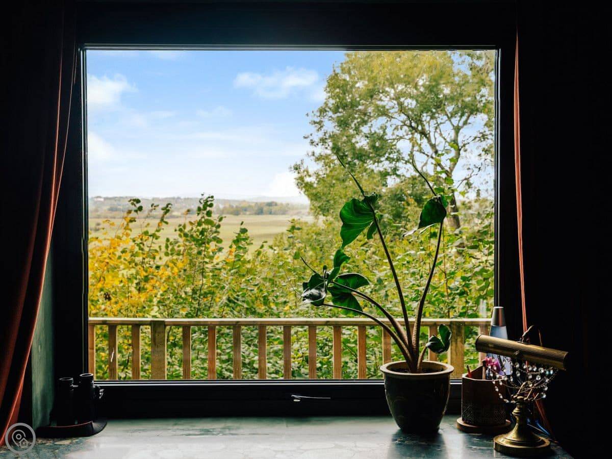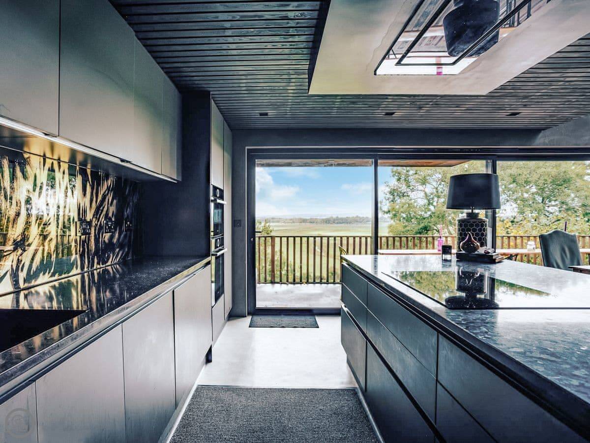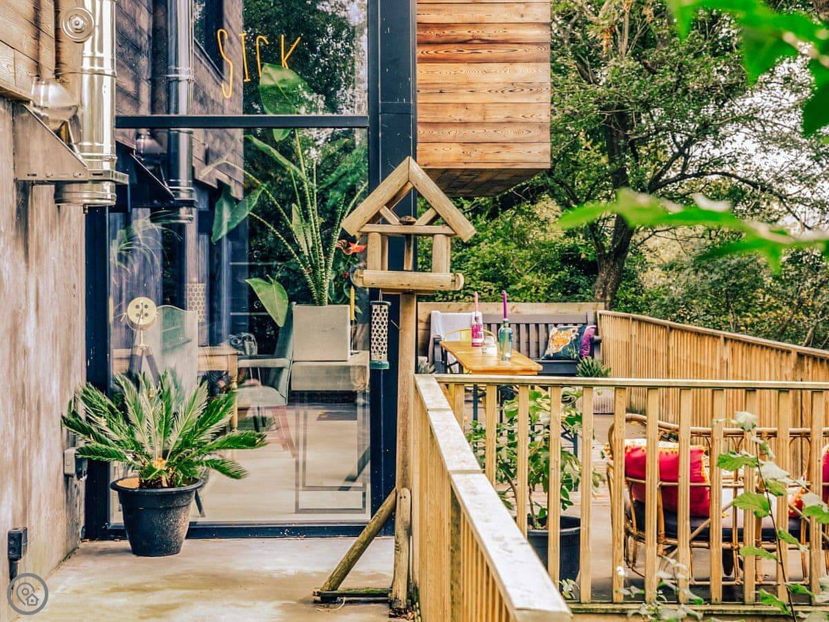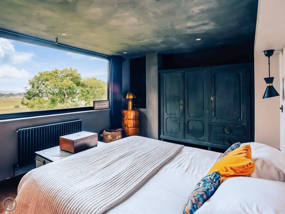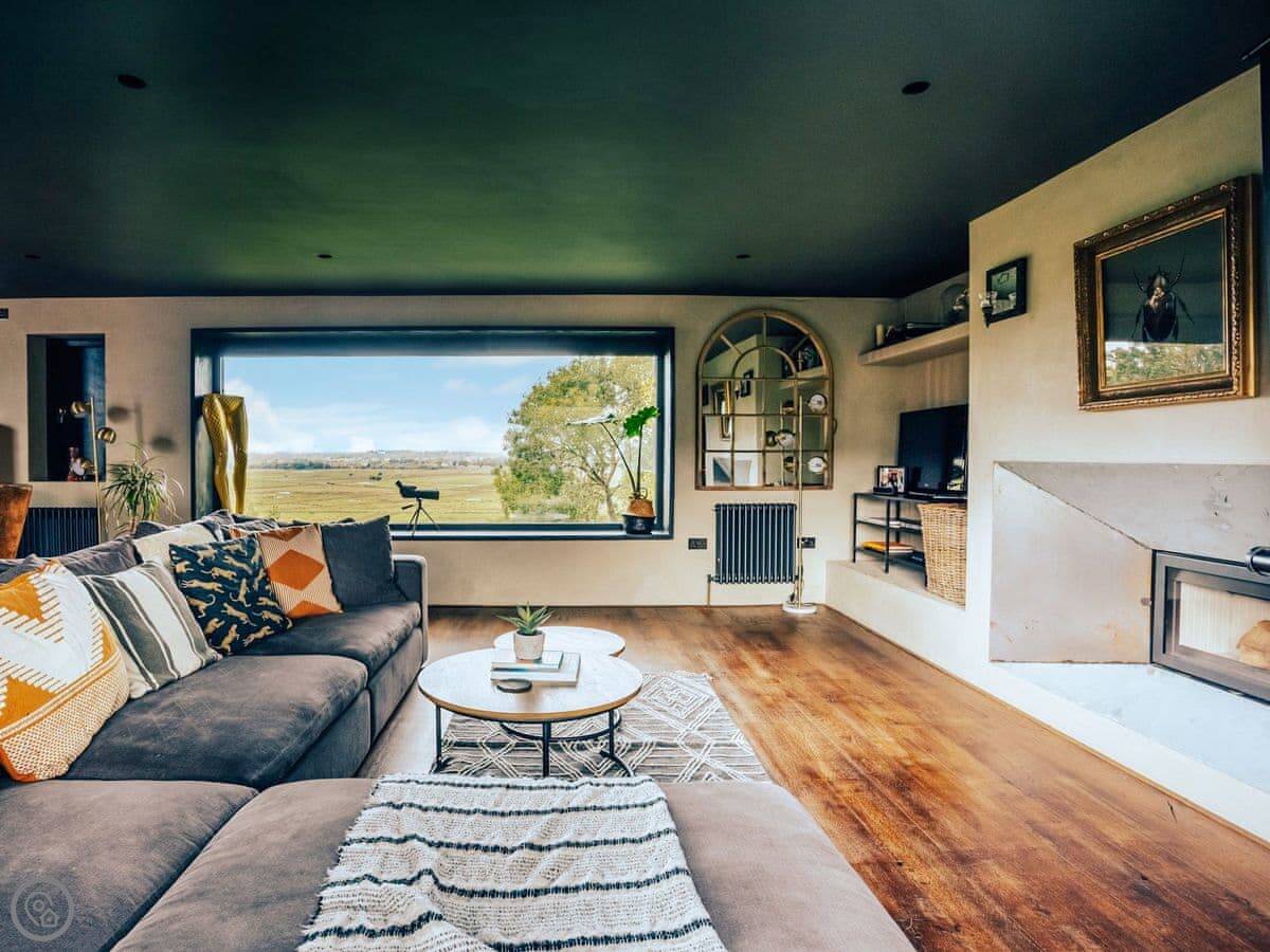 A wonderfully eclectic and playful luxury home in the picturesque village of Amberley, West Sussex. The Rook is a large holiday home sleeping up to 13 guests and offers a wood-fired tub outside, a high end architectural design and stunning views across the Wild Brooks and South Downs. The Rook is as bold in its interior design as it is outside. Clay plaster walls, antiques and contemporary artwork and furnishings adorn the house in a vibrant mix of colours and textures. Through the entrance porch, the cavernous open-plan living space greets you with double-height ceilings and a jaw-dropping panorama across the Amberley Wildbrooks. The kitchen and dining table sit in front of wide doors which lead out onto a long terrace. Heading up the open staircase from the kitchen, the first floor galleried landing is a gloriously spacious, double aspect room with a huge corner sofa, flatscreen TV and a projector. Across the glass floored bridge at the opposite end of the house is the master bedroom suite sleeping four guests. The other three bedrooms are found on the ground floor. Outside, beyond the dining terrace, the sizeable grounds include a secluded, wood-fired tub with sun deck, a large lawn, private bluebell woods with yoga platform and a meditation pod.