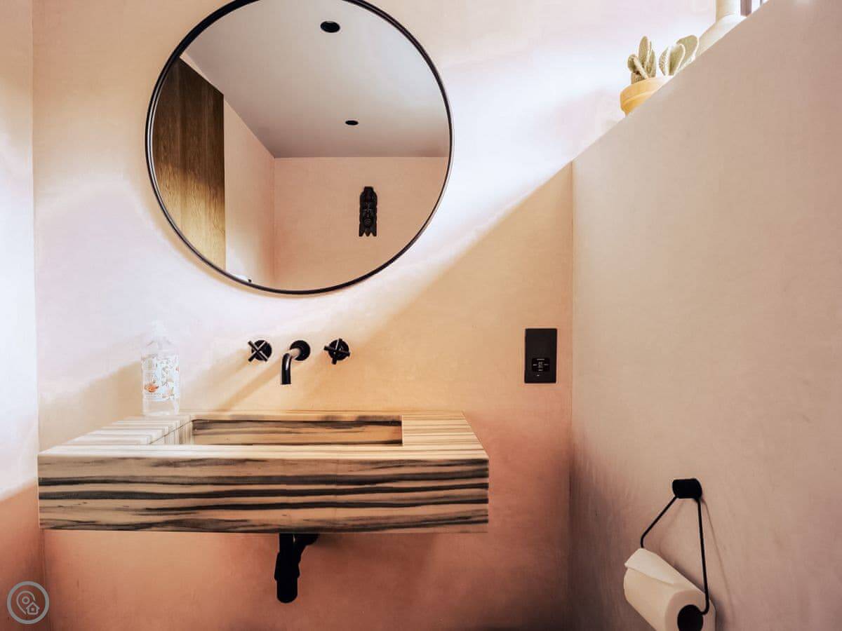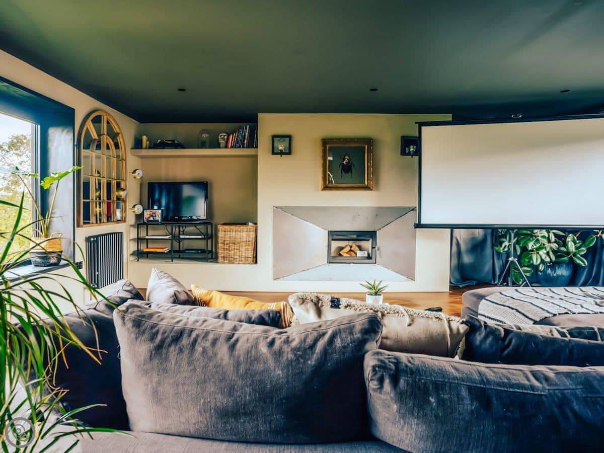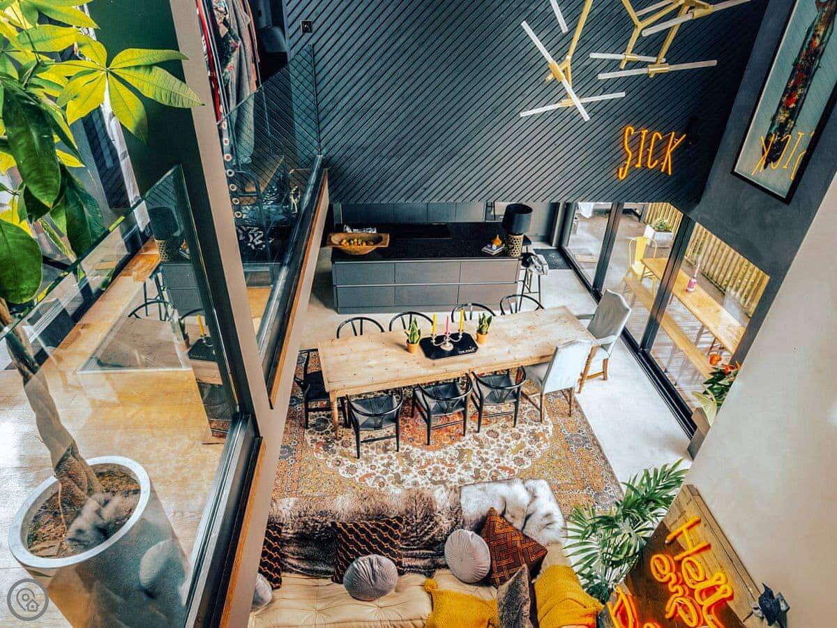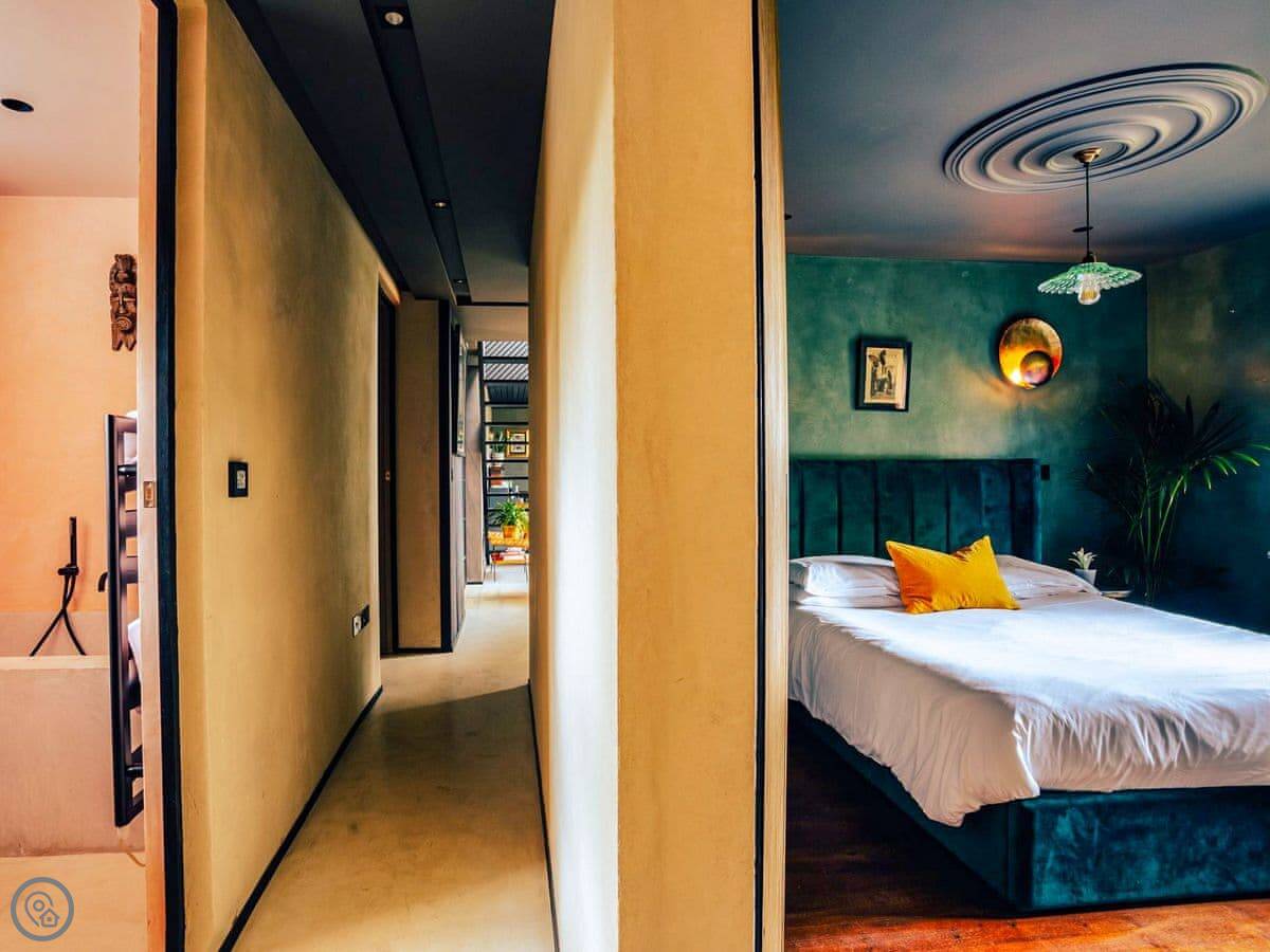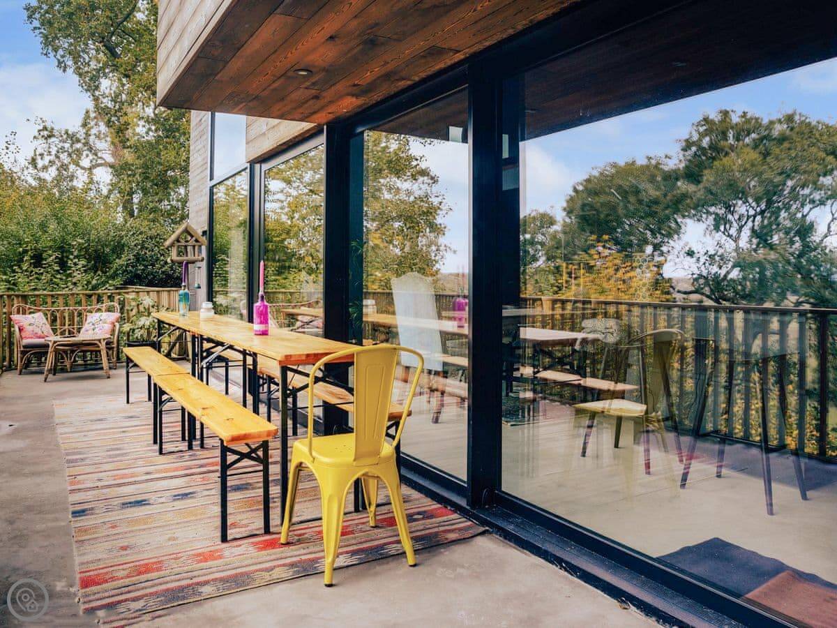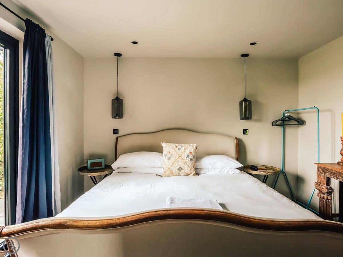 A wonderfully eclectic and playful luxury home in the picturesque village of Amberley, West Sussex. The Rook is a large holiday home sleeping up to 13 guests and offers a wood-fired tub outside, a high end architectural design and stunning views across the Wild Brooks and South Downs. The Rook is as bold in its interior design as it is outside. Clay plaster walls, antiques and contemporary artwork and furnishings adorn the house in a vibrant mix of colours and textures. Through the entrance porch, the cavernous open-plan living space greets you with double-height ceilings and a jaw-dropping panorama across the Amberley Wildbrooks. The kitchen and dining table sit in front of wide doors which lead out onto a long terrace. Heading up the open staircase from the kitchen, the first floor galleried landing is a gloriously spacious, double aspect room with a huge corner sofa, flatscreen TV and a projector. Across the glass floored bridge at the opposite end of the house is the master bedroom suite sleeping four guests. The other three bedrooms are found on the ground floor. Outside, beyond the dining terrace, the sizeable grounds include a secluded, wood-fired tub with sun deck, a large lawn, private bluebell woods with yoga platform and a meditation pod.