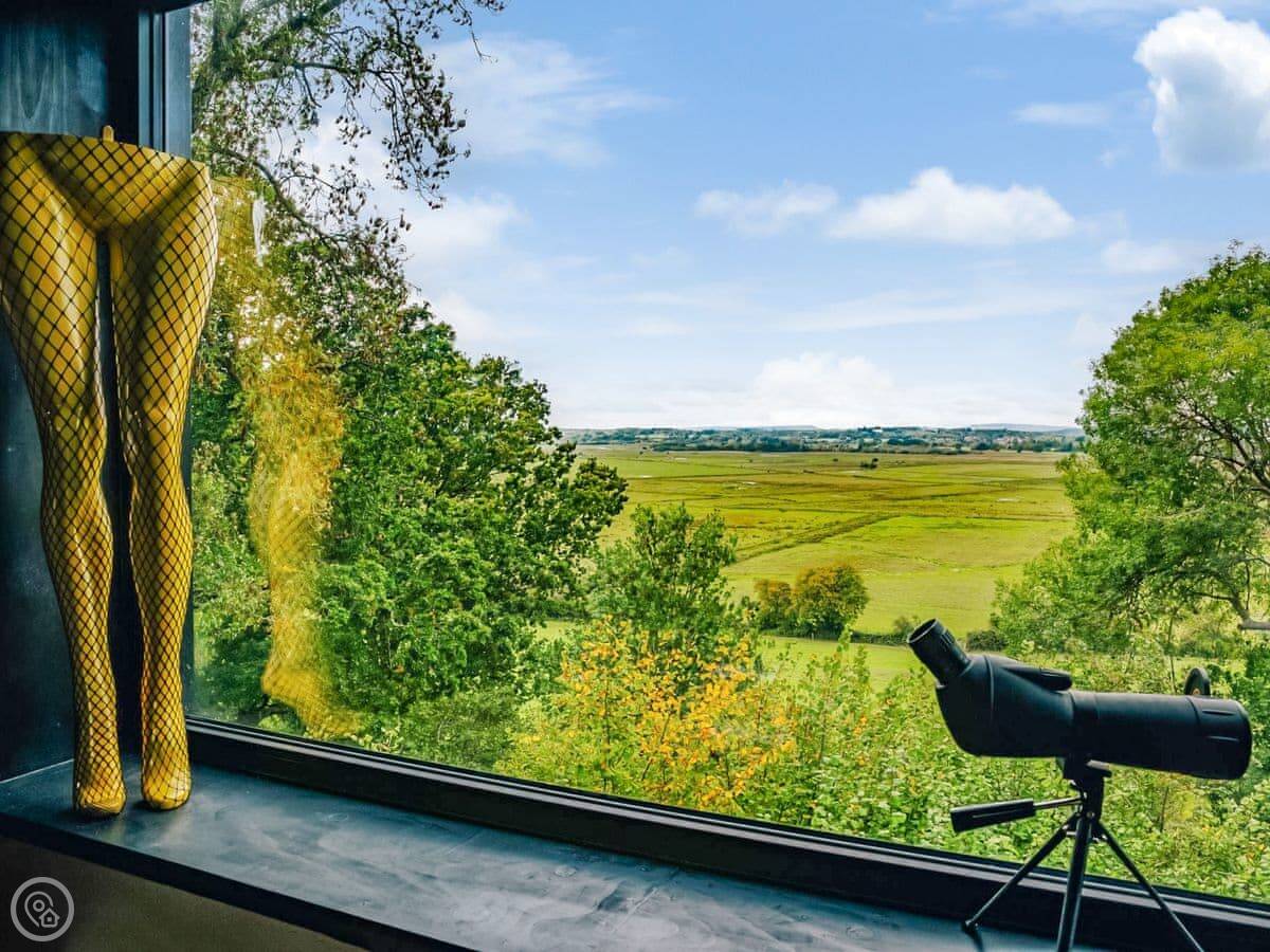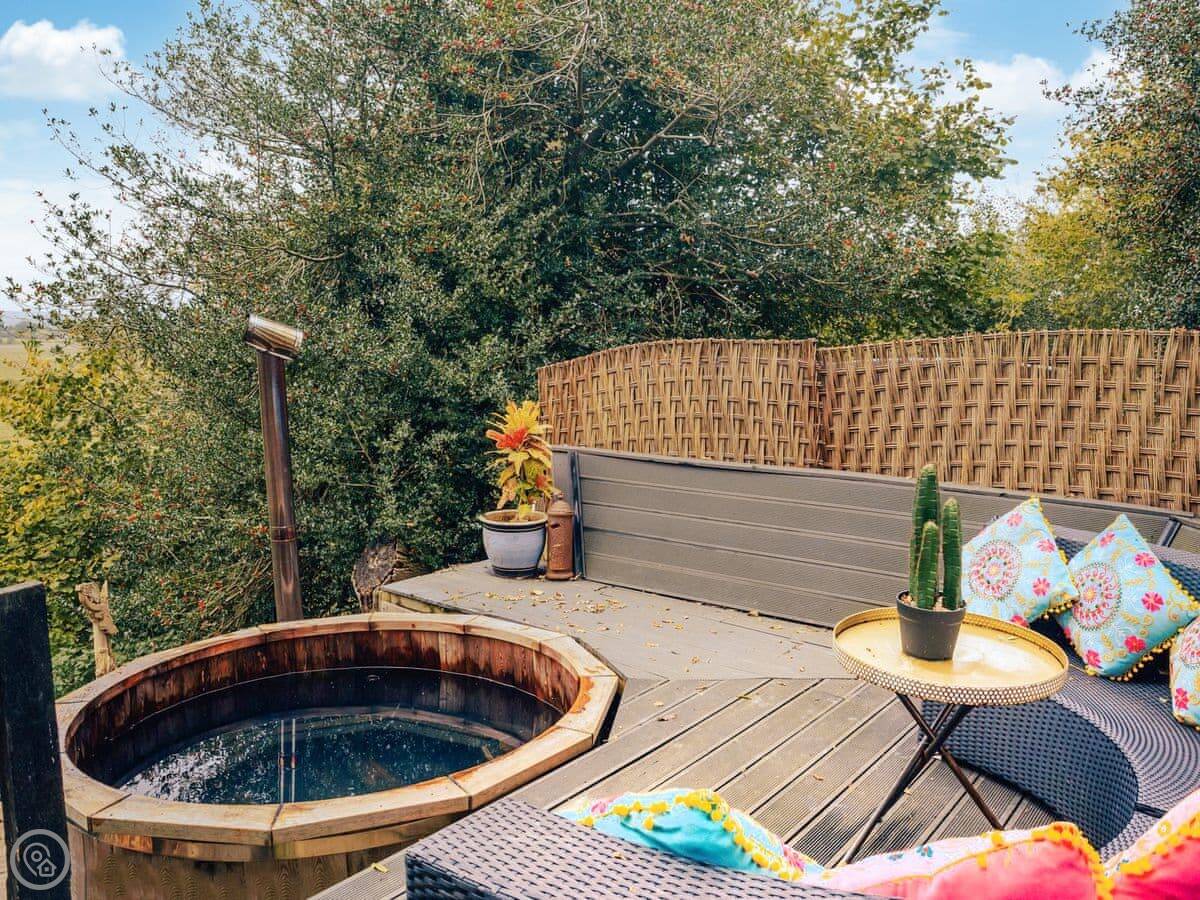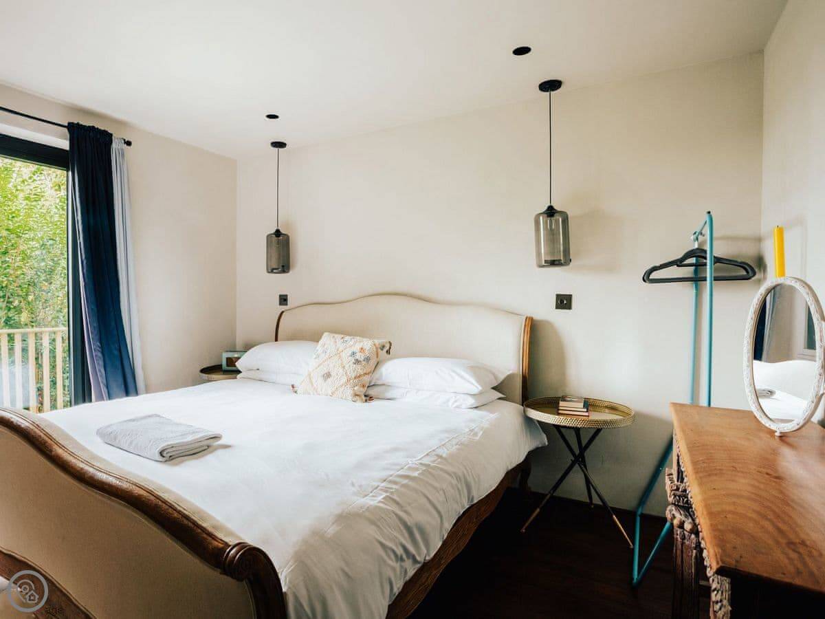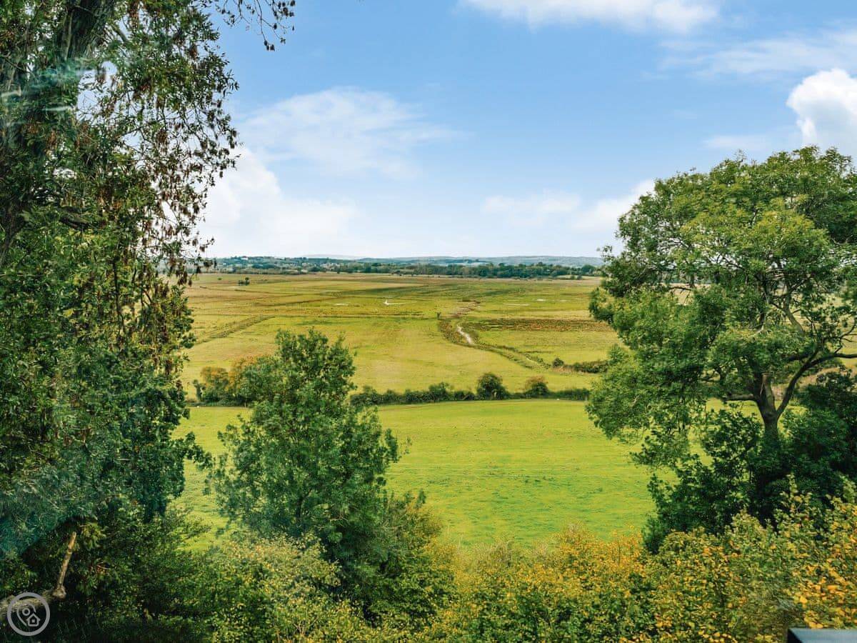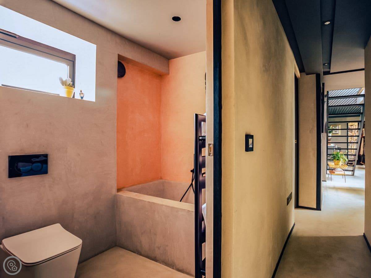 A wonderfully eclectic and playful luxury home in the picturesque village of Amberley, West Sussex. The Rook is a large holiday home sleeping up to 13 guests and offers a wood-fired tub outside, a high end architectural design and stunning views across the Wild Brooks and South Downs. The Rook is as bold in its interior design as it is outside. Clay plaster walls, antiques and contemporary artwork and furnishings adorn the house in a vibrant mix of colours and textures. Through the entrance porch, the cavernous open-plan living space greets you with double-height ceilings and a jaw-dropping panorama across the Amberley Wildbrooks. The kitchen and dining table sit in front of wide doors which lead out onto a long terrace. Heading up the open staircase from the kitchen, the first floor galleried landing is a gloriously spacious, double aspect room with a huge corner sofa, flatscreen TV and a projector. Across the glass floored bridge at the opposite end of the house is the master bedroom suite sleeping four guests. The other three bedrooms are found on the ground floor. Outside, beyond the dining terrace, the sizeable grounds include a secluded, wood-fired tub with sun deck, a large lawn, private bluebell woods with yoga platform and a meditation pod.