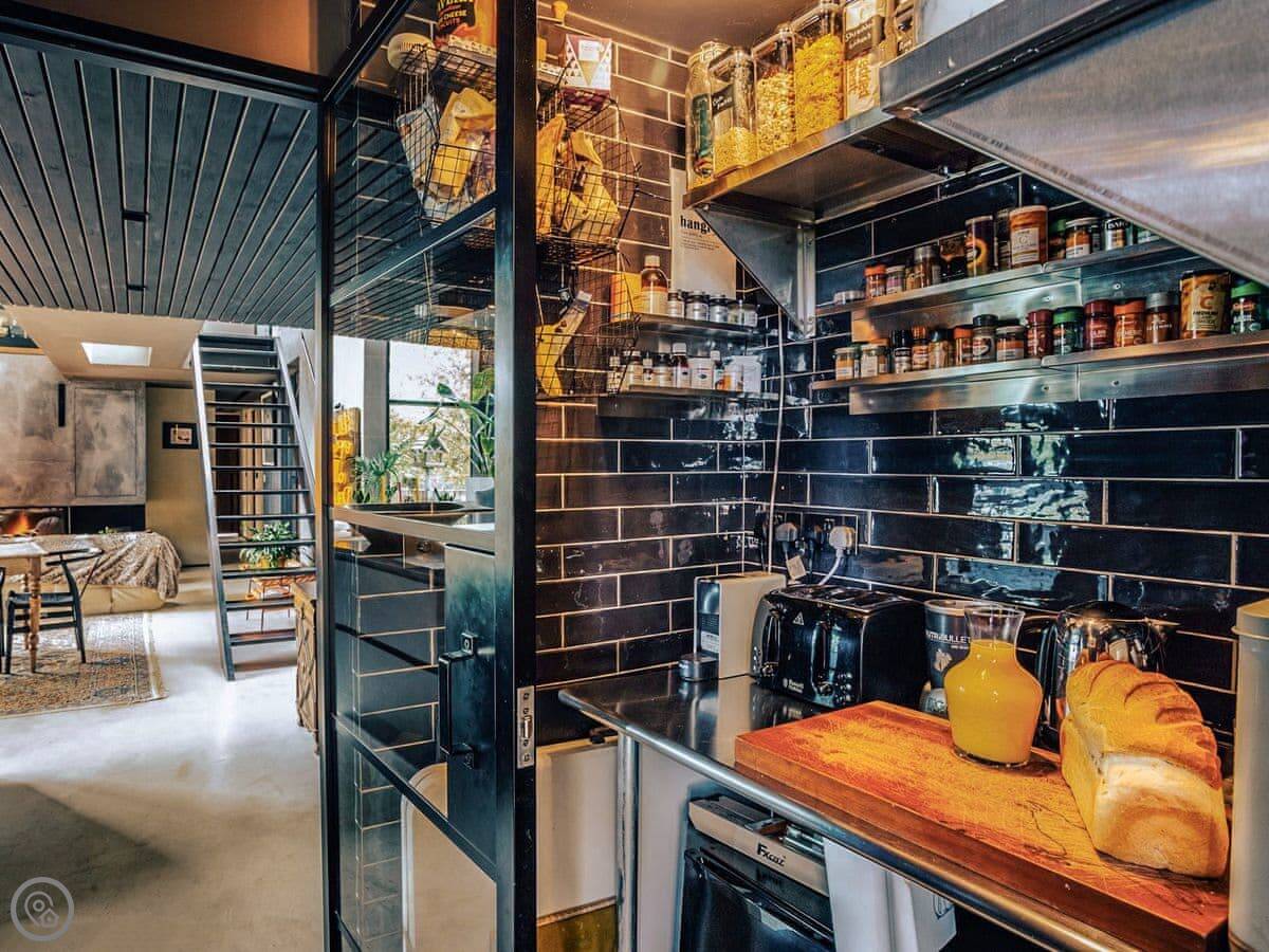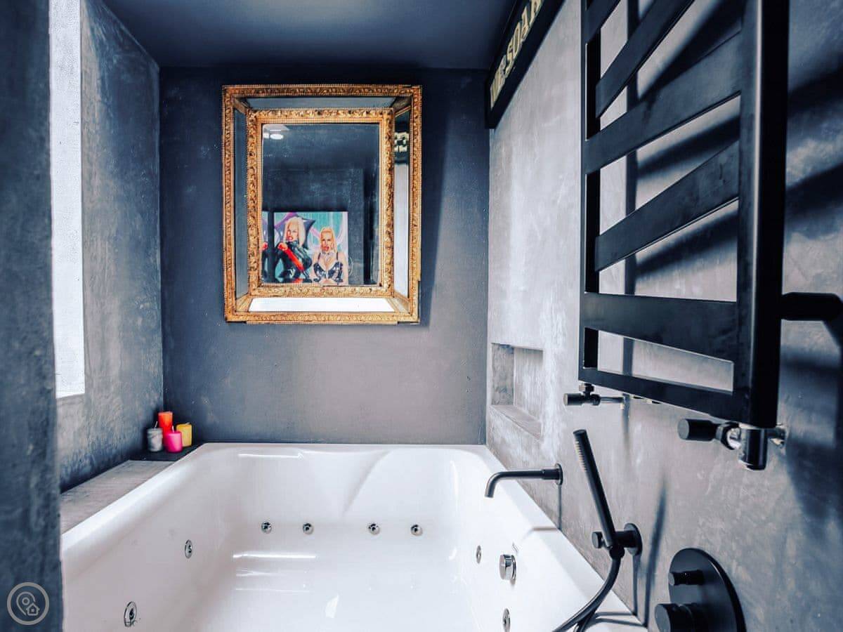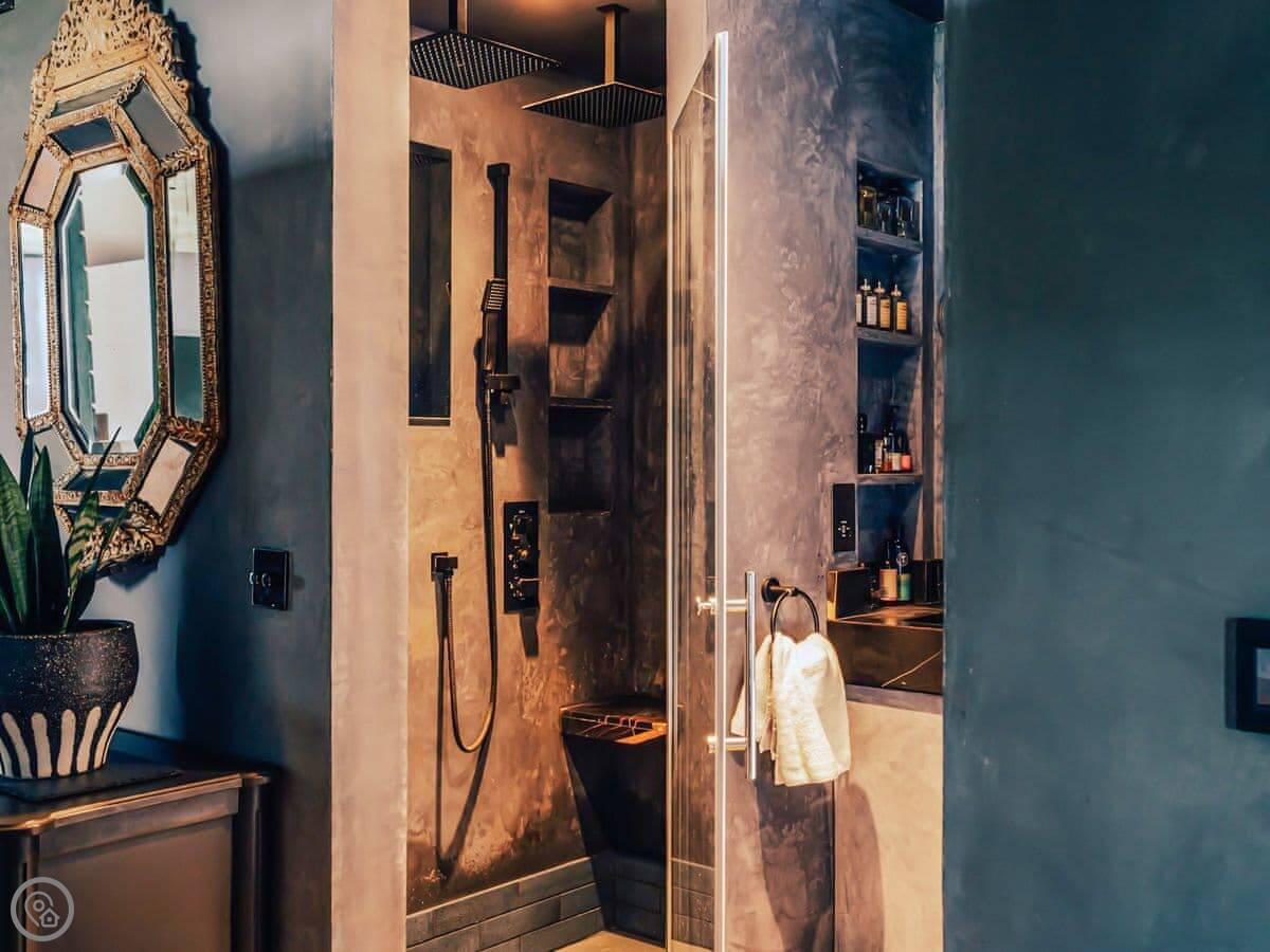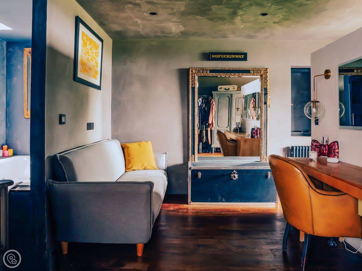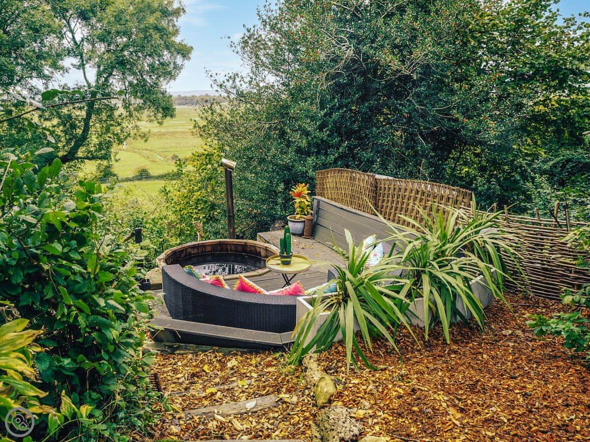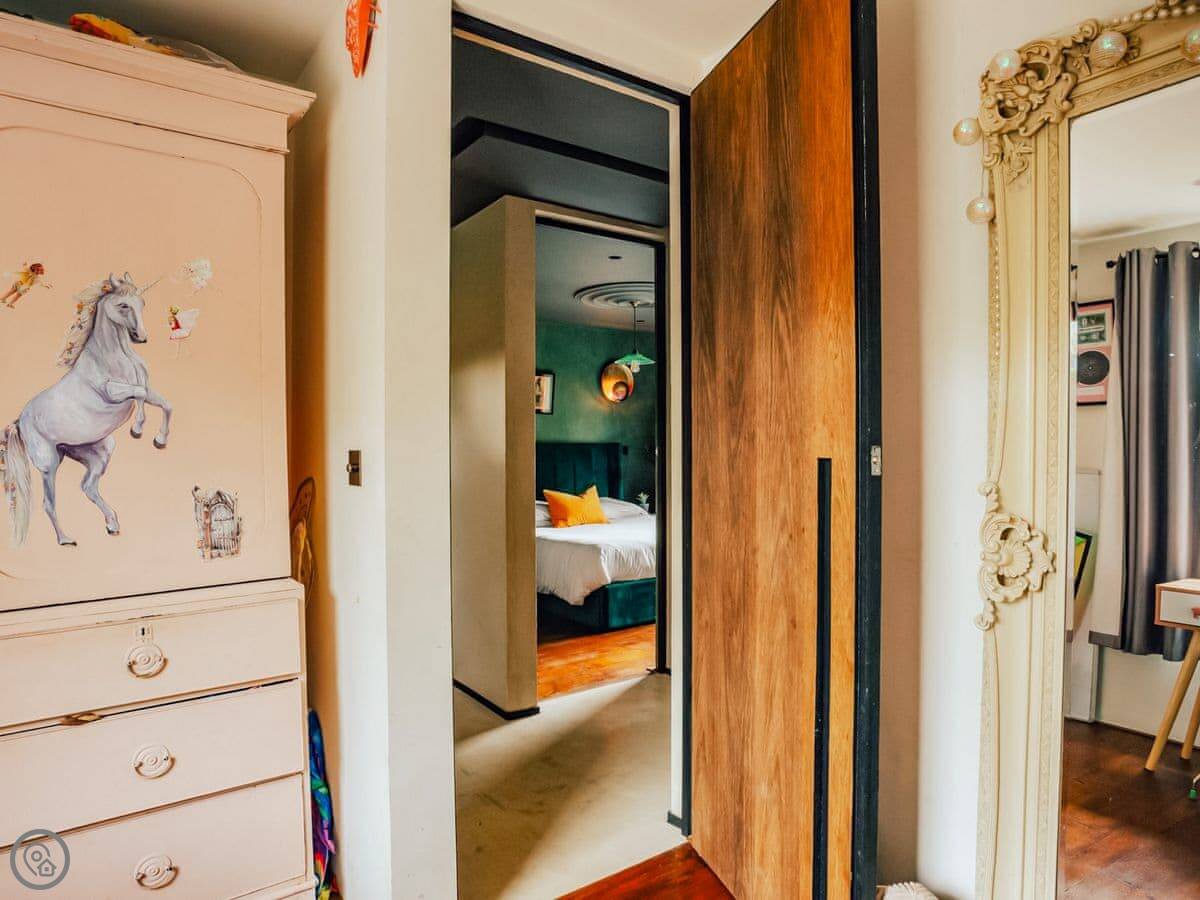 A wonderfully eclectic and playful luxury home in the picturesque village of Amberley, West Sussex. The Rook is a large holiday home sleeping up to 13 guests and offers a wood-fired tub outside, a high end architectural design and stunning views across the Wild Brooks and South Downs. The Rook is as bold in its interior design as it is outside. Clay plaster walls, antiques and contemporary artwork and furnishings adorn the house in a vibrant mix of colours and textures. Through the entrance porch, the cavernous open-plan living space greets you with double-height ceilings and a jaw-dropping panorama across the Amberley Wildbrooks. The kitchen and dining table sit in front of wide doors which lead out onto a long terrace. Heading up the open staircase from the kitchen, the first floor galleried landing is a gloriously spacious, double aspect room with a huge corner sofa, flatscreen TV and a projector. Across the glass floored bridge at the opposite end of the house is the master bedroom suite sleeping four guests. The other three bedrooms are found on the ground floor. Outside, beyond the dining terrace, the sizeable grounds include a secluded, wood-fired tub with sun deck, a large lawn, private bluebell woods with yoga platform and a meditation pod.