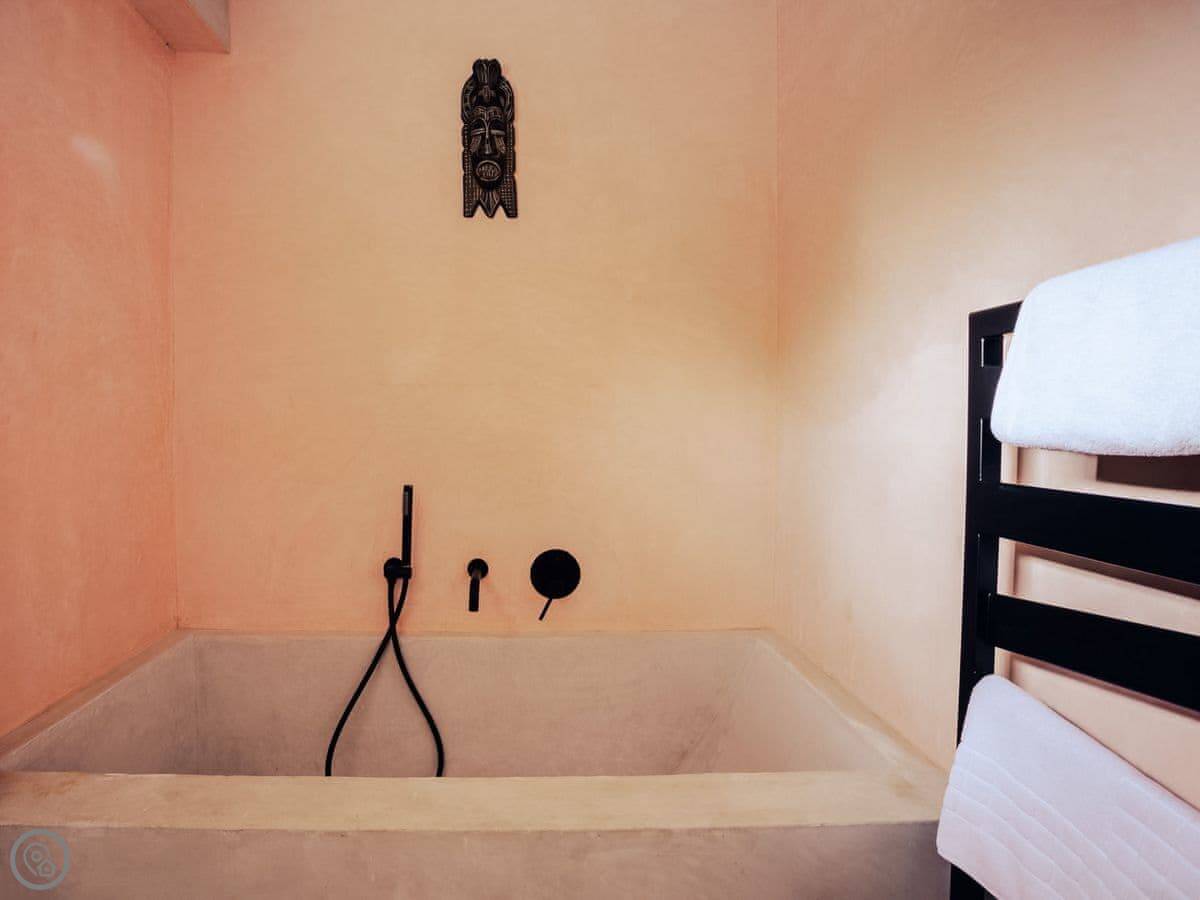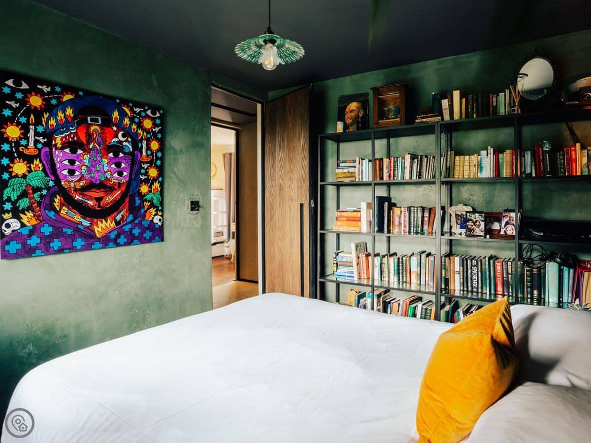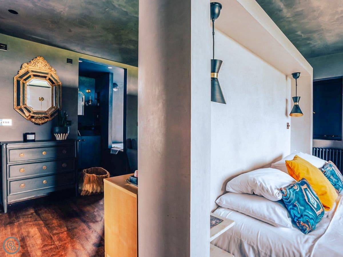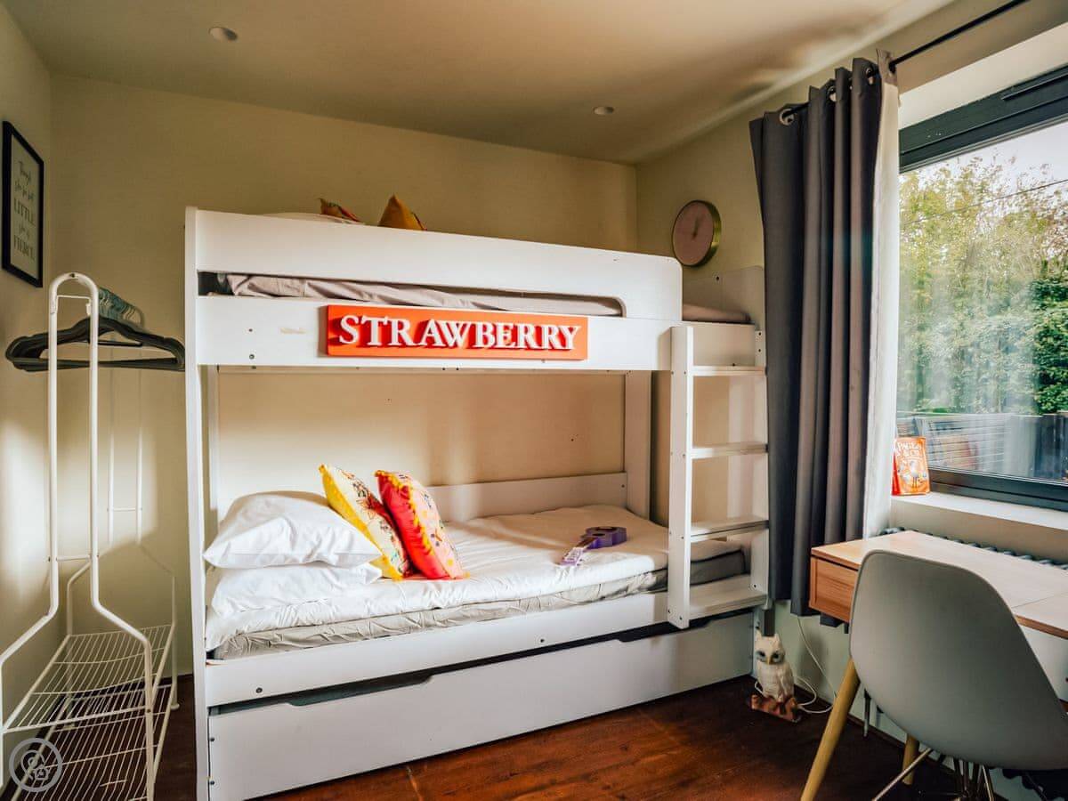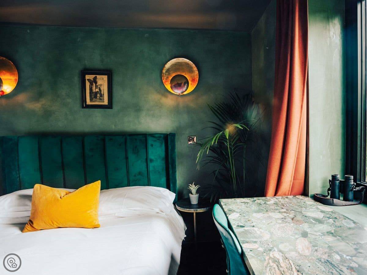 A wonderfully eclectic and playful luxury home in the picturesque village of Amberley, West Sussex. The Rook is a large holiday home sleeping up to 13 guests and offers a wood-fired tub outside, a high end architectural design and stunning views across the Wild Brooks and South Downs. The Rook is as bold in its interior design as it is outside. Clay plaster walls, antiques and contemporary artwork and furnishings adorn the house in a vibrant mix of colours and textures. Through the entrance porch, the cavernous open-plan living space greets you with double-height ceilings and a jaw-dropping panorama across the Amberley Wildbrooks. The kitchen and dining table sit in front of wide doors which lead out onto a long terrace. Heading up the open staircase from the kitchen, the first floor galleried landing is a gloriously spacious, double aspect room with a huge corner sofa, flatscreen TV and a projector. Across the glass floored bridge at the opposite end of the house is the master bedroom suite sleeping four guests. The other three bedrooms are found on the ground floor. Outside, beyond the dining terrace, the sizeable grounds include a secluded, wood-fired tub with sun deck, a large lawn, private bluebell woods with yoga platform and a meditation pod.