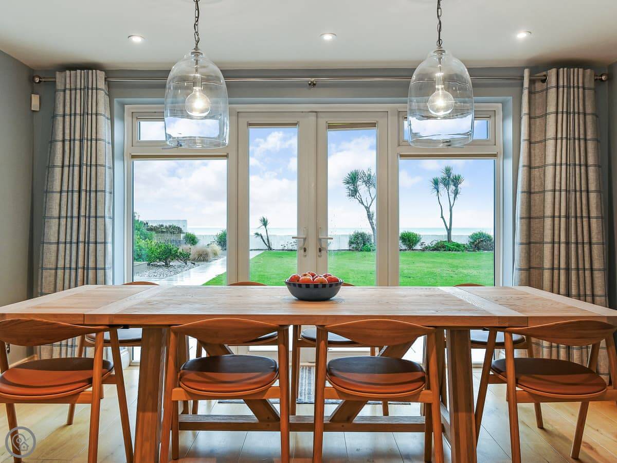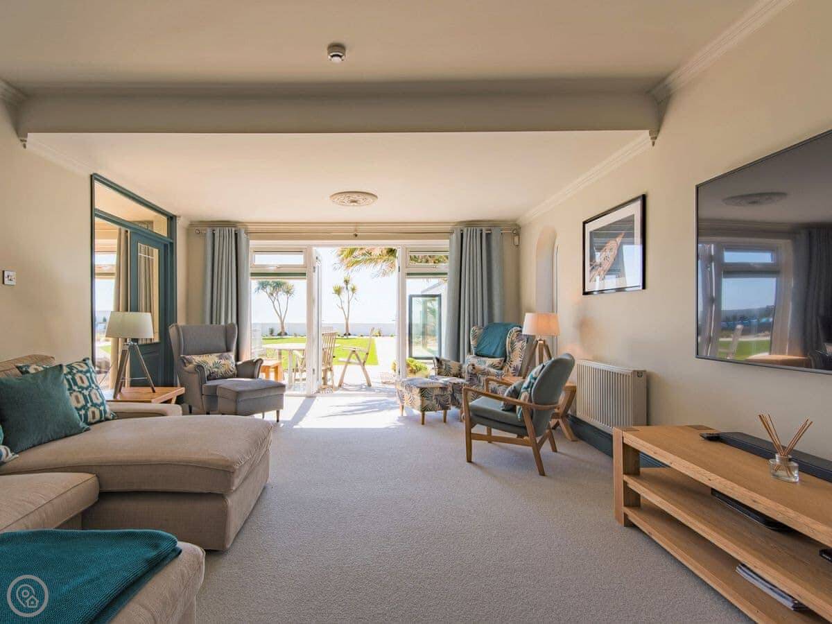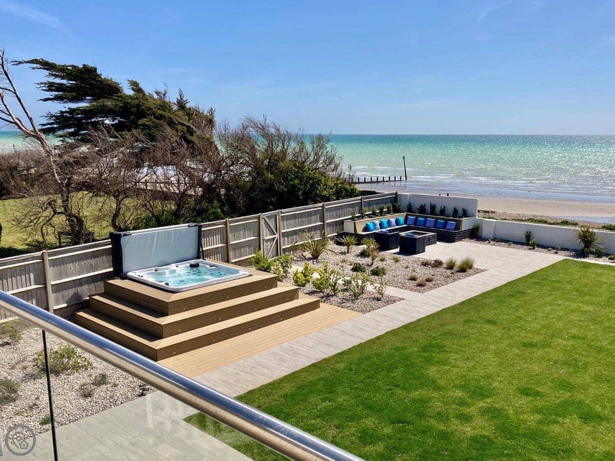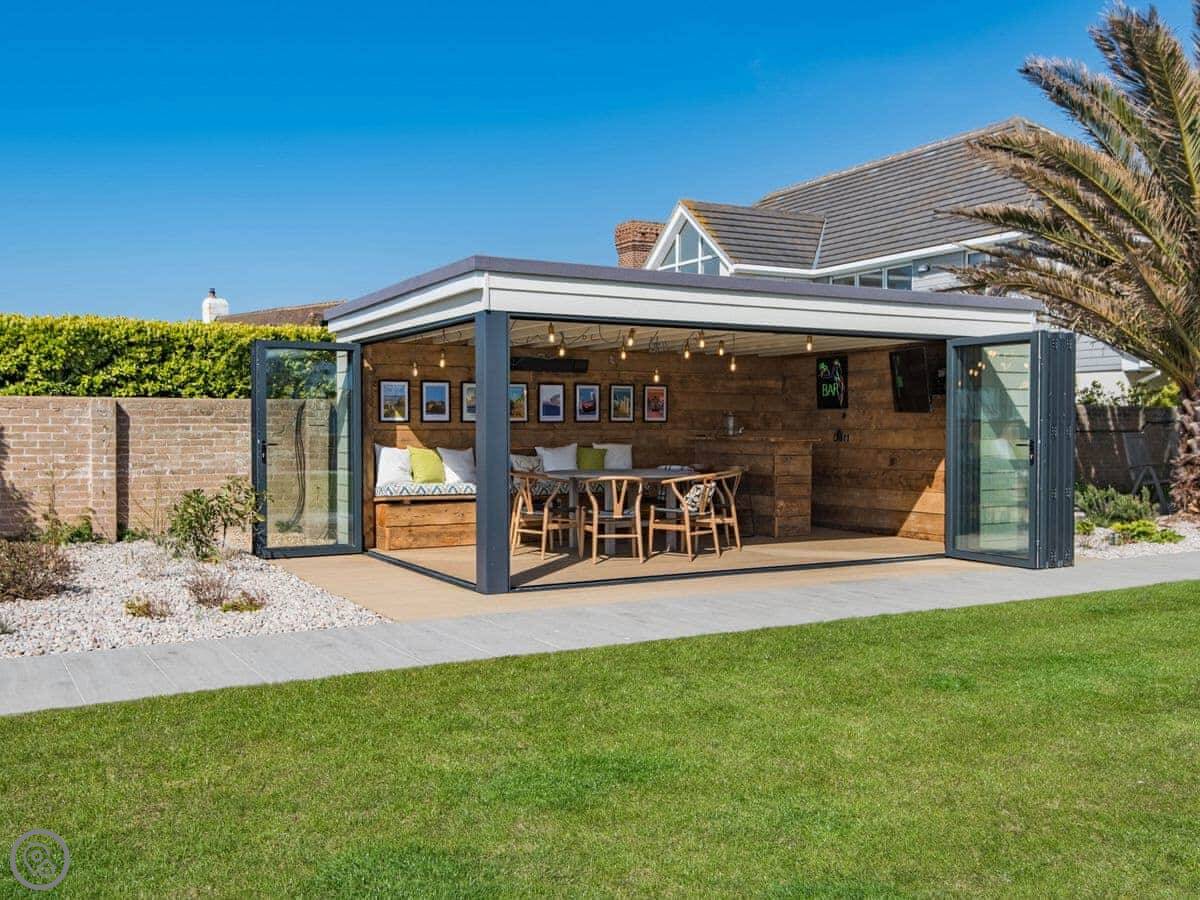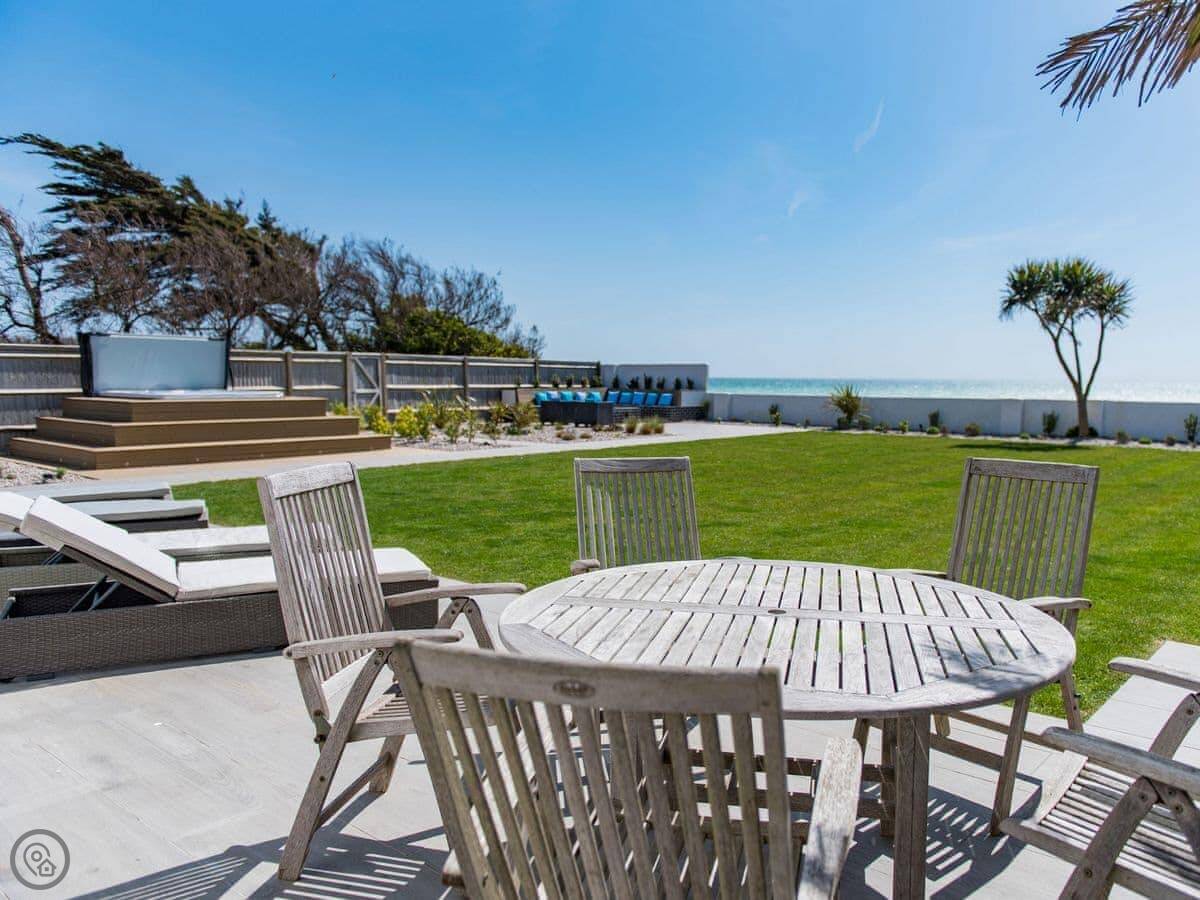 The garden is huge and it's the main thing. There's a summerhouse you can open up, a hot tub that looks out to sea, and a fire pit area right by the beach wall. There's even an outdoor shower to rinse the sand off. Inside, the rooms are large. There's a main living room with a wood burner, a separate dining room, and another snug they call the Whisky Room. The kitchen is very well-equipped.