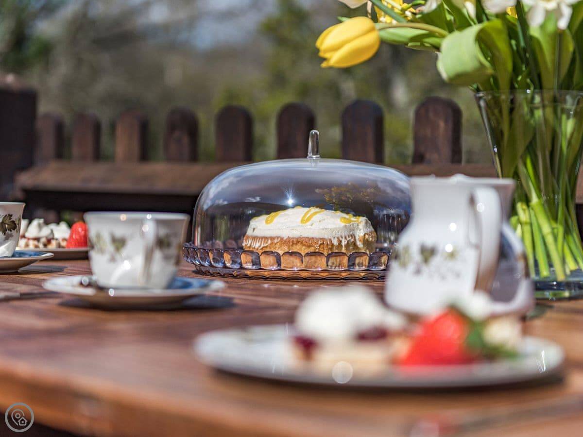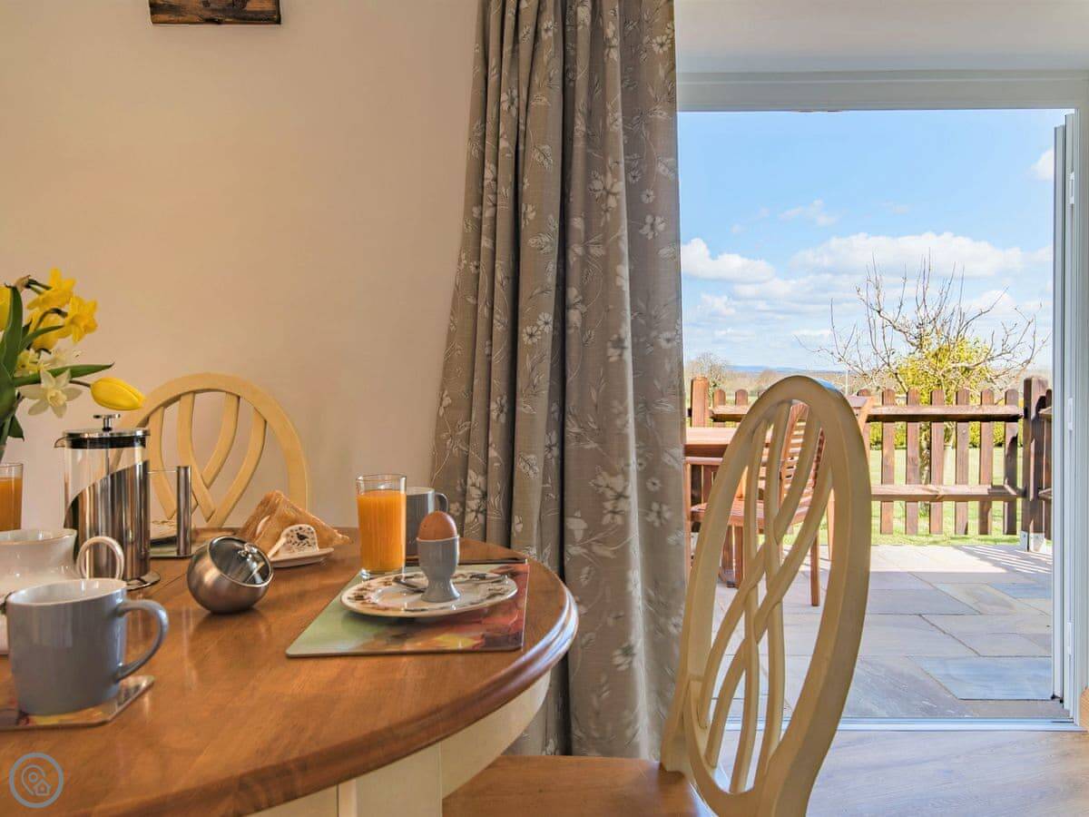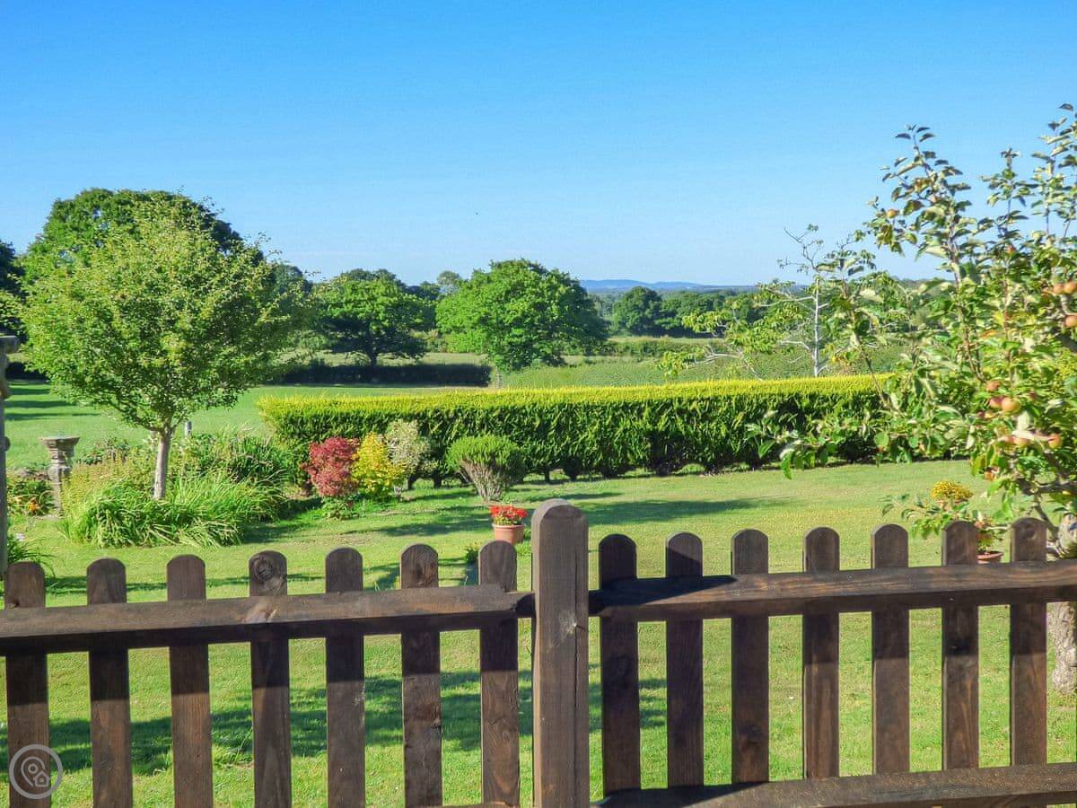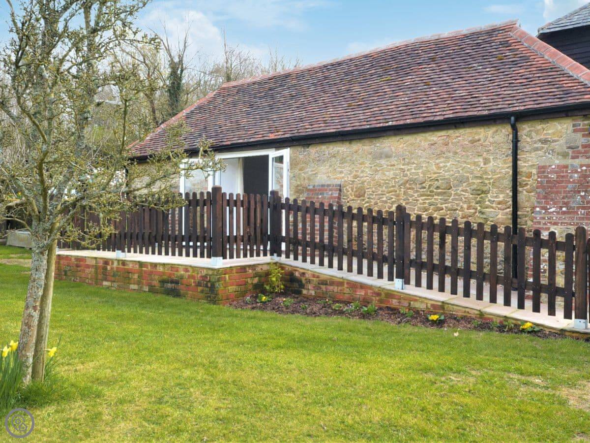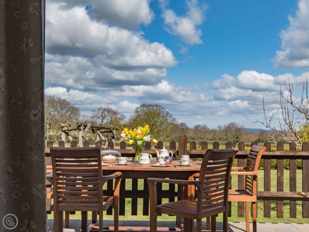 Outside, there's a terrace with a table and an enclosed courtyard area. The whole outside space is fenced, which is handy if you have children. The path around the cottage is gently sloping.