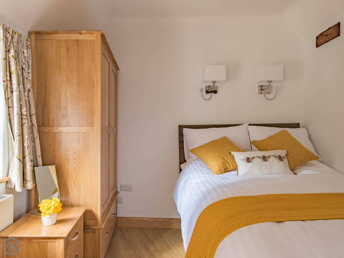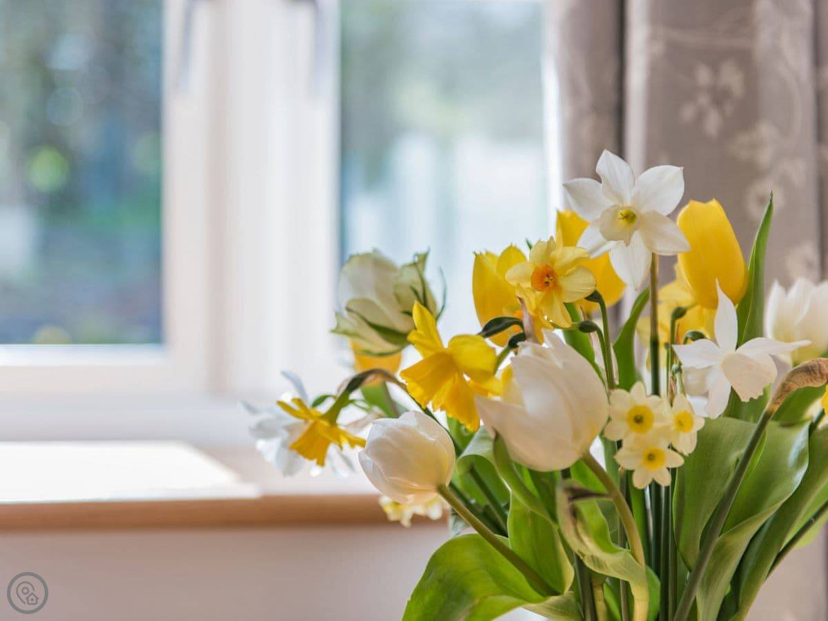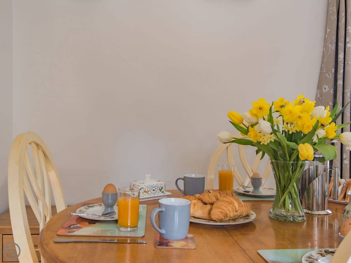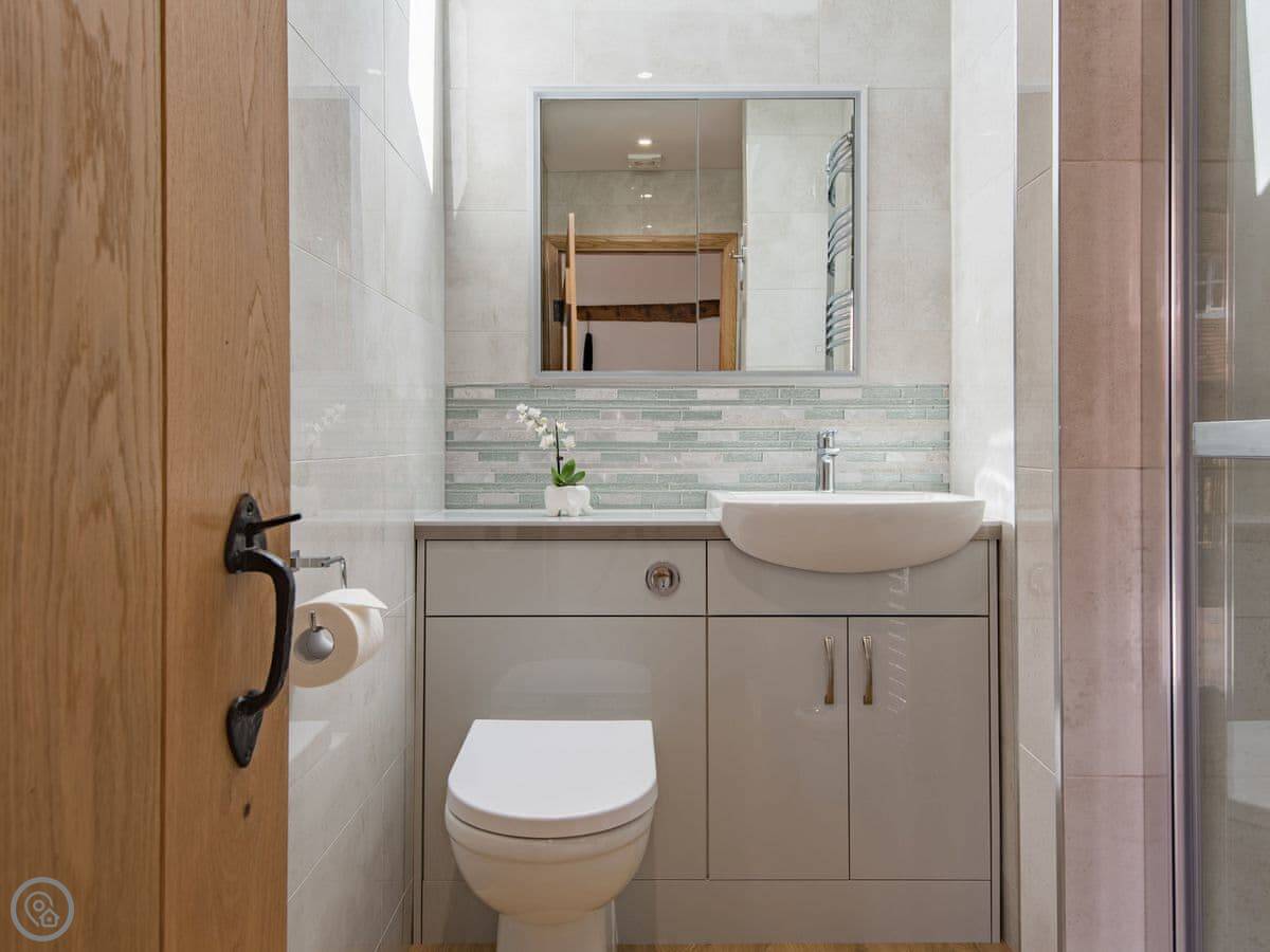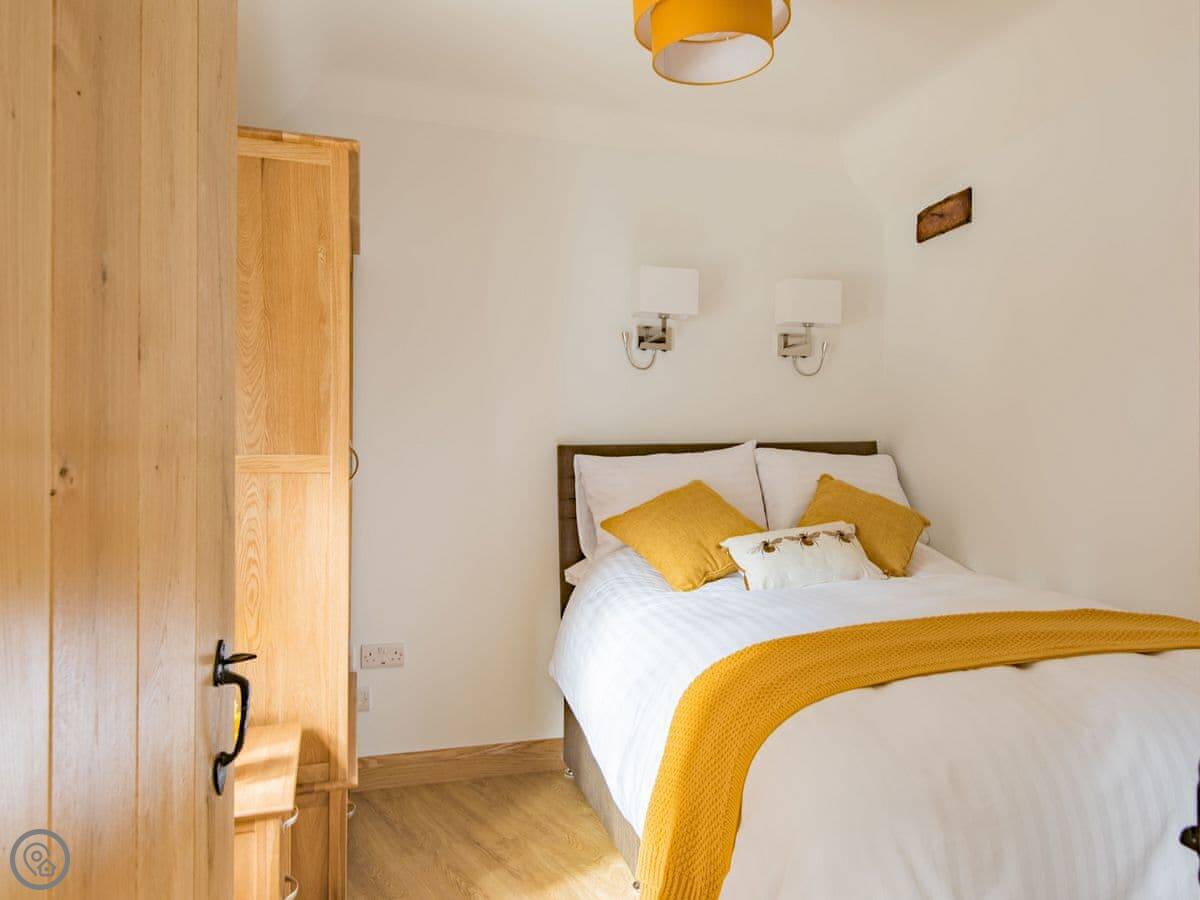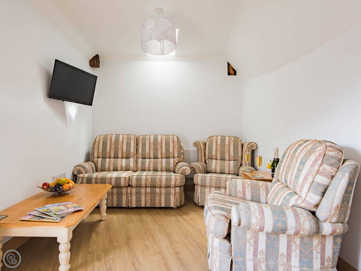 Outside, there's a terrace with a table and an enclosed courtyard area. The whole outside space is fenced, which is handy if you have children. The path around the cottage is gently sloping.